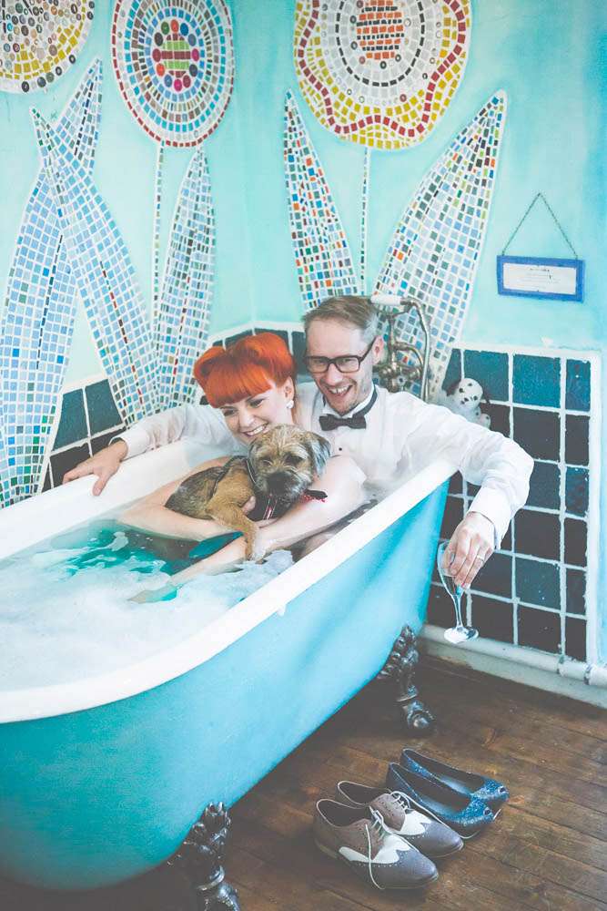 When wedding photographer Michael of My Beautiful Bride told me that Craig and Melanie were one of his most adventurous couples yet, I took it with a pinch of salt. But then I saw their wedding day portraits where they got into a bath of water – fully clothed – with their dog! Not that’s something you don’t see everyday. If, like Melanie, you’re not bothered about keeping your wedding dress pristine, you totally need to do something like this. How fun!