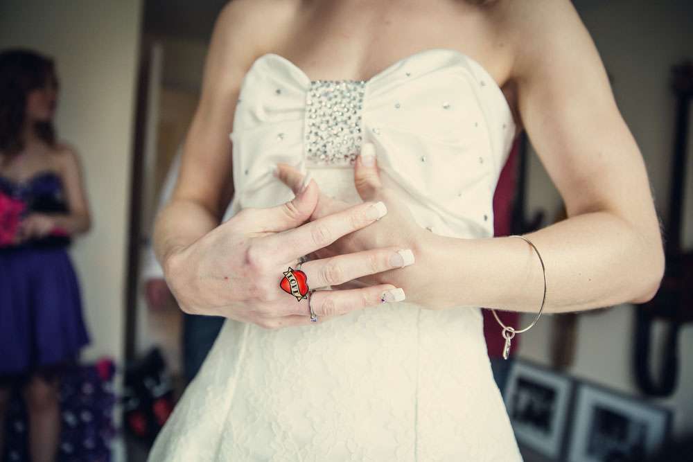 “Having already been married once, and already done the traditional long white dress, I knew, this time around, I wanted a short one. I live in short skirts and high heels, everyone knows my obsession with them, and I totally wanted my wedding dress to reflect that. It was made by a fabulous independent British designer called Kevan Jon. I also had a special Welsh flag garter hand made for me by Rachel at REM Designs and I carried a rockabilly tattoo themed bowling bag from Rock n Rouge. My custom ‘true love’ fascinator was made by the very lovely and very talented Diablo Jo.”