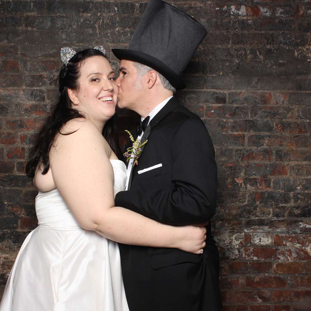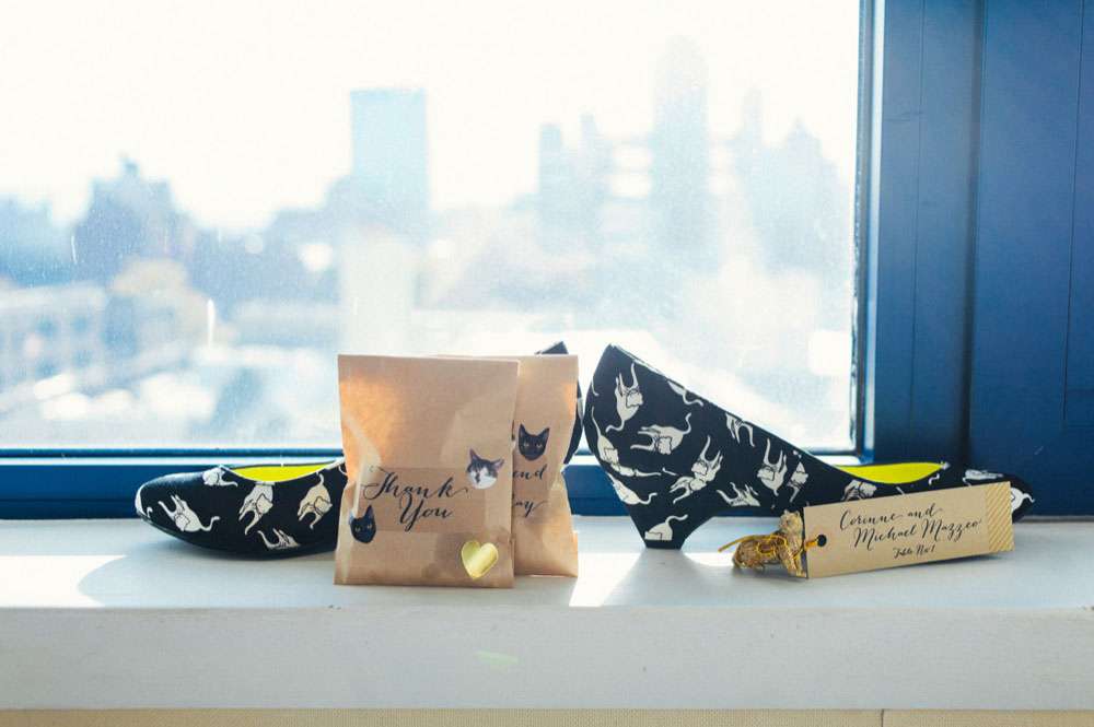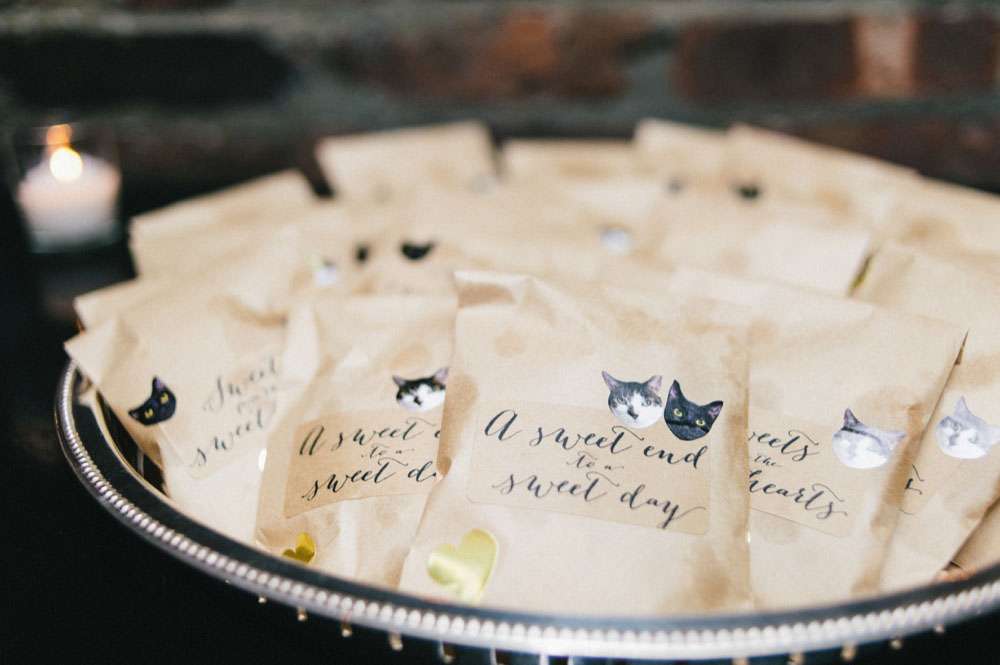 “The cat theme came about because we wanted our two cats to be present in some way, and we looked for ways to incorporate small references to them. Each cocktail was named for a cat, custom kitty face stickers were on all the favor packages, and the sparkly cat ears worn by the bride (from the Rock n Roll Bride for Crown and Glory collection of course!) was a really fun touch.”