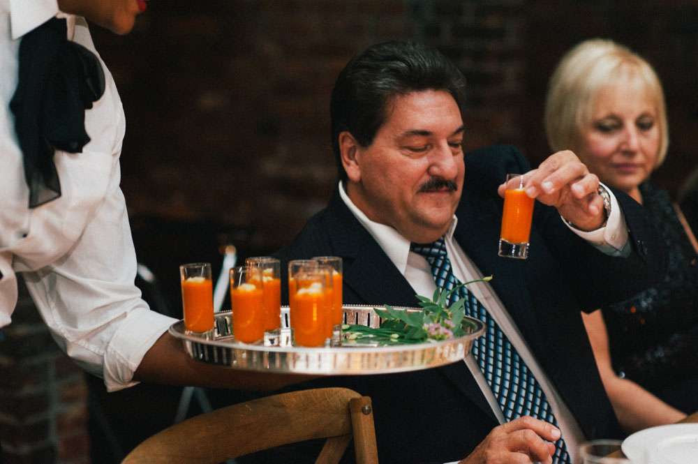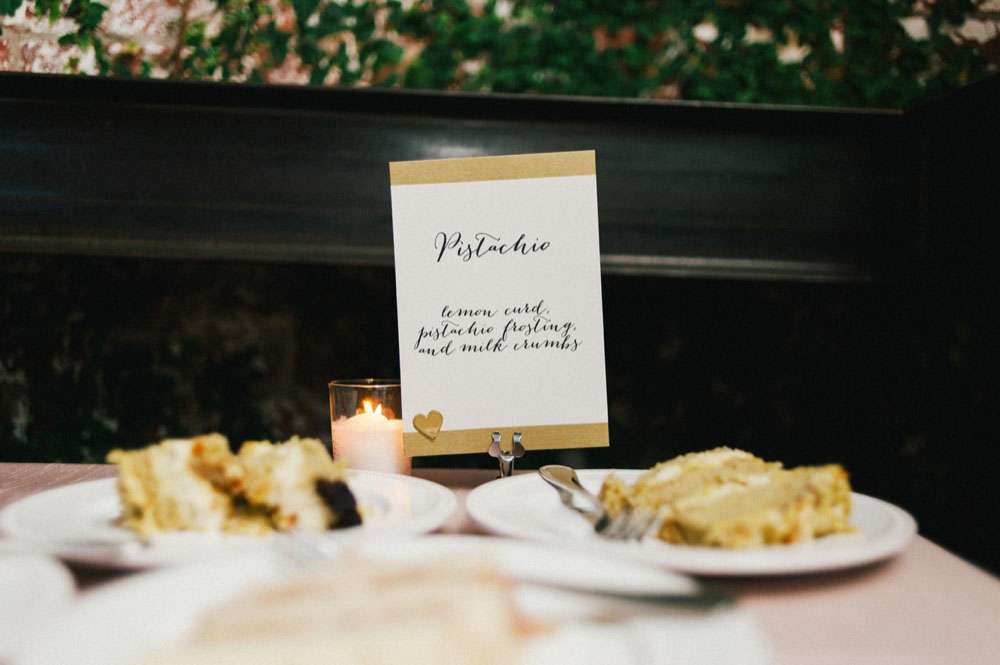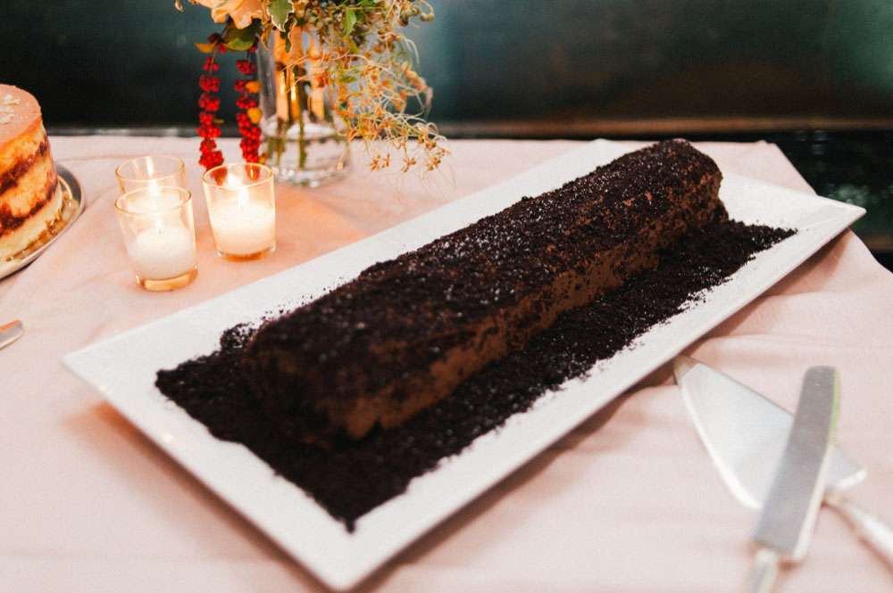 “The majority of the bill was catering. We did welcome drinks, and champagne right after the ceremony, and a cocktail hour and family-style dinner with some really fantastic seasonal food. We didn’t want to do a hors d’oeuvres-only wedding, because the older contingent of family would have been very put off by it. Our caterer recommended a family-style dinner, both because it reduces staffing costs and because it’s a bit more social than some buffets – it gets people talking and passing platters. The caterer, Laura DeRemer from Radish NYC, was so amazing and filled in the gap where I would have needed a wedding planner. She helped with scheduling and planning, and even arranged for a vegan Yodel™-type Groom’s Cake for guests with allergies (and a lactose-intolerant groom), so everyone could partake.”