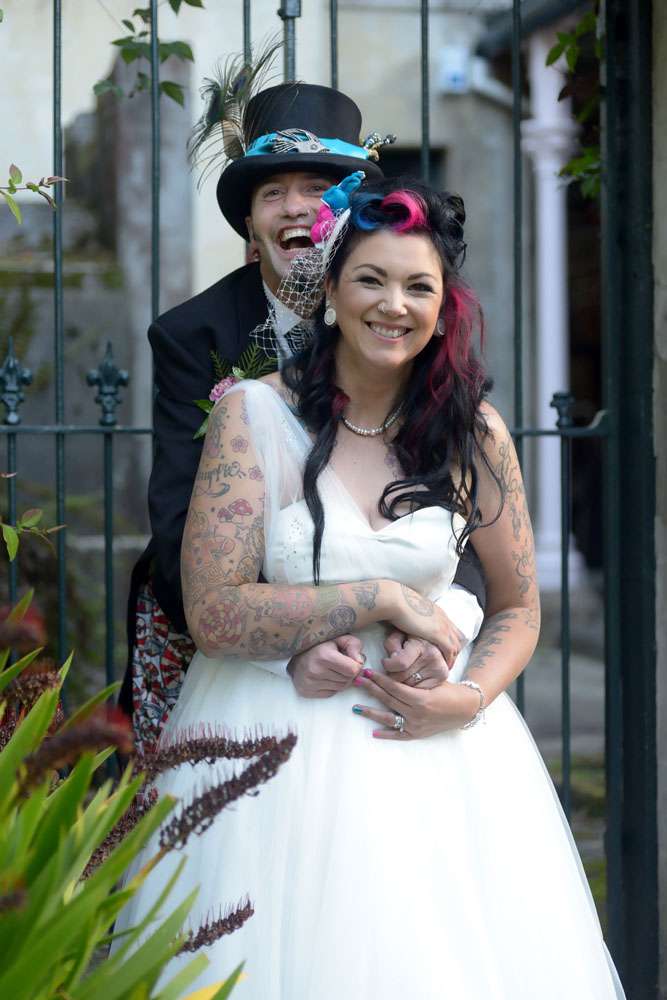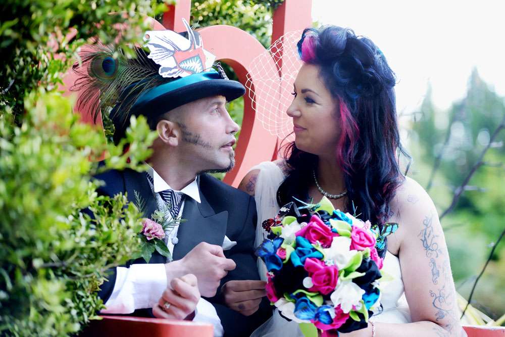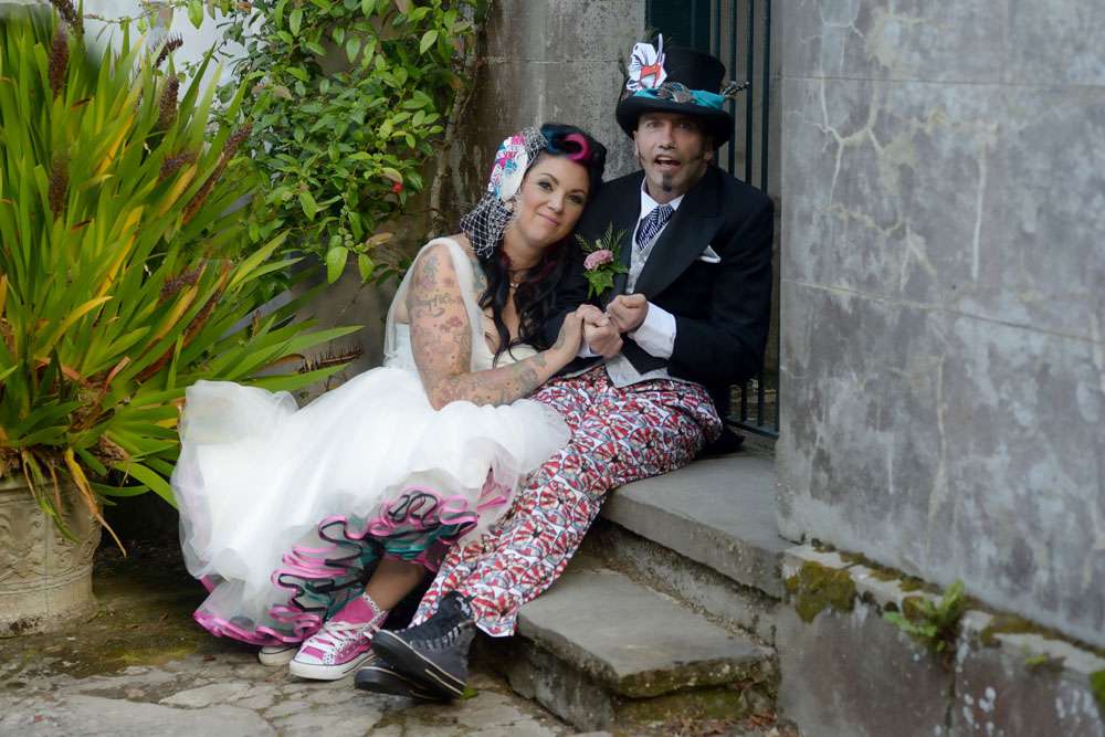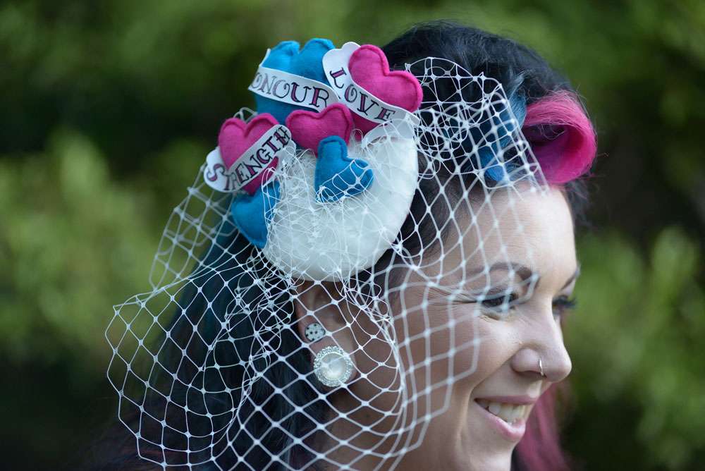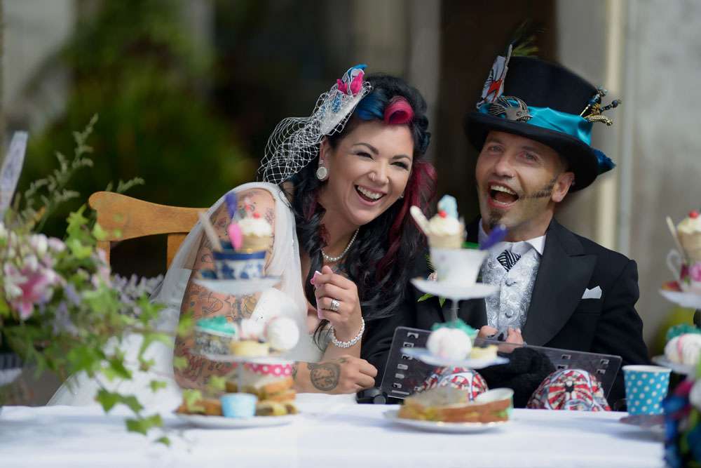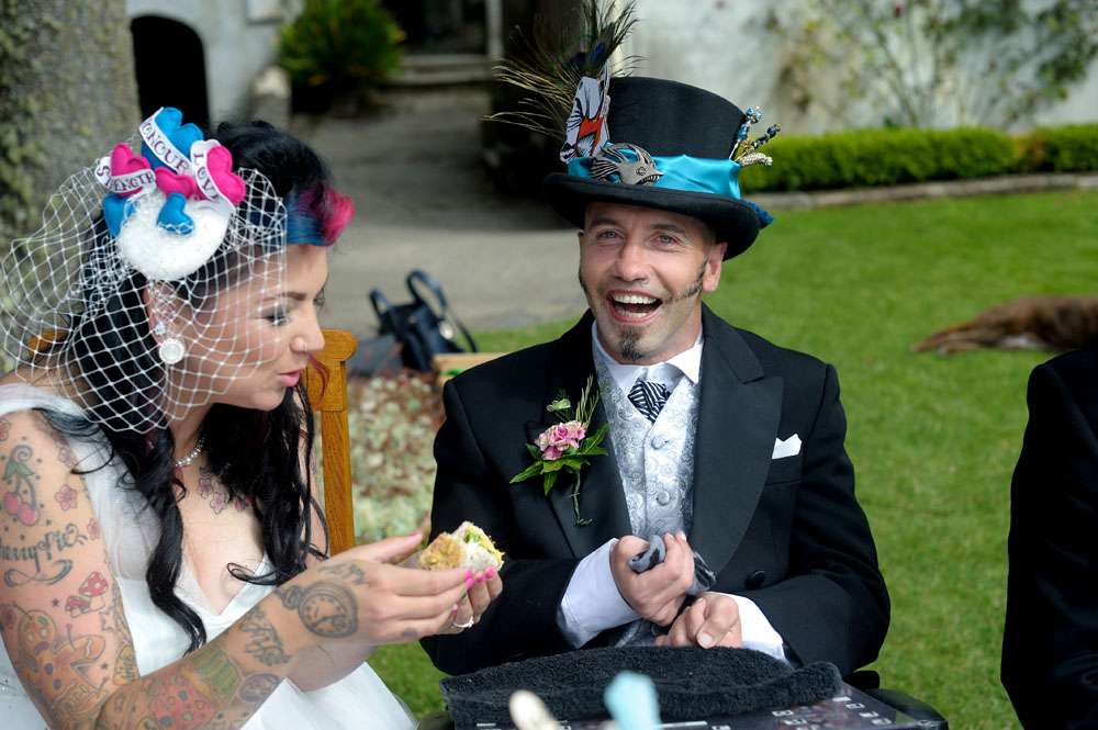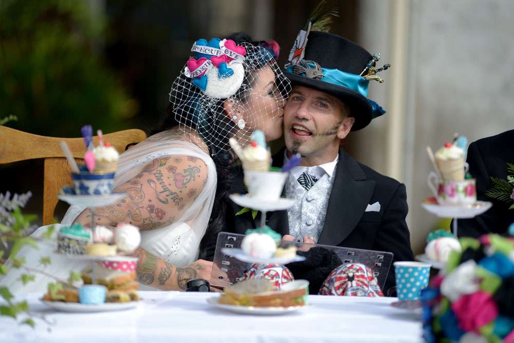 “We are both a little bit alternative,” she continued. “Nick never gave up his mohawk or the crazy lines shaved on his face and I love the rockabilly scene. Our wedding was a ‘Vintage Mad Hatter’s Tea Party.’ I made most things myself, hours spent at the dining table while Nick sat patiently next to me, advising me and playing scrabble on the iPod.”
