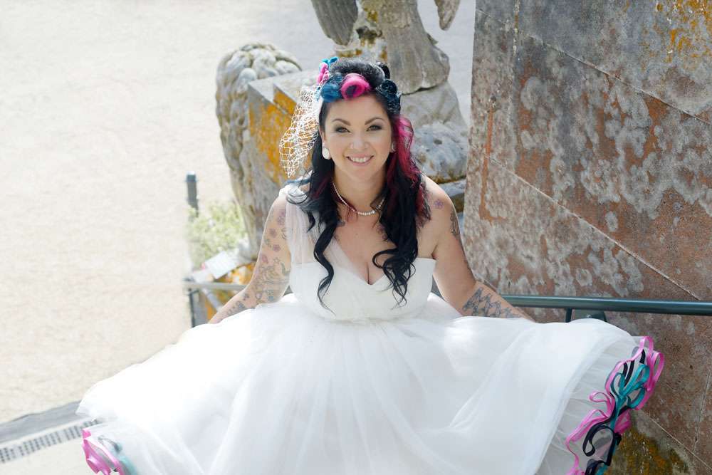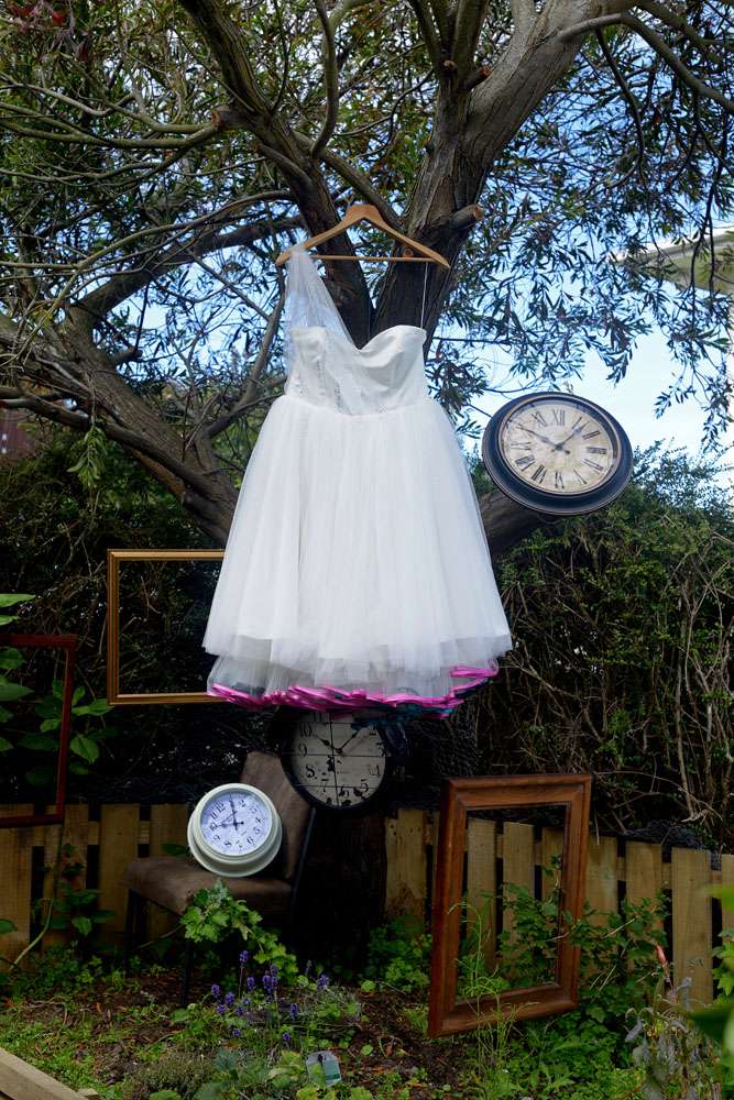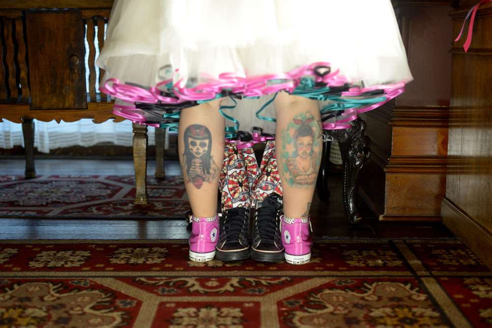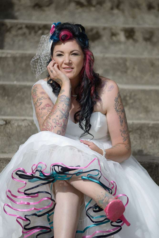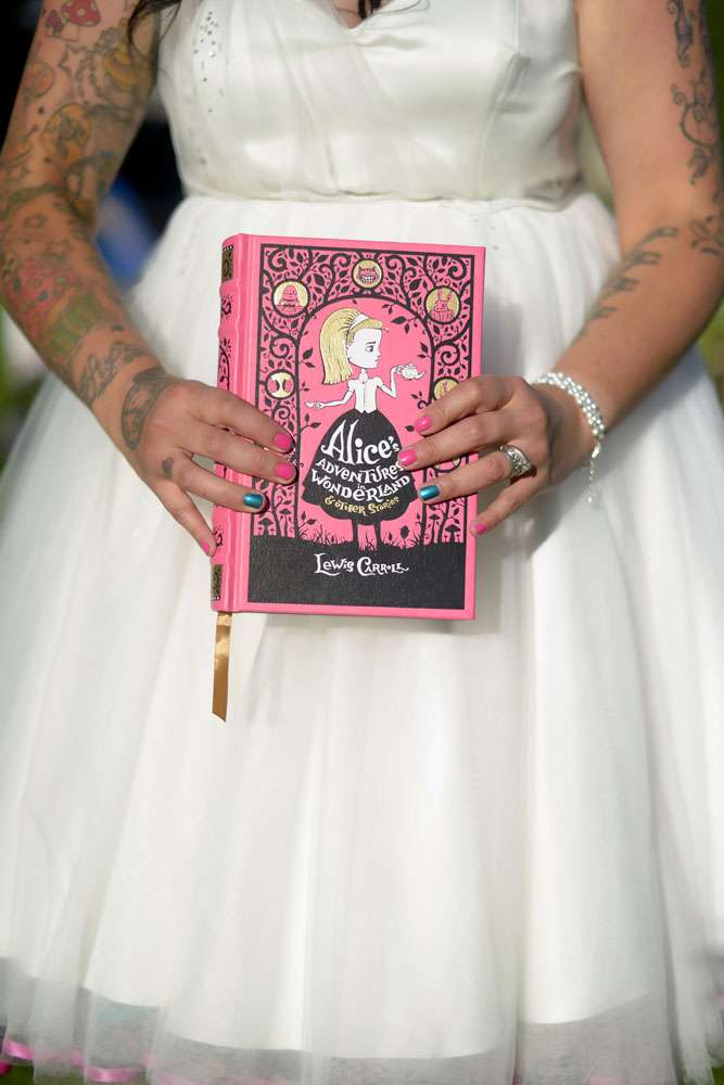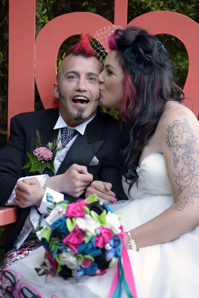 “We are both a little bit alternative,” she continued. “Nick never gave up his mohawk or the crazy lines shaved on his face and I love the rockabilly scene. Our wedding was a ‘Vintage Mad Hatter’s Tea Party.’ I made most things myself, hours spent at the dining table while Nick sat patiently next to me, advising me and playing scrabble on the iPod.”