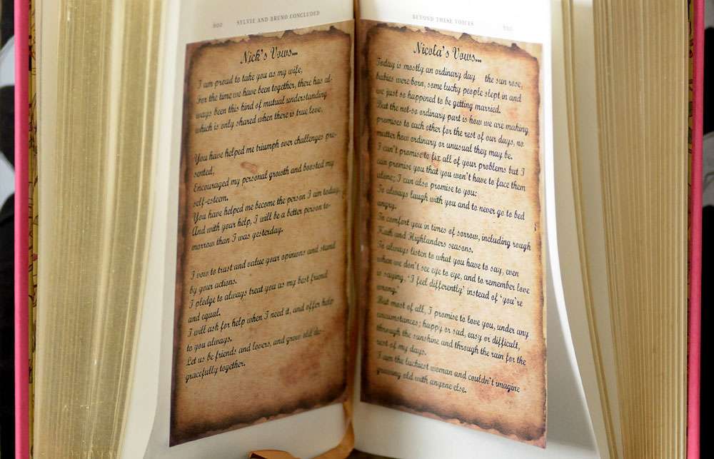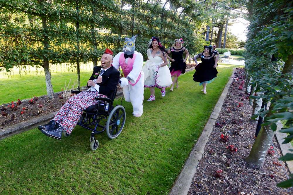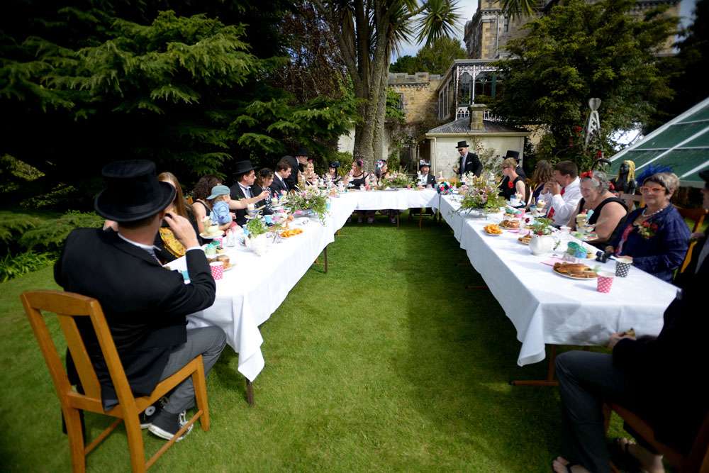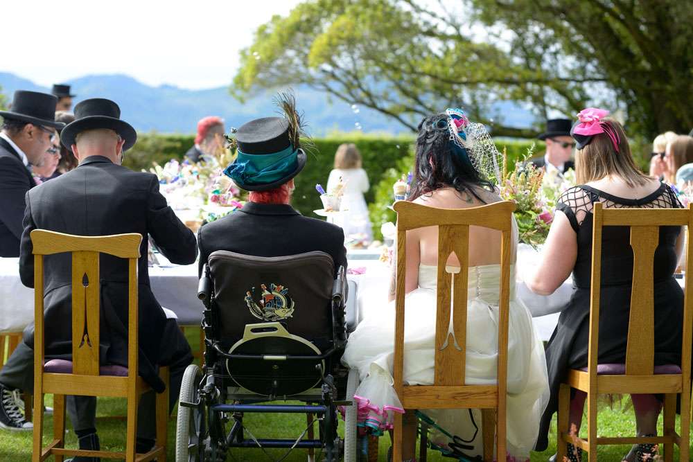 “We basically wanted our wedding to be as relaxed and as fun as it could be. Our celebrant worked with us to make the whole celebration an Alice in Wonderland ceremony, the whole ceremony was littered with quotes from the book. We had to think really carefully about Nick being in a wheelchair and the timing of everything and one of the quirky additions to our wedding was the white rabbit (good friend, personal trainer, Shane Waldron-Smith). At the end of the ceremony the celebrant pointed him out, at the top of some stairs in the castle and all the guests had to follow him around the gardens, in the mist… it was great fun to watch. Meanwhile Nick and I went to the old stables that had been transformed to a magical place where we had a huge tea party, with our nibbles before the main meal! We then went to the ballroom of the castle and had our dinner.”