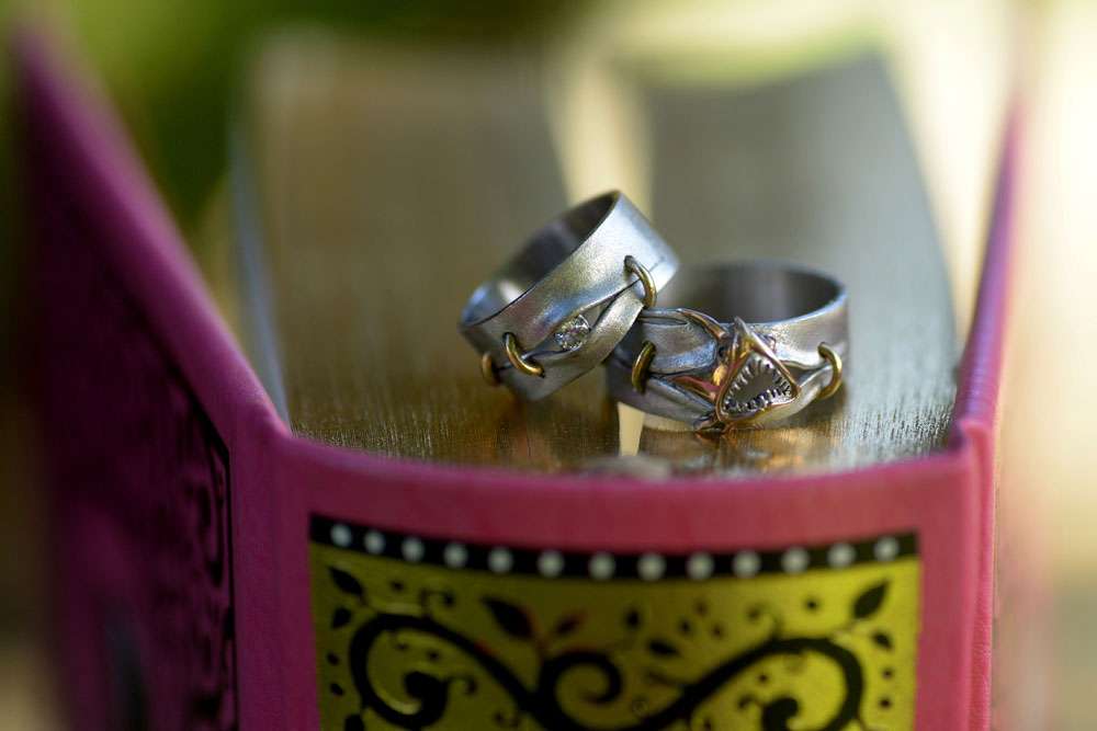 “We also designed our own wedding rings. Nick didn’t even want a ring until we met Iain Henderson. Nick’s ring features the Hot Tuna fish, which was his higher power when he went into rehab four years prior to his accident. Both rings have a split that represents the difficult times, both have gold stitches to represent us stitching up the difficulties and overcoming them.”