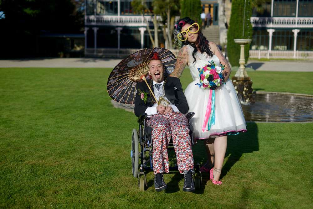 “Our story is pretty unique”, began Nicola. “My husband had an accident 14 years ago and was given 6 months to live. He had a series of strokes and has locked in syndrome, he cannot walk or talk and needs 24 hour care (he was featured on a TVNewZealand show which you can watch here). We met online. I was in the UK and he in New Zealand. We fell in love and I gave up everything to be with him in New Zealand. Four years later we got married! AND he walked, assisted by his physio and a good friend, down the aisle!!!!!”