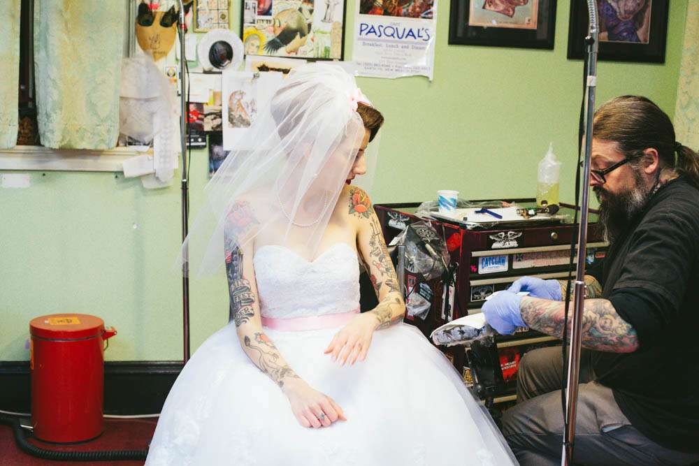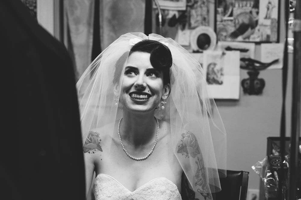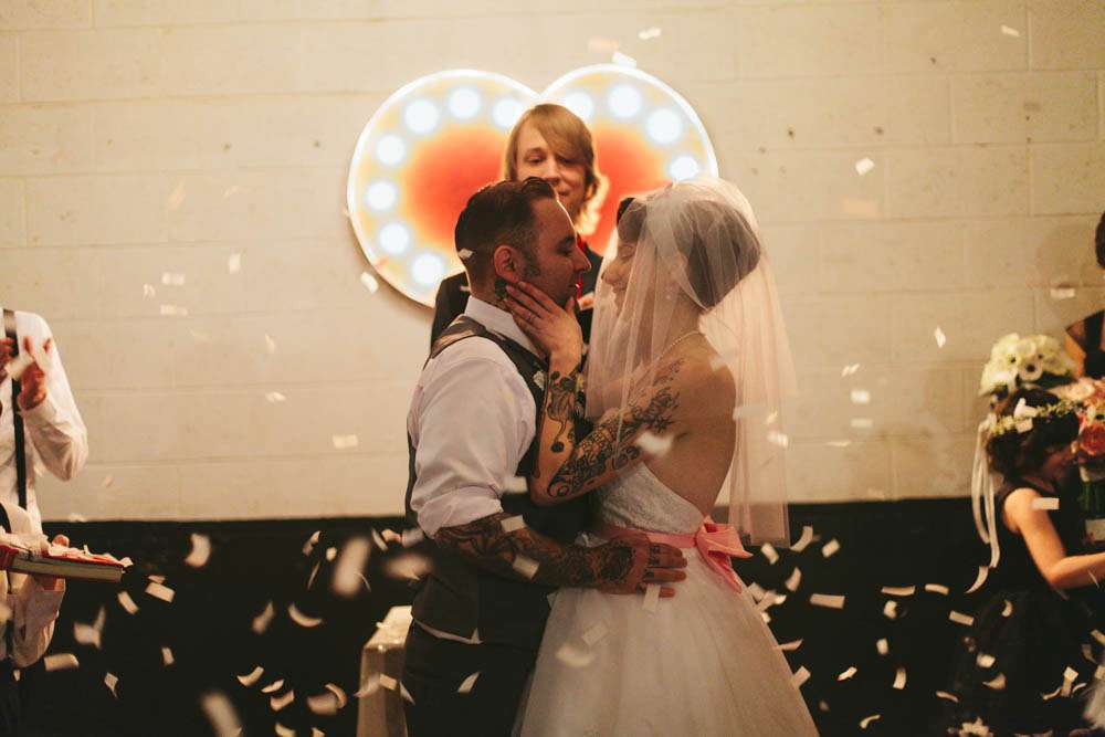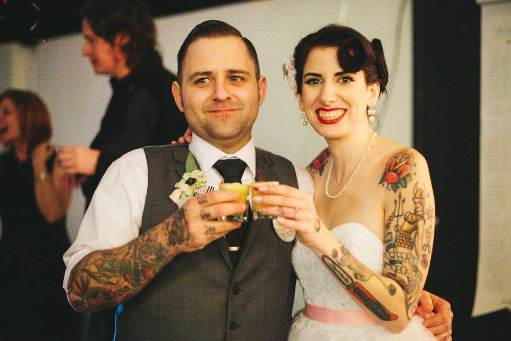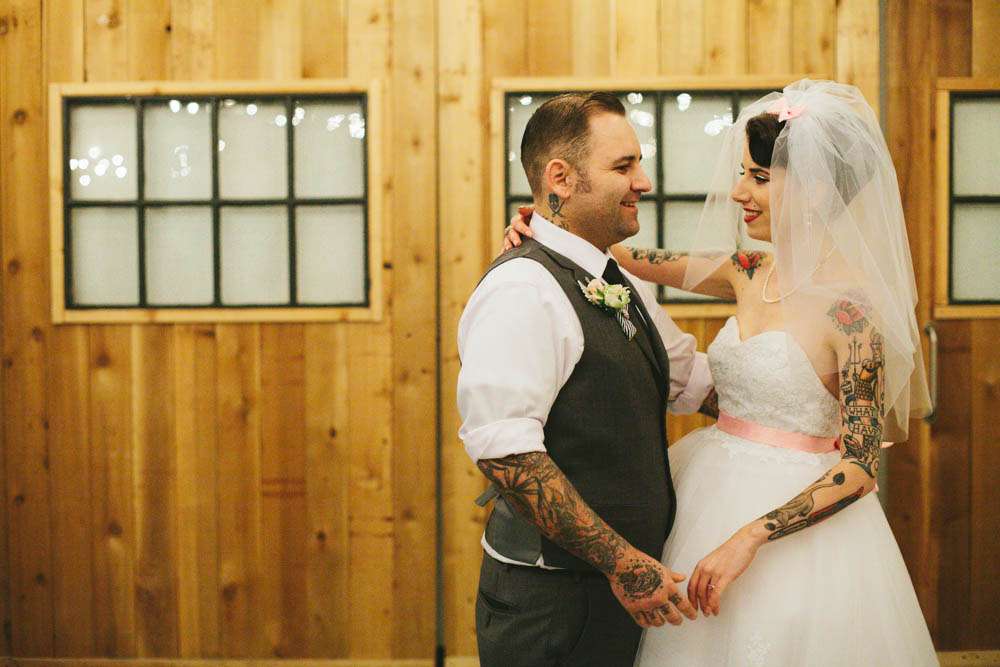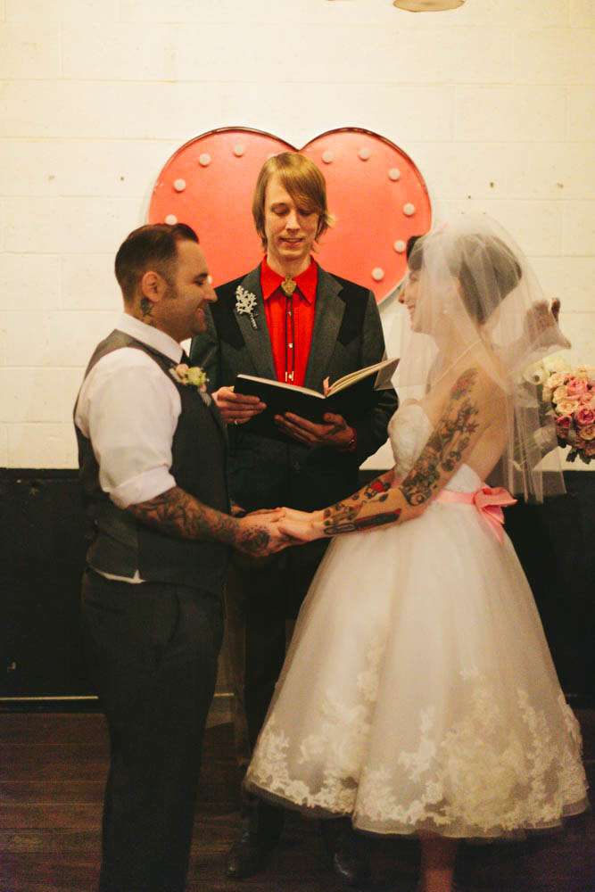 “As far as a Rock n Roll attitude… we didn’t dismiss any of our crazy ideas! We wanted to get tattoos on our wedding day – so we did! We wanted an Elvis impersonator to serenade us for our first dance – so we hired one! We wanted a big heart sign at the altar to light up while confetti cannons exploded as we kissed – so we made it happen! We incorporated a few of the more traditional wedding elements that we loved, but otherwise if it felt right we did it… no matter how crazy it seemed. Even our most conservative guests loved the off-beat elements because they so perfectly represented our personalities.”
