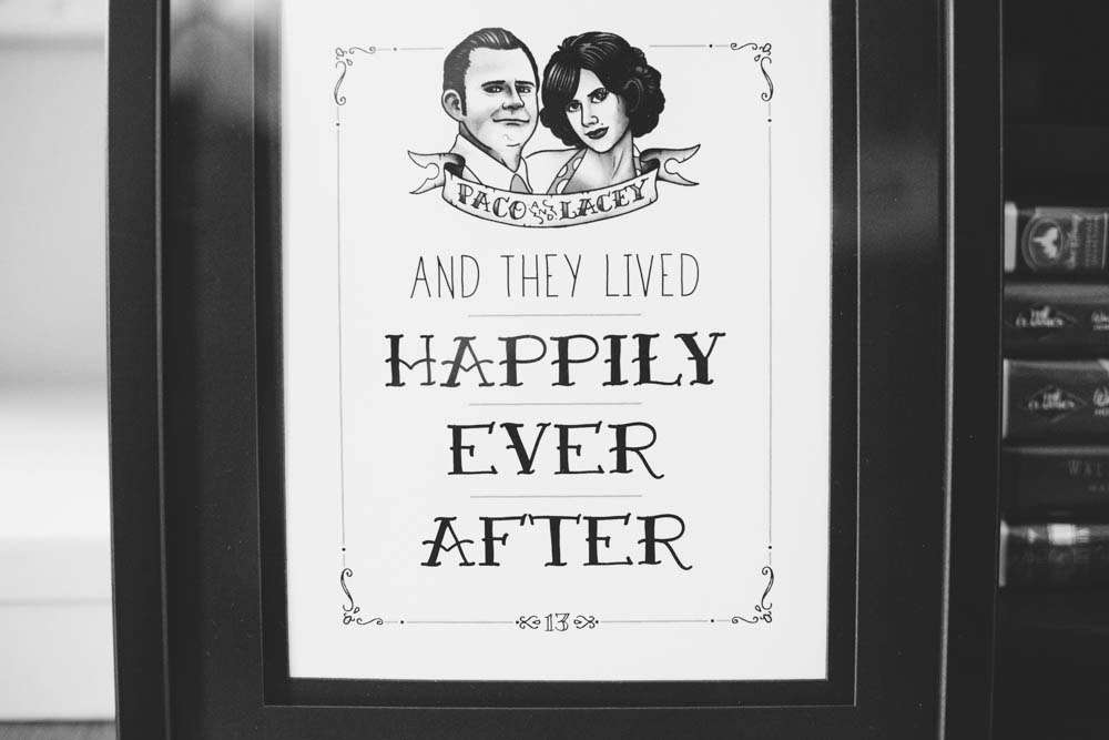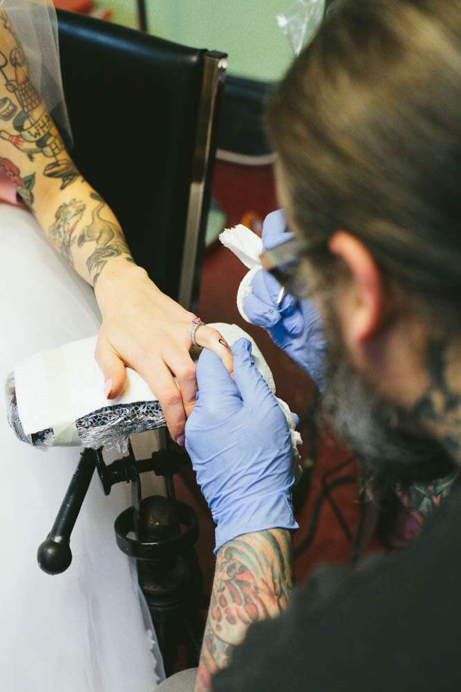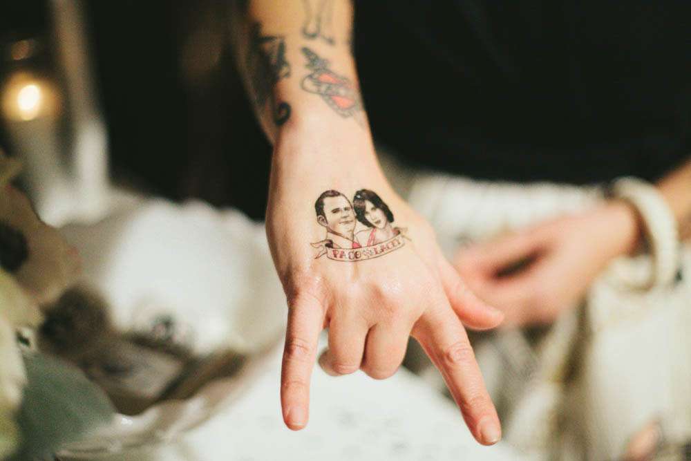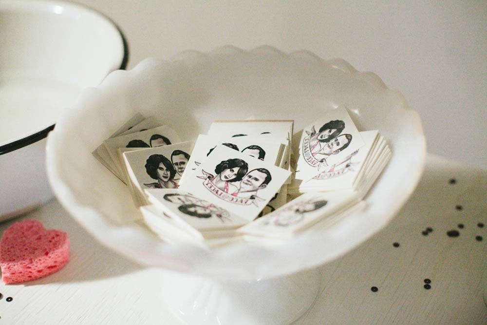 “One of my favorite ‘us’ inspired elements were our temporary tattoo wedding favors. We are both tattoo lovers and our artwork has often been a conversation starter in our families. We asked the tattoo artist that we both go to, Jerry Ware, to draw us and had his art made into temporary tattoos. Guests put them on at a temporary tattoo parlour that was set up during cocktail hour and they were a huge hit. Even my parents got ‘tattooed’ that night!”