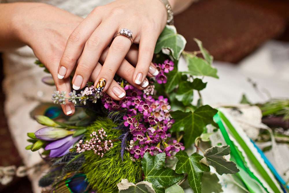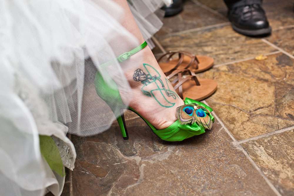 Kallie’s dress was from David’s Bridal but she customised it a lot with the green underskirt and blue and green beads. Her shoes were Nina, but again, she made them her own by adding peacock feathers.