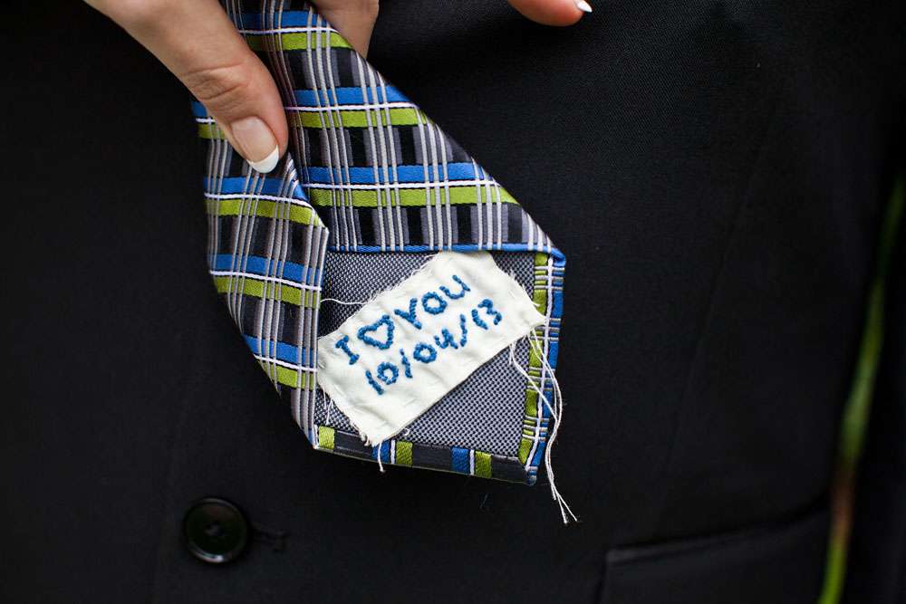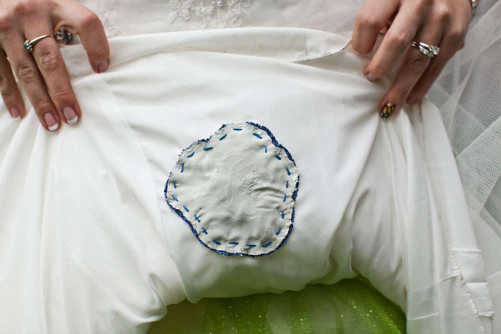 “One of my favourite personal things was the patch I had sewn into my dress which was a piece of my mom’s wedding dress and my dad’s jeans. I also had a note sewn onto the back of Brandon’s tie. The backdrop and arch in the ceremony were made for the wedding. We also added a monarch butterfly release after the ceremony. I love butterflies as I used to raise them as a child and Brandon and I collect caterpillars each summer for his mother who is a teacher to raise in her classroom.”