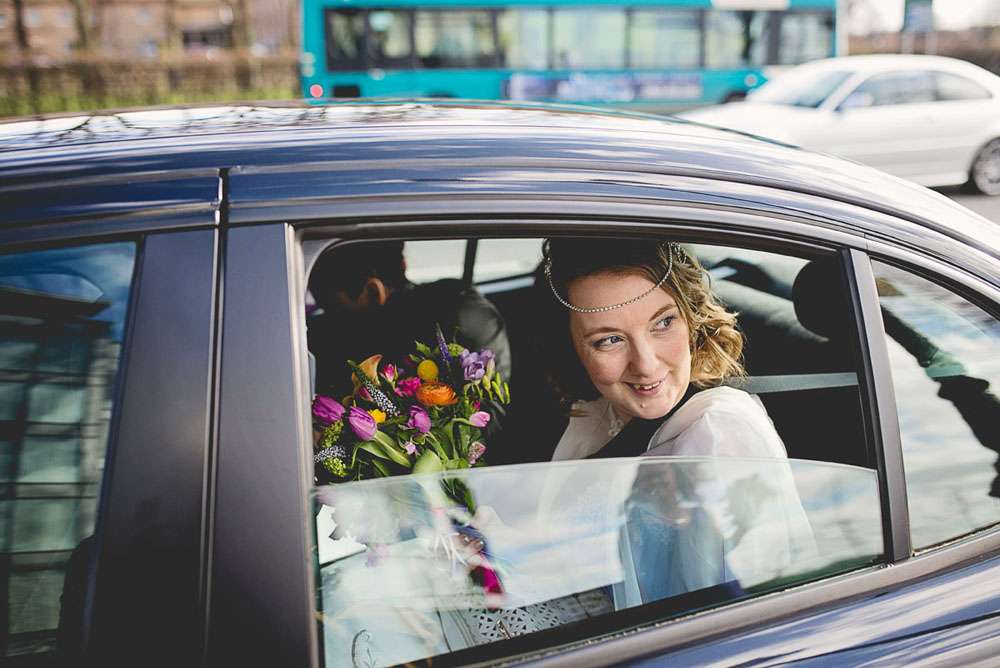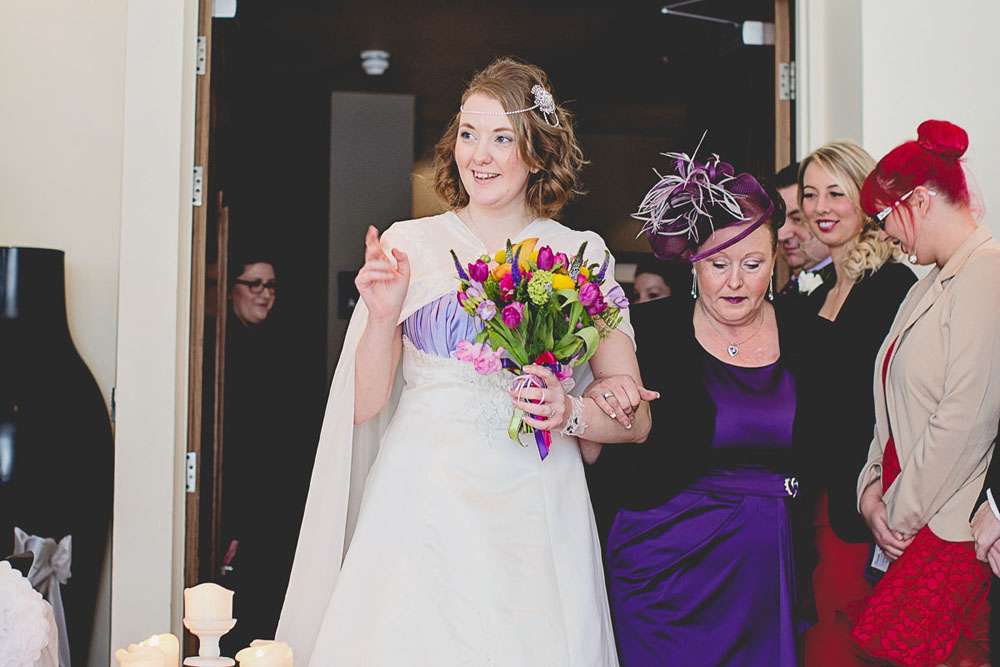 Sam wore a dress which she bought online, with amazing Irregular Choice shoe boots and a cape! “My favourite thing of the whole wedding was my whooshy chiffon cape. I didn’t want a veil but a cape? I couldn’t resist! It surprisingly kept me warm in the wind that a fever from my well disguised cold. Stu loved my ‘Galadriel’ cape, I just need to find more excuses to wear it!”