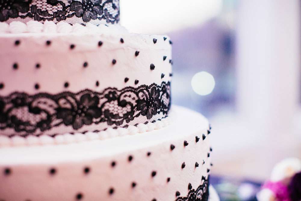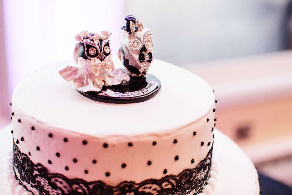 “We brought the black lace into the reception and we ordered table runners from etsy. The ribbon that we wrapped around mason jars and milk jugs came from my husband’s grandfather. They were 80 year old jars he had collected and we used them as our centerpieces and filled them with barley (a main ingredient to beer) and put candles in them. Our cake also had the lace around it to bring everything together… which also doubled as my garter because I forgot to put it on when I got dressed so I had to think quick when I was told it was time for garter toss!”