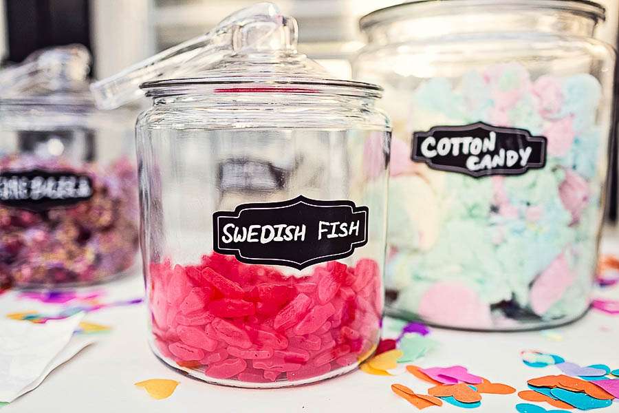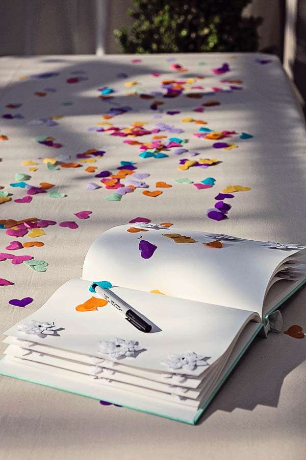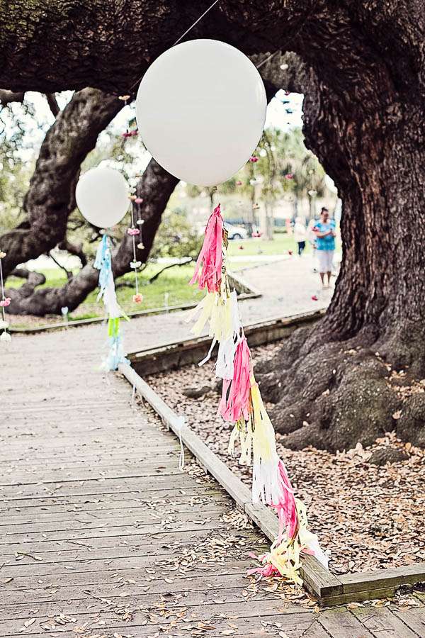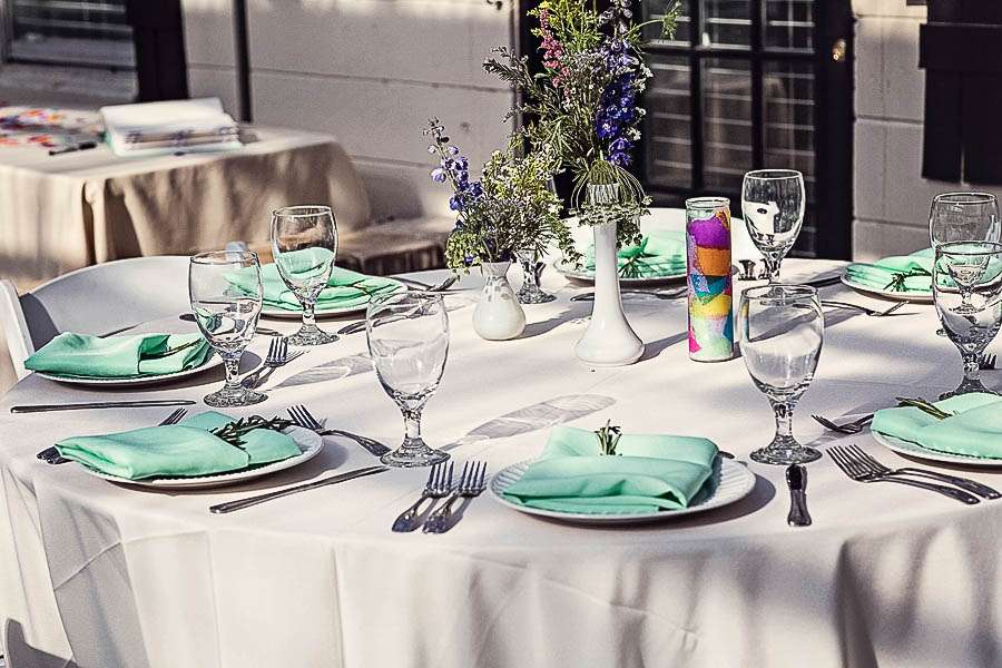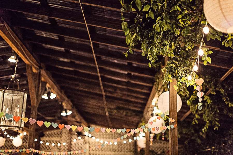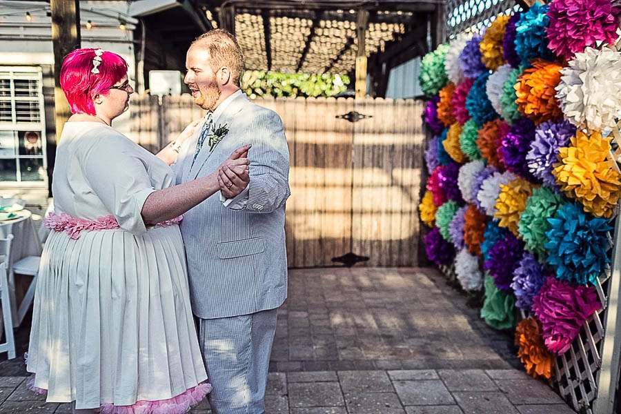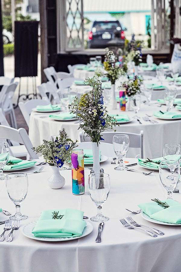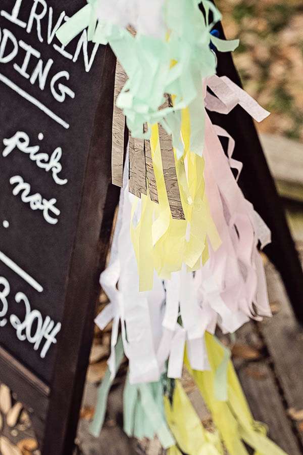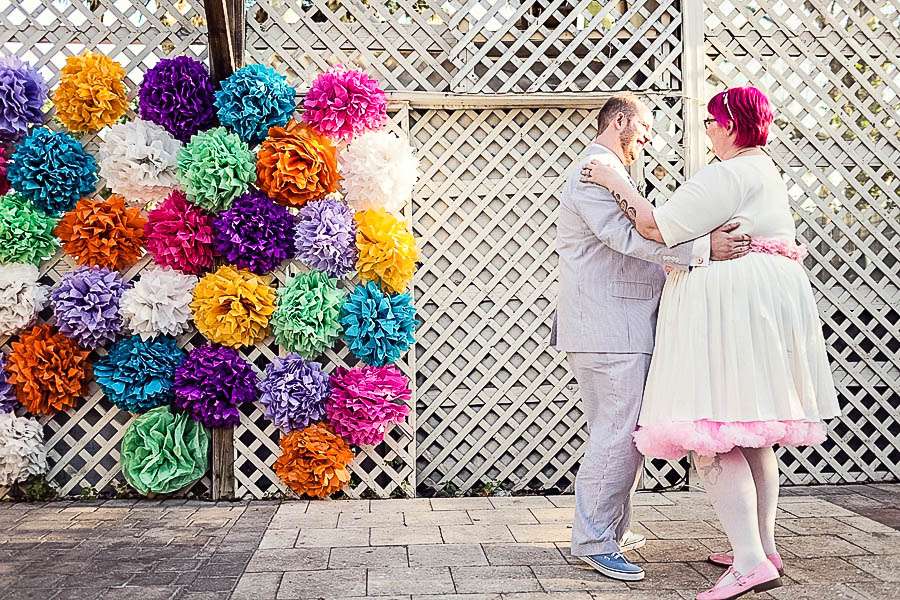 “I used Pinterest and wedding blogs for décor ideas”, she continued. “I looked up a tutorial on how to make tissue pom poms and we made 40 different one for the dance floor. Then, I made heart tissue confetti for tables, Papier mâché candles, the invitations and RSVP cards, and the picture frames we put our kitties and doggy in. We both worked so hard on every detail and seeing it finally come together was perfect. We got so many compliments that it was the best wedding because we worked hard to make sure it was relaxed, fun, and unique.”