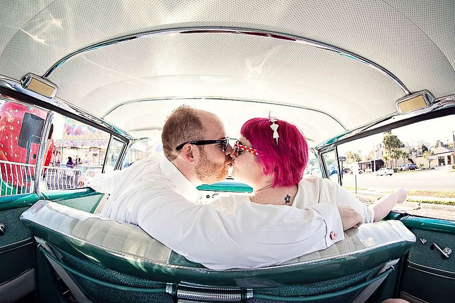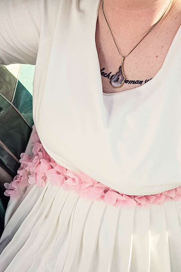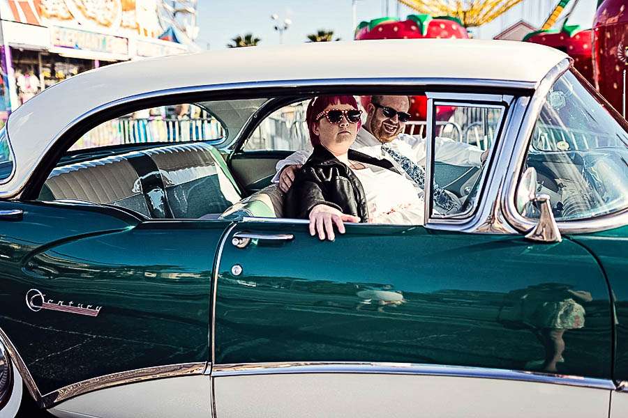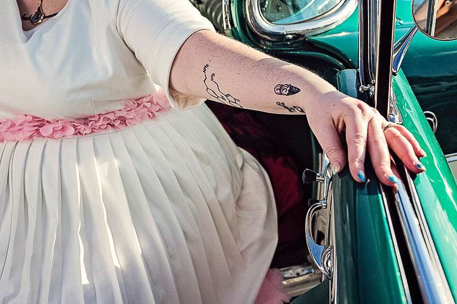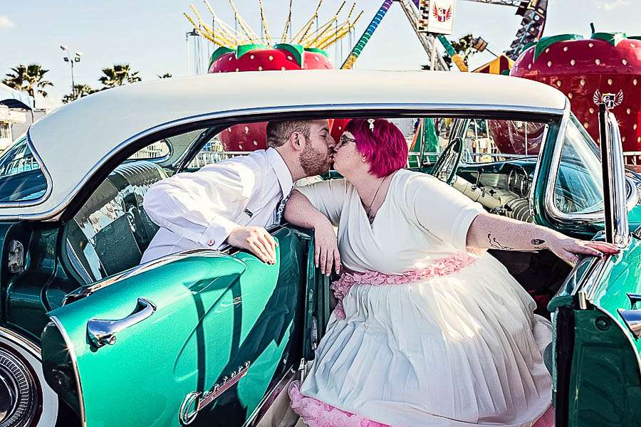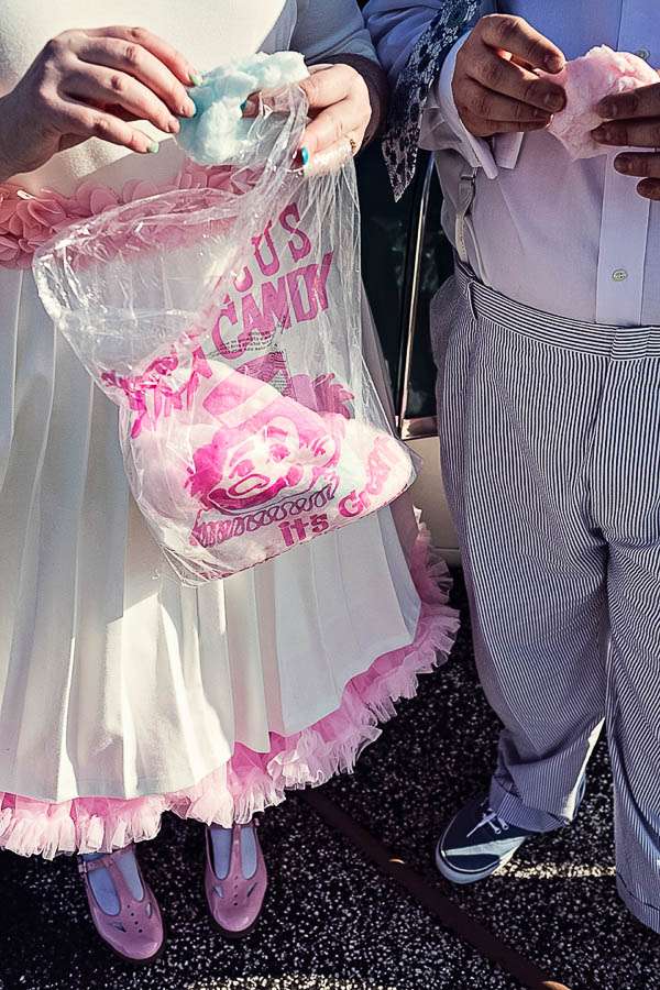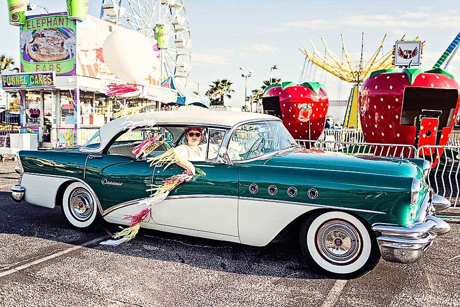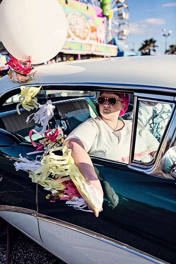 “The officiant was explicitly told there would be no religion, no references to ‘giving the bride away”‘or any other traditional vows”, she continued. “I’m a feminist and I am not owned by my father or my husband. She went along with it beautifully and even threw in a Willy Wonka quote at the end. I had pink hair, tattoos showing, and we arrived in a classic Buick Century. Our shoot after the ceremony at the carnival was very Rock n Roll, with my leather jacket, pins, and our sunglasses. We happened to find the carnival in a shopping center a few days before the wedding and it turned out to be perfect for pictures. It was free and we had a blast! The car we rode in was the coolest too.”