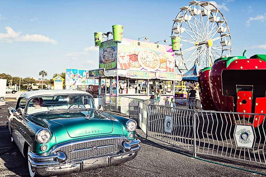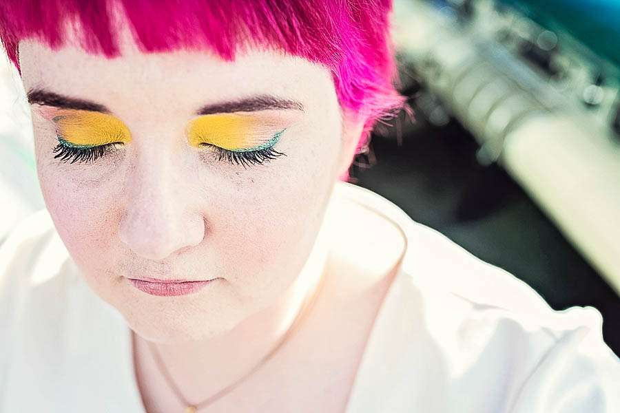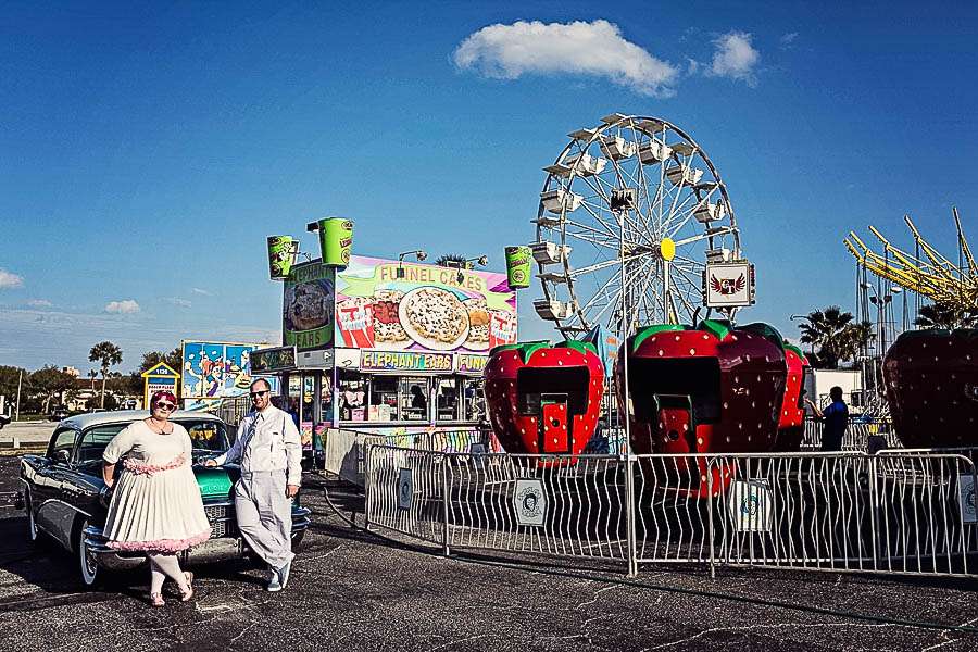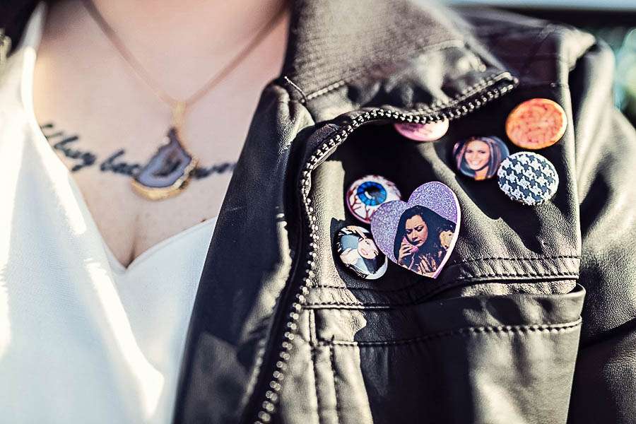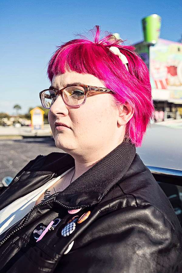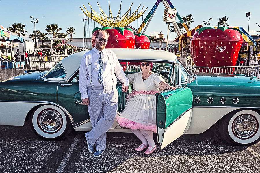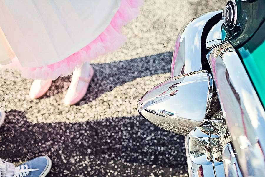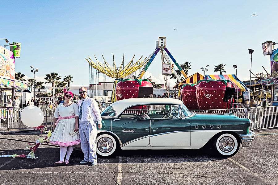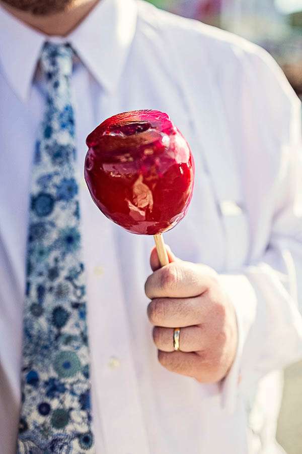 “The officiant was explicitly told there would be no religion, no references to ‘giving the bride away”‘or any other traditional vows”, she continued. “I’m a feminist and I am not owned by my father or my husband. She went along with it beautifully and even threw in a Willy Wonka quote at the end. I had pink hair, tattoos showing, and we arrived in a classic Buick Century. Our shoot after the ceremony at the carnival was very Rock n Roll, with my leather jacket, pins, and our sunglasses. We happened to find the carnival in a shopping center a few days before the wedding and it turned out to be perfect for pictures. It was free and we had a blast! The car we rode in was the coolest too.”
