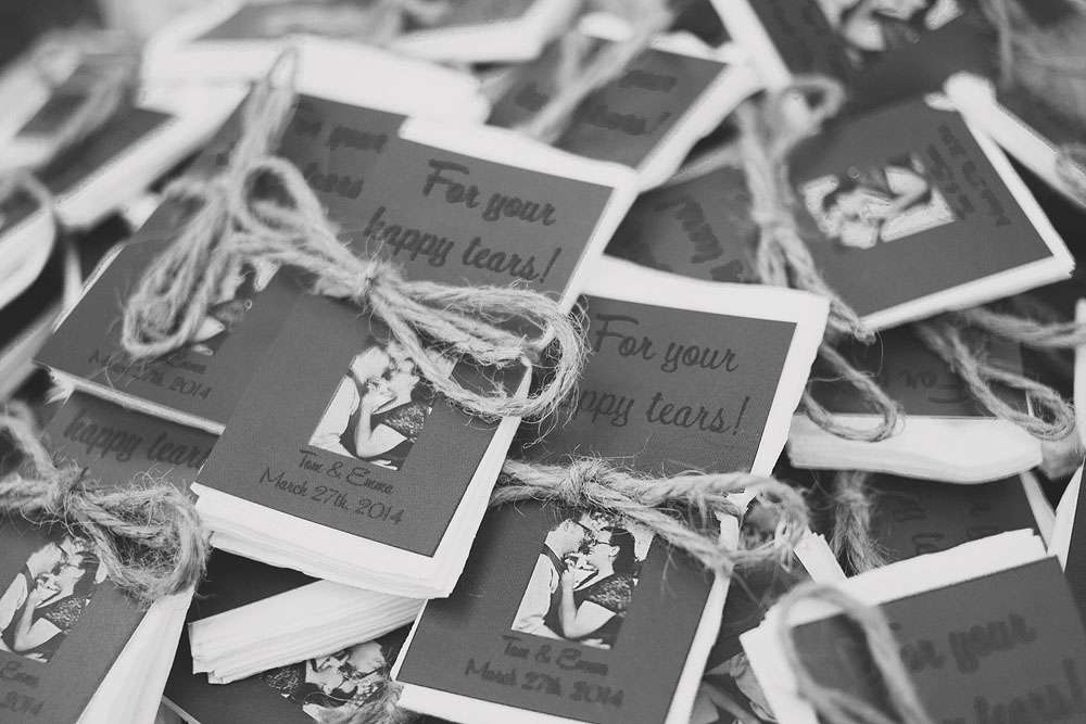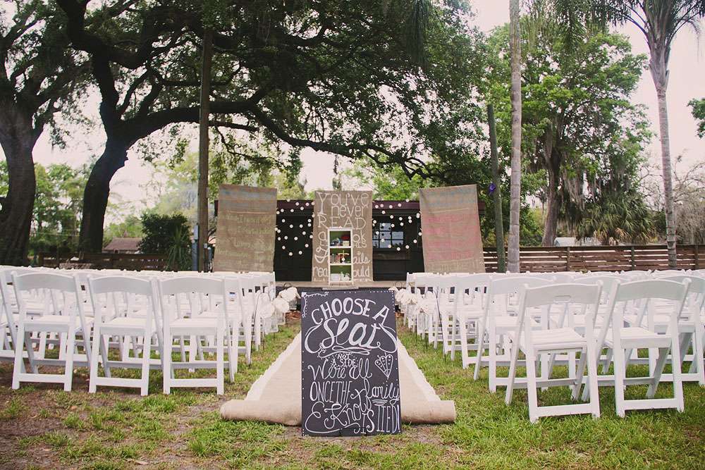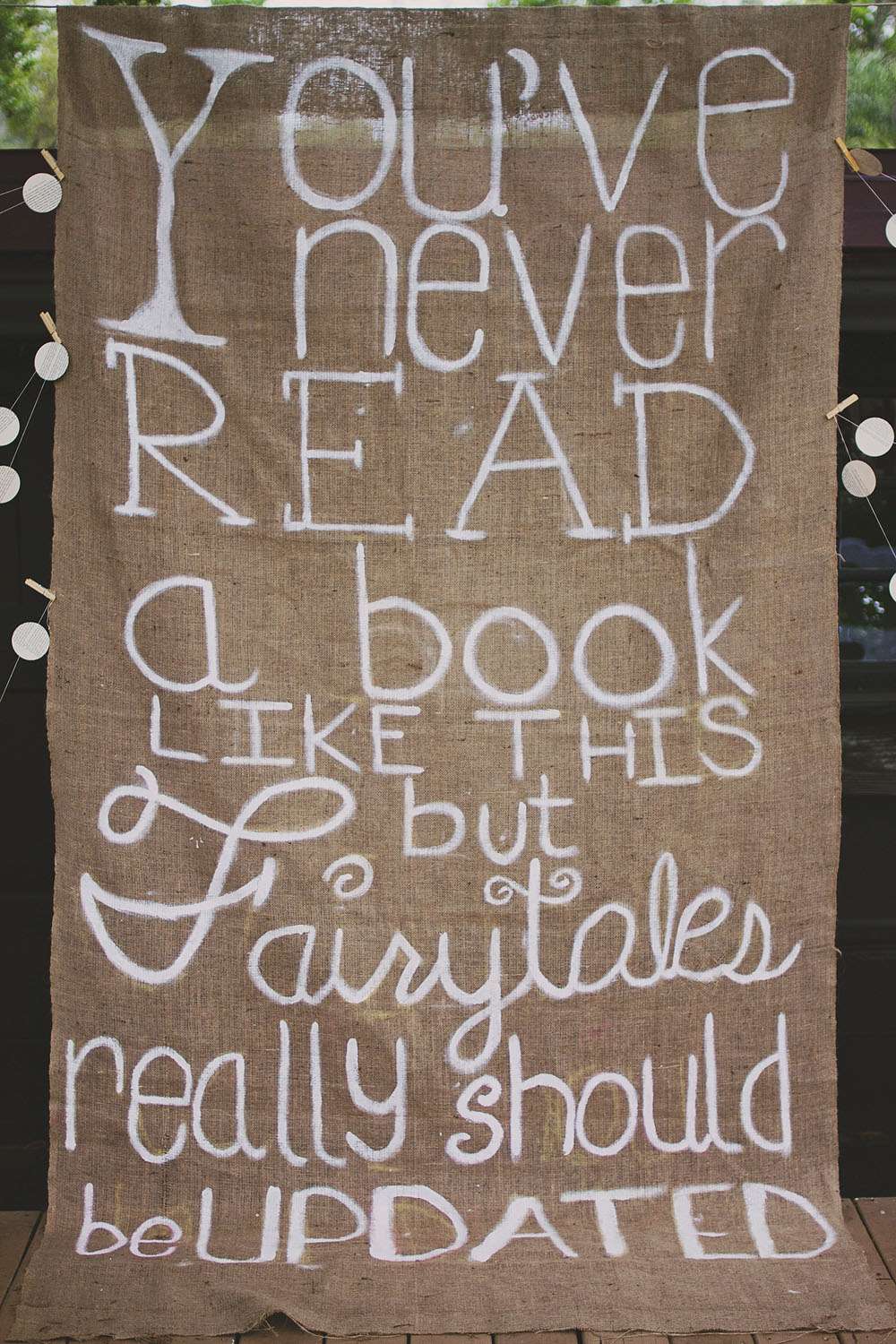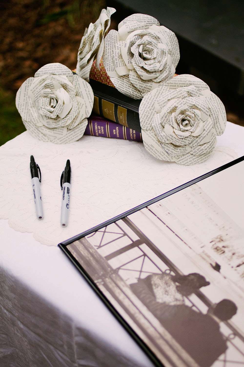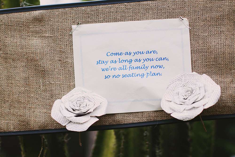 “Tom taught himself how to make bow ties for his groomsmen’s presents and enjoyed it so much he has started a bow-tie business. We had DIY book page garlands, book page roses, and opted for hand painted signs to keep our guests informed. We fell in love with a lace a burlap aisle runner on Etsy, and the length we needed would have cost us about $180 dollars, so I ordered some burlap lace and made it myself for about $30.”