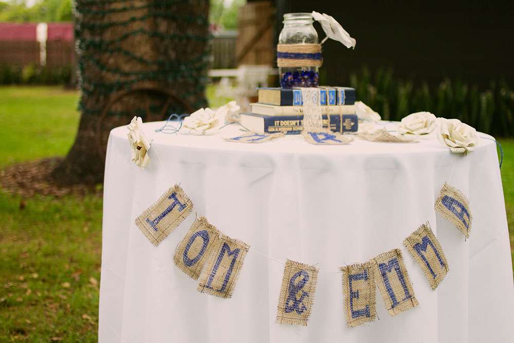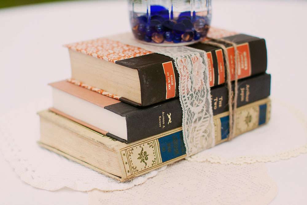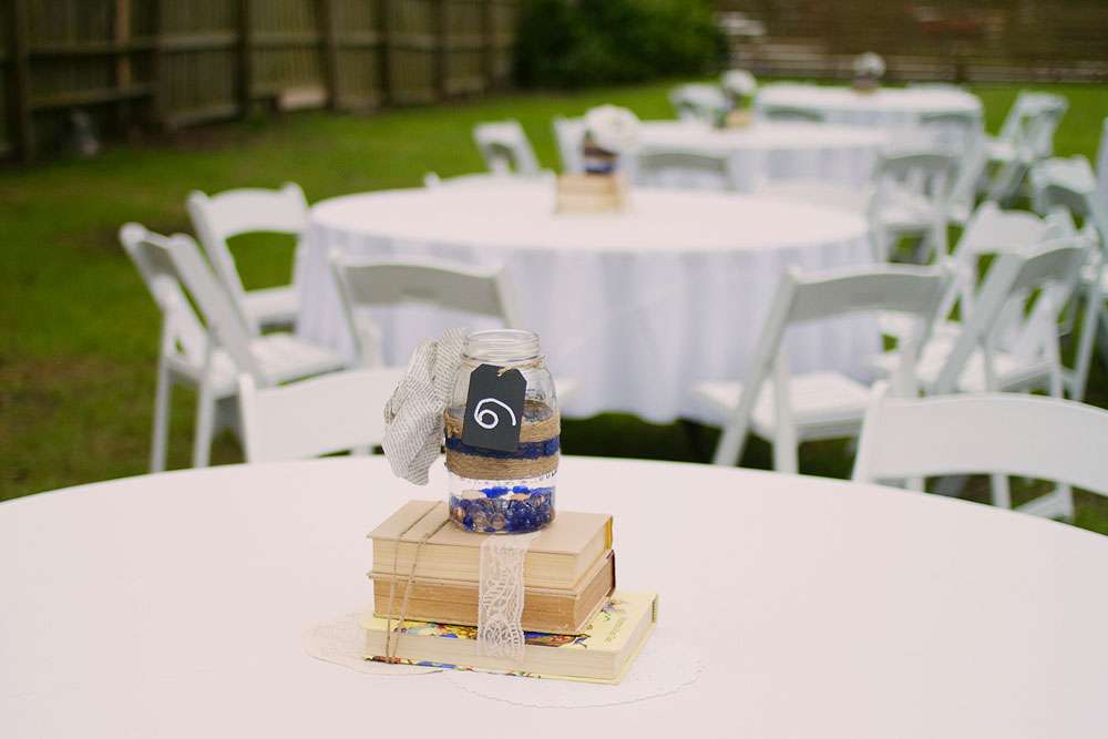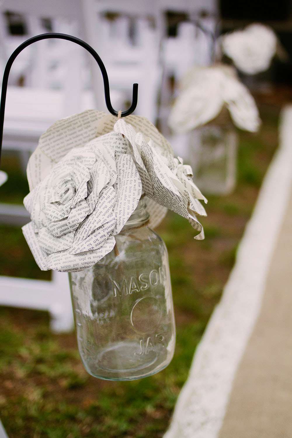“Pretty much all of our décor was made by us”, began the bride. “We wanted our tables to look like home. We wanted our guests to look around and feel like they were at their grandma’s house. We had stacks of old books, doilies, jars and lace. Actually, the jars used in our centerpieces were Tom’s grandmas from the 50s!”