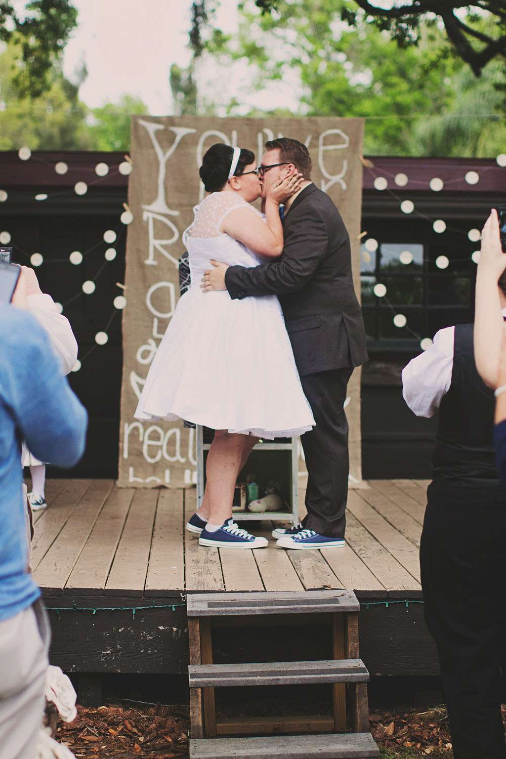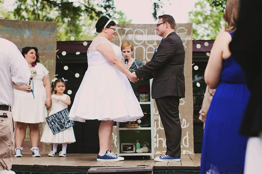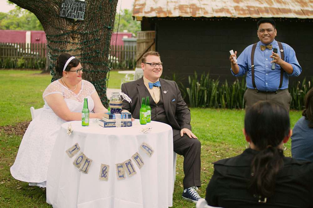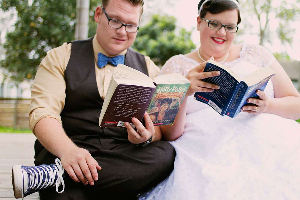 “We based so much of the wedding on our eclectic selves that we had no other choice but to be quirky”, she continued. “It was mostly inspired by the fact that we didn’t want to rent a limo, wear tuxedos, and have a champagne toast. It evolved so much from the beginning but I think it ended up being Tom and Emma themed. Each decision made was based on who we are as people, it definitely had hints of some of our favorite things like Doctor Who, rockabilly, vintage and books!”