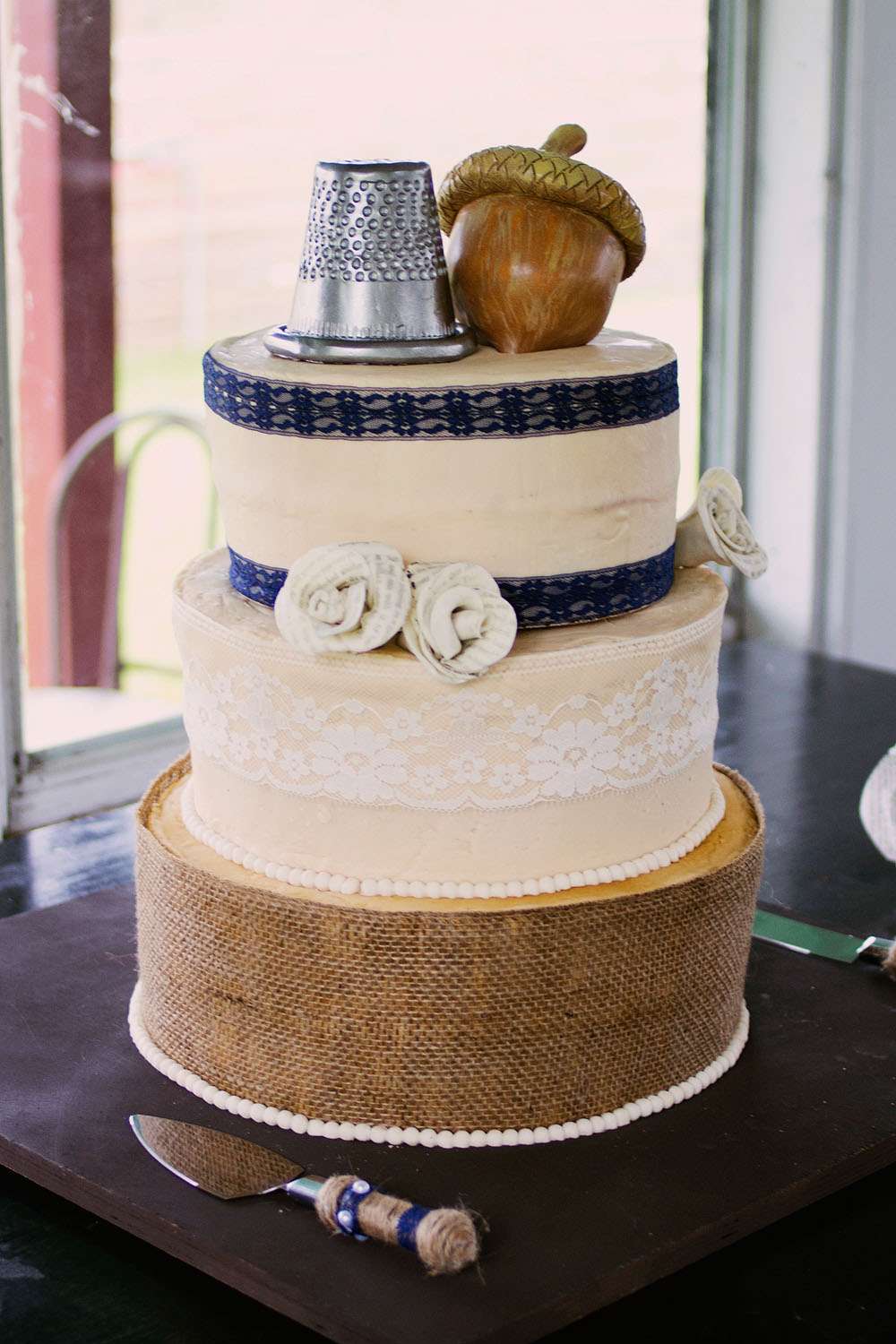 “Another one of my favorite details was our cake topper. Tom and I have matching tattoos of a thimble and and acorn. They reference a part of the book Peter Pan where Wendy and Peter exchange a thimble and an acorn as the representation of a kiss. We hated the idea of random people that didn’t capture us at all on top of our cake so my older brother, Jason, sculpted us a thimble and acorn to sit on top.”