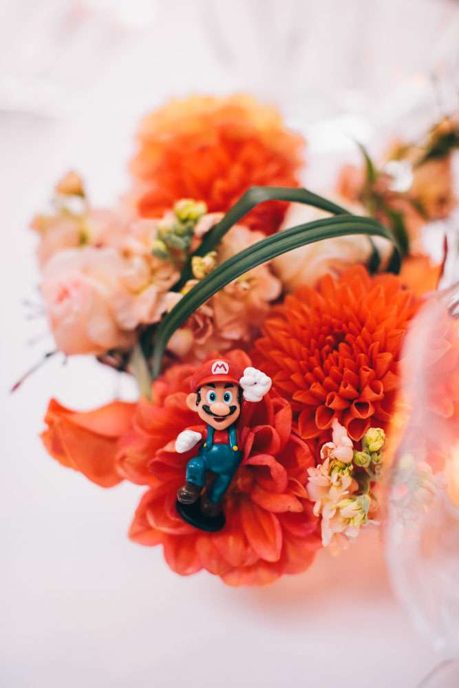 This couple love movies and video games, and so that’s where they went for their wedding styling. “I don’t know if it was a theme but we sure had a lot of Mario stuff”, Stephanie explained. “We’re 80s kids raised on Nintendo, so our seating chart and table names were all from the classic Super Mario World map. We got a bunch of Mario toys and spread them all around the tables, and of course there was the insanely awesome cake. It was so detailed, it even had a Rainbow Road from Mario Kart!”