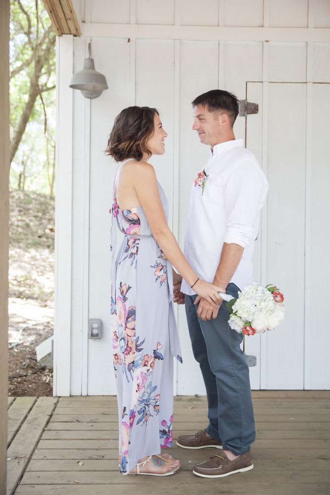 Catie wore a dress from Anthropologie with Target shoes. Rick’s outfit came from J Crew and Banana Republic. They were determined not to spend a fortune. “After five years together we decided to get married on a Wednesday night and held the ceremony and party that Sunday,” began the bride. I had never dreamed of a big white wedding. After being a bridesmaid four times the thought of doing that to others was less than ideal. My dress was far from white and I actually picked it out sight unseen while looking for something to wear to a friend’s wedding. I called and purchased it over the phone thank goodness one of my 20 guests lived in Raleigh and snagged it on her move back to the island Friday. It fit like a glove, didn’t need a single alteration. I think it’s funny that Rick wore white! His only stipulation was the he got to roll his sleeves so we could see his tattoos.”