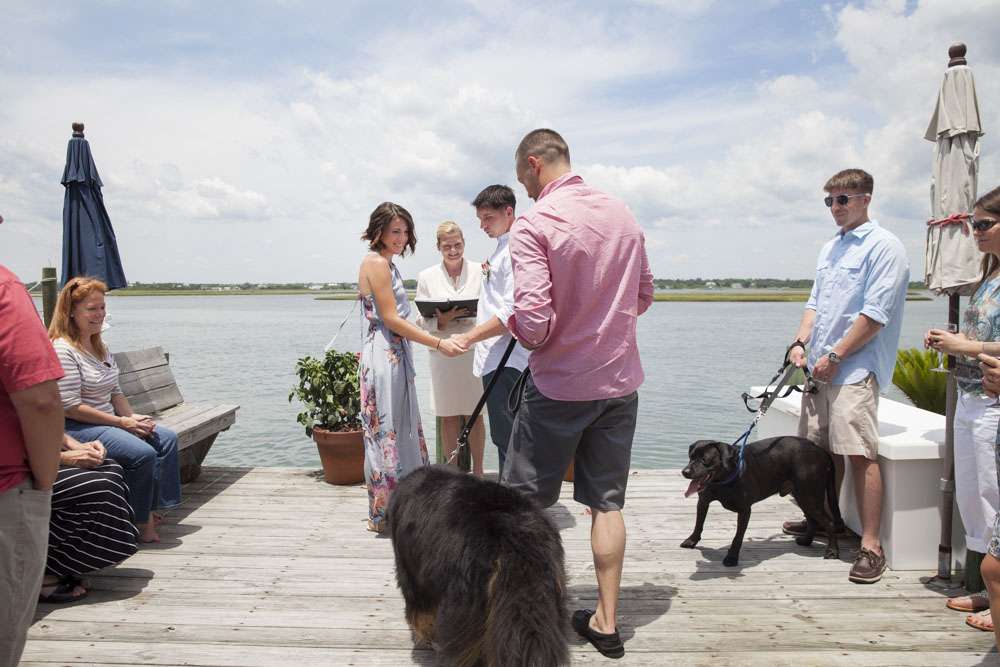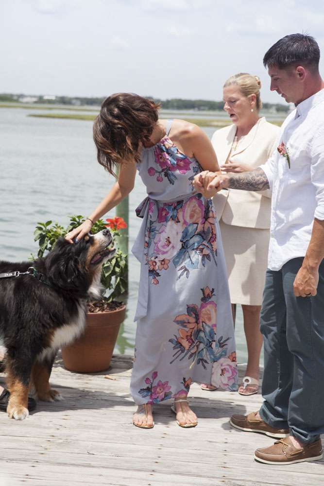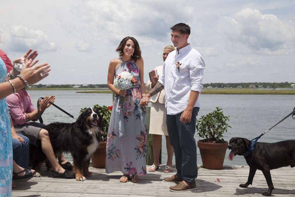 “The best part our day was having our dogs present. I don’t think it would have been nearly as special with out the two pooches. I now treasure my pictures with our big man Timber as he passed a month after the wedding. He did his job and could then pass peacefully. The ceremony was only 12 minutes long and held at the end of a dock where other boaters and jet skis were flying by. The neighbors DJed from their boat while they sat around in their swim trunks drinking beers. After everyone snacked and enjoyed themselves we all changed into swimsuits and enjoyed some swimming, paddle boarding, and boating. Not your conventional wedding reception I guess!”