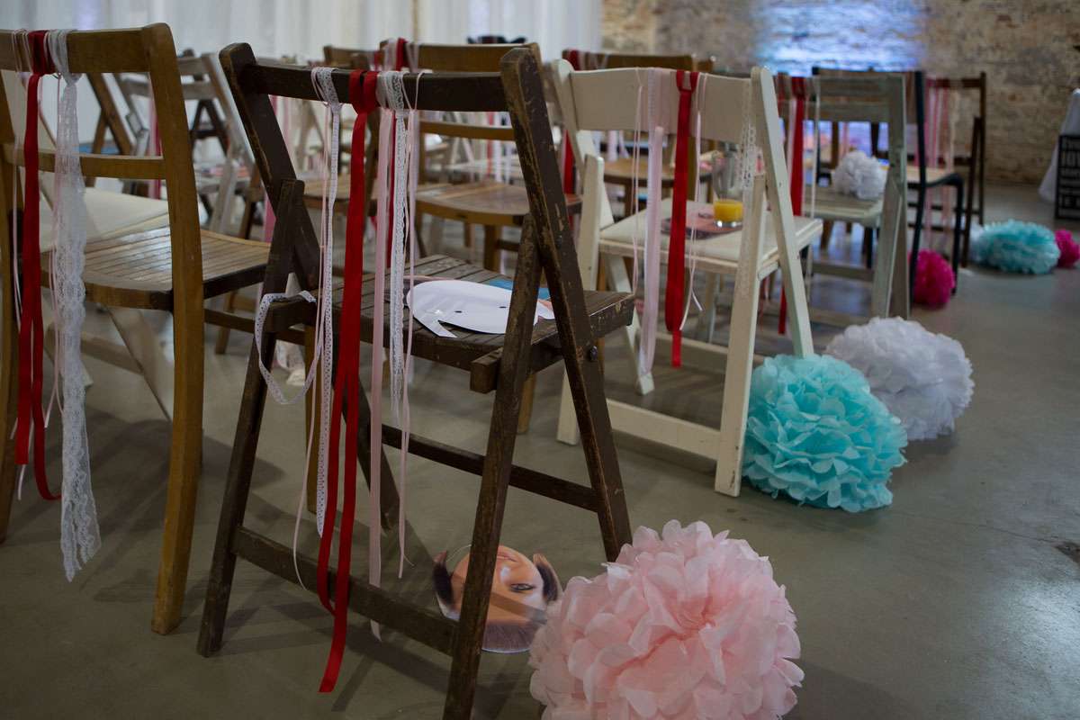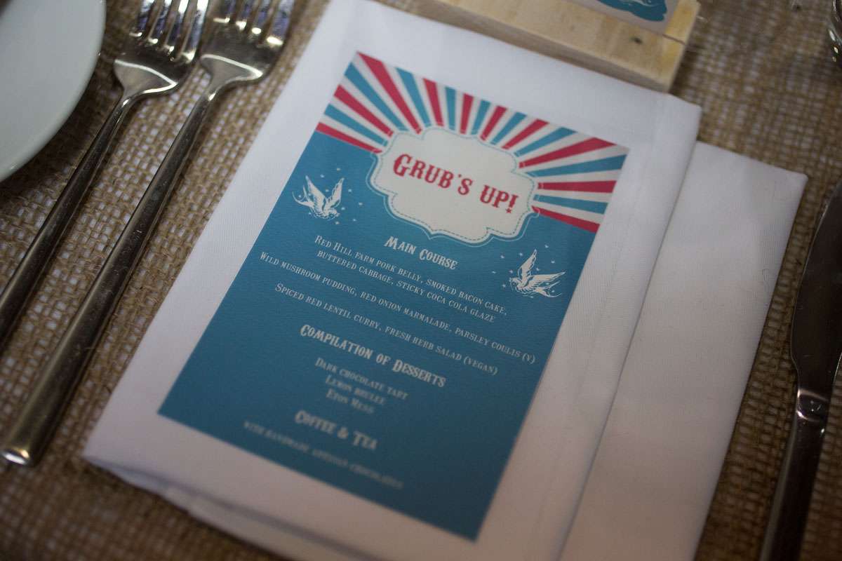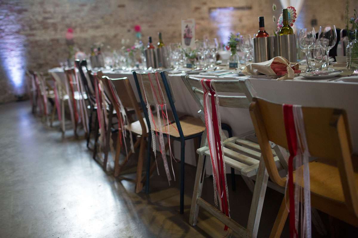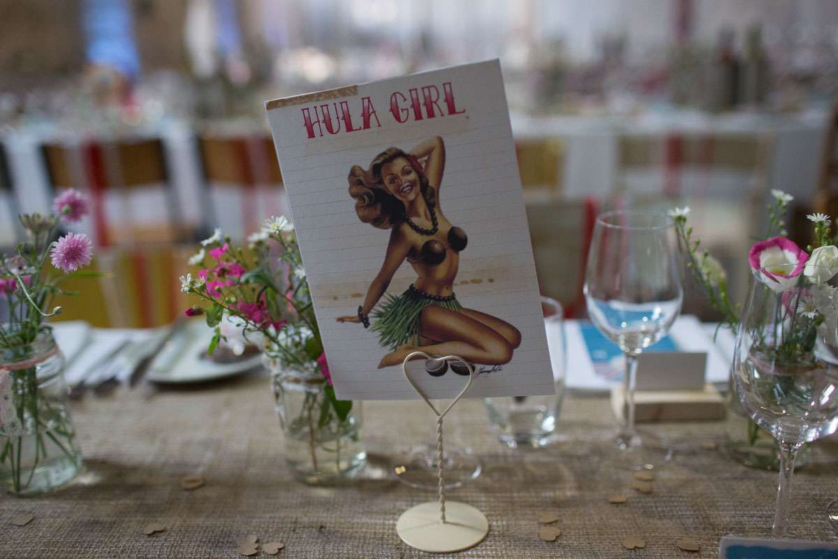 “The day had a hint of 50s inspiration, with a dash of Sailor Jerry thrown in,” they replied when I asked about their theme. “We wanted the day to reflect us and opted for ‘stuff we like’ such as skulls, swallows, flamingos and pineapples! It really was mismatched and a case of anything goes. We wanted splashes of colour and went for shades of pink, red and blue, contrasted by the natural tones of wood and hessian.”
