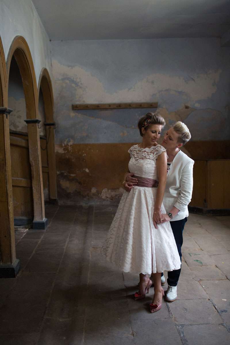 Sadie and Marie were married at Calke Abbey Riding School, a National Trust venue in Derbyshire. They were the first same sex couple to marry here and they fell in love with it’s less than perfect appearance. It was the ideal setting for their alternative wedding.