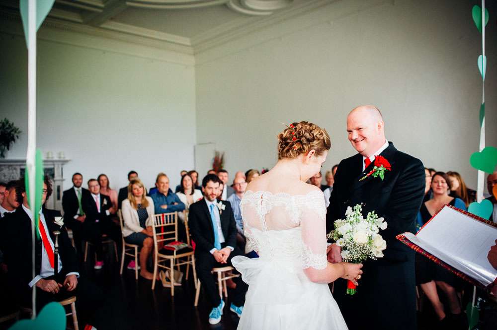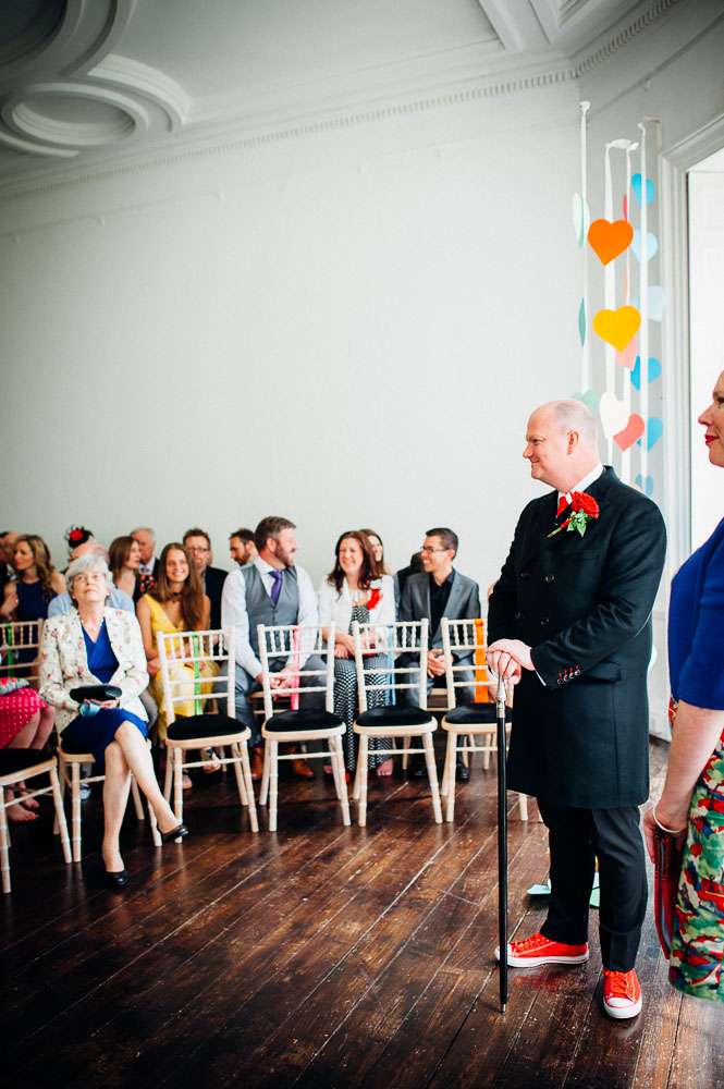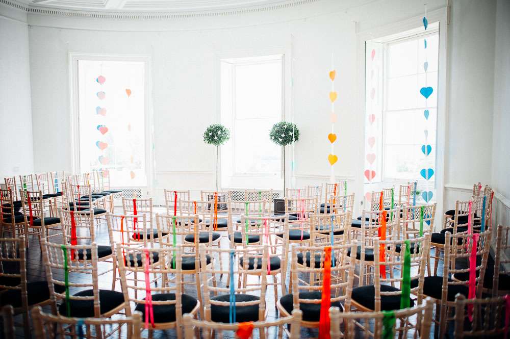 “We named all of the tables in the wedding breakfast after our favourite pubs and bars, and Jo Ramm (chief lady man of honour) created pub signs for all them. They were amazing. She also painted a giant pub sign for the top table starring Barney and Charlie. Charlie made lots of signs with our favourite responses we got from the RSVPs (they were mad-libs which people had to fill in and send back to us) and there were prizes for the best/worst ones, neatest handwriting etc). For the second ceremony, we cut out paper hearts and trailed them from the ceiling around the windows and tied ribbons to the back of all the chairs to add more colour.”
