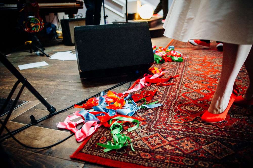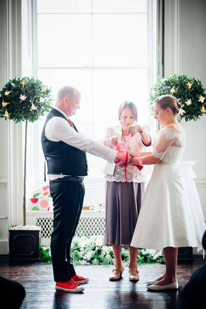 “The second ceremony, the handfasting, was the exact opposite. It took place in Oxon Hoath’s dance studio, which our friends had helped us to decorate the day before, and the key phrase was Rock n Roll – it had to be big, brash, colourful, loud and funny.!Crucially, none of the guests were aware that we were getting handfasted – they had no idea about the civil ceremony in the morning, and so were expecting something far more traditional.”