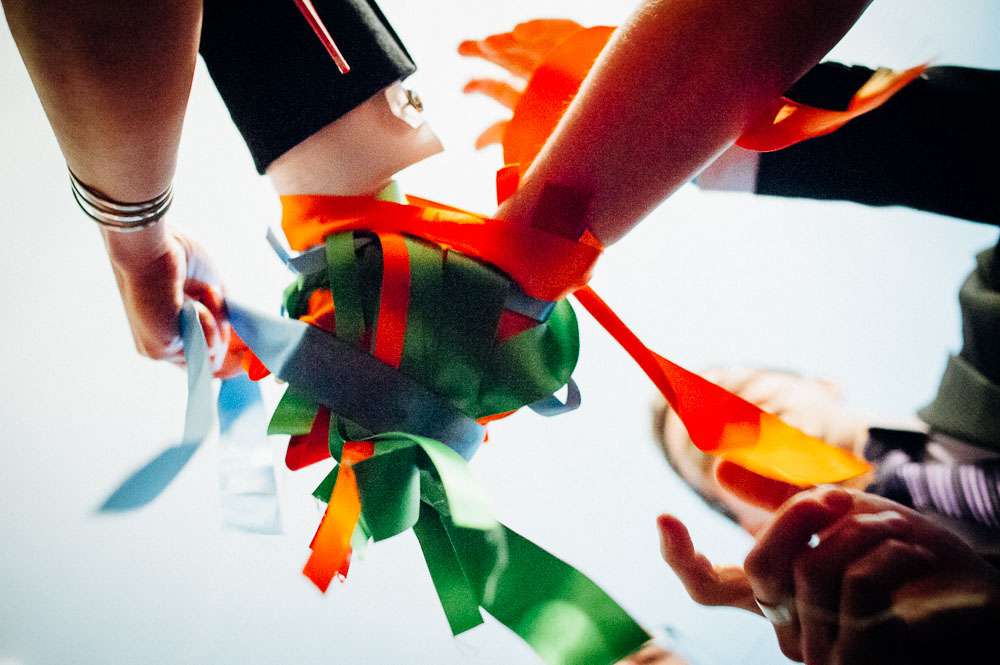 “At the same time, one of the best bands in the area, the Standard Lamps, kicked up a huge howl of feedback from downstairs which rang through the entire house as they started to play an extremely loud set. At the bottom of the stairs, Oxon Hoath staff members were waiting with trays of champagne and Jagerbombs. Yes, Jagerbombs – they proved popular. When everyone was downstairs and partying, we joined them, and invited everyone to help us tie the knot by joining in the handfasting as well – everyone was given ribbon, which they then tied around our hands. In the end we had a huge ball of colourful ribbon wrapped around us.”