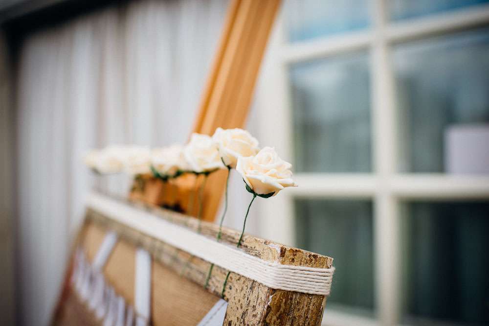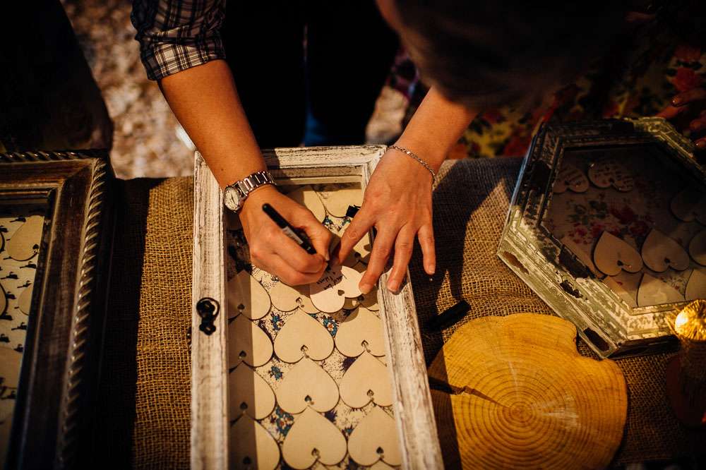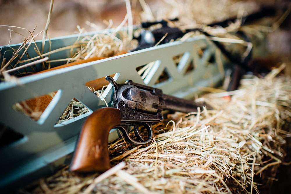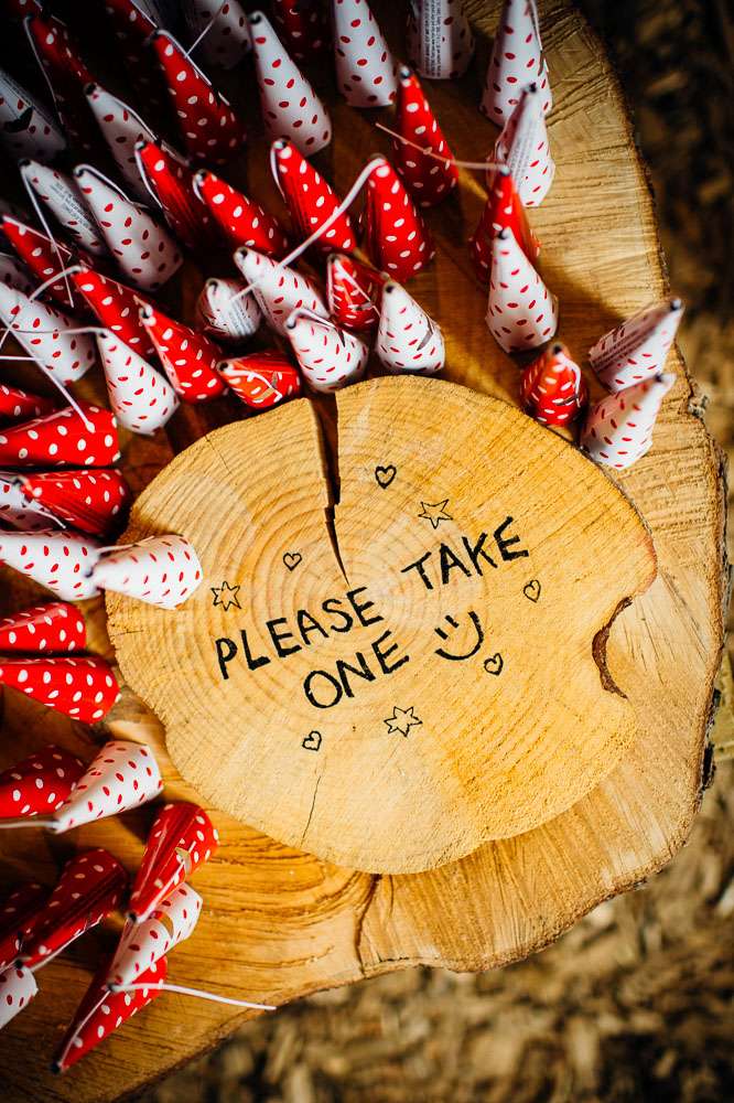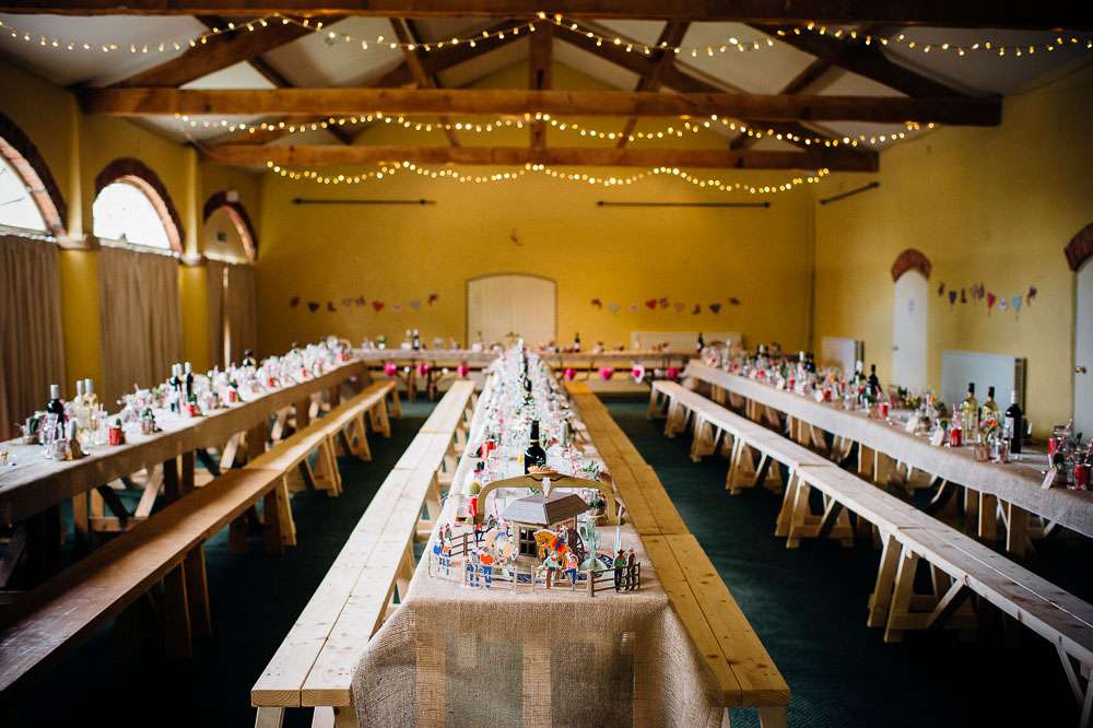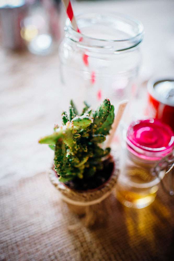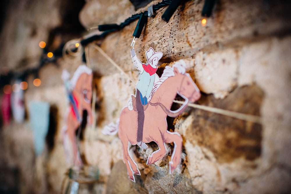 “We got a lot of the western themed cups, plates and centrepieces from The Party Company who were a great help and suggested lots of amazing ideas. Kristian build ten wooden crates, which we stacked up to hold photos and fairy lights. We ‘borrowed’ a giant log from the woods near our house, and I spent hours sawing it into slices to try to create placemats. I got to about five and then gave up, so these were used to decorate the room! The haybales were bought from a local farm, and the hessian was from a local builders yard (really cheap) and most of the other bits were from eBay!”