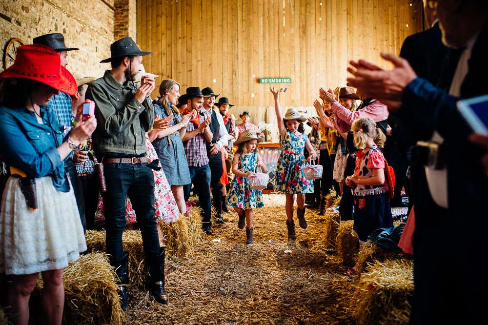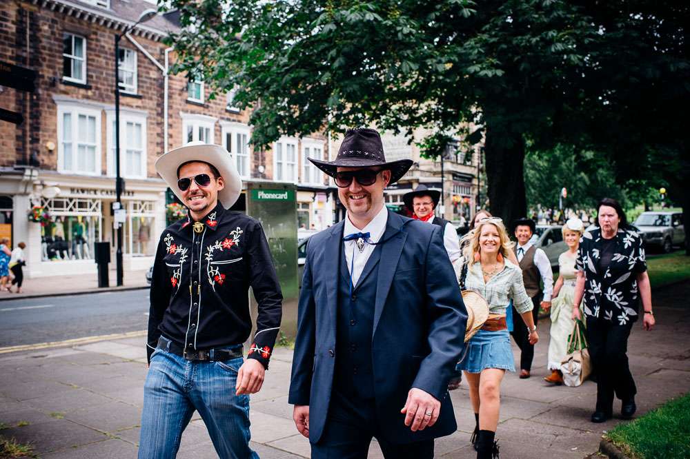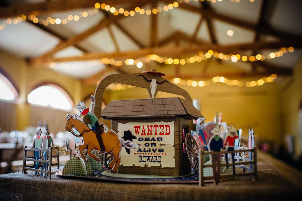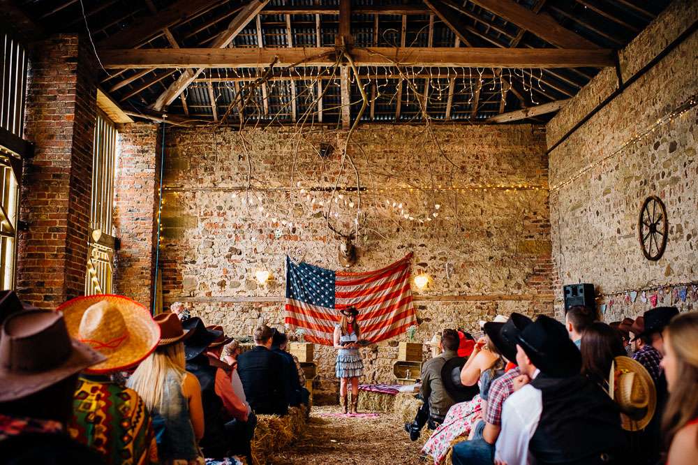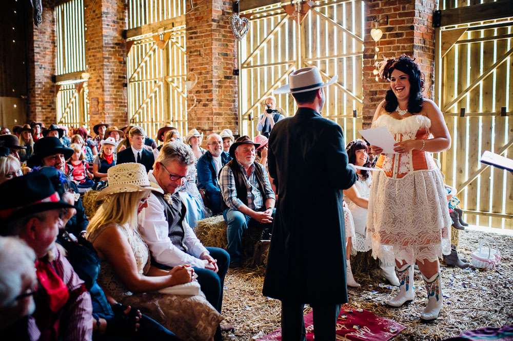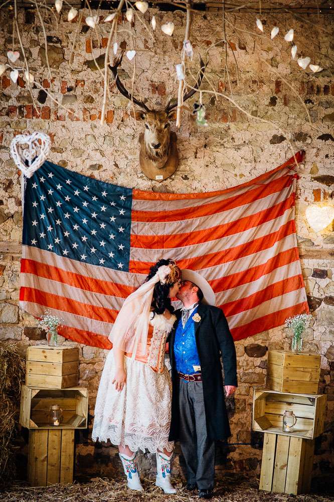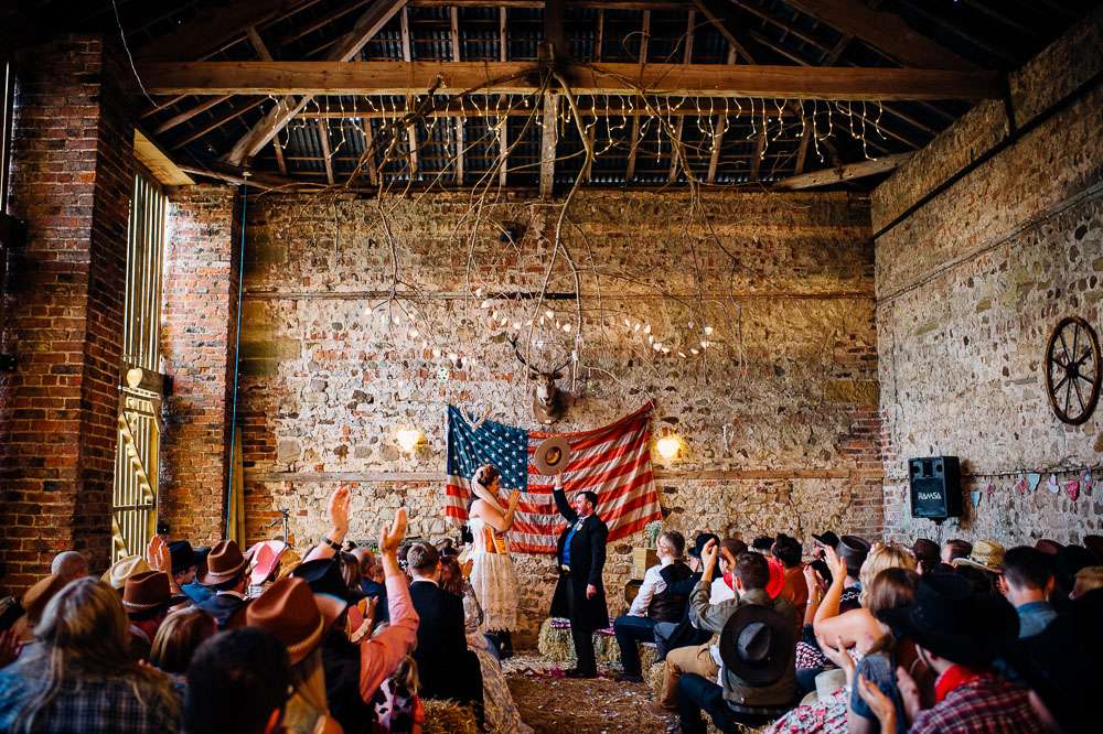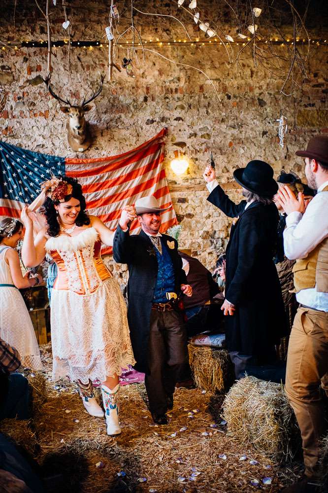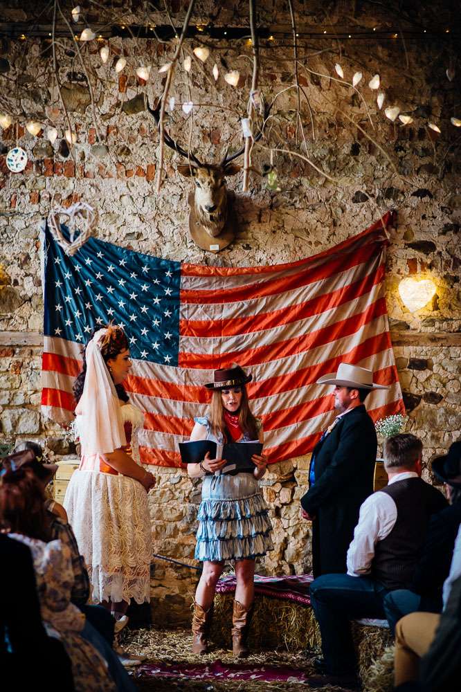 “We went to Nashville TN, and had an amazing time, and thought that the American theme would be hilarious, and stop guests getting bored, or predicting what would happen next”, began the bride. “The cowboy theme came from a joke about getting everyone to dress up fancy dress, and how many we thought would – turns out 110 people did, and only 1 came as James Bond. We wanted it to be really personal, and it certainly was. We are not religious, and we don’t have many beliefs in life, except we are best friends and love the pants off each other – and wanted to show all our friends how much.”