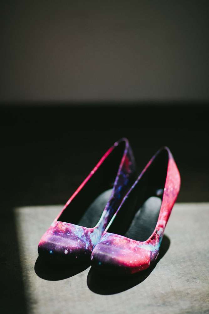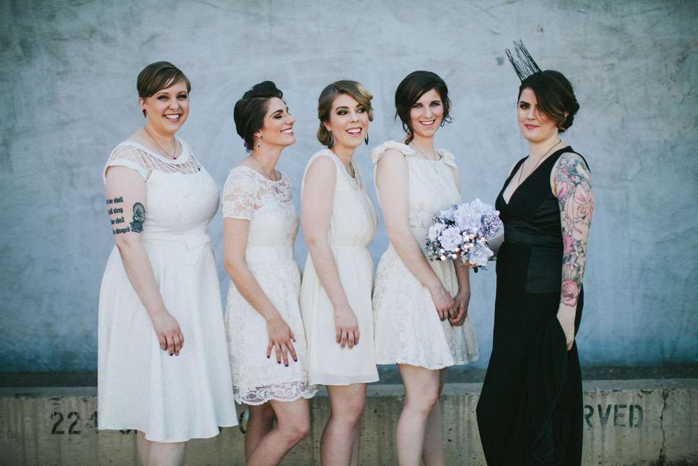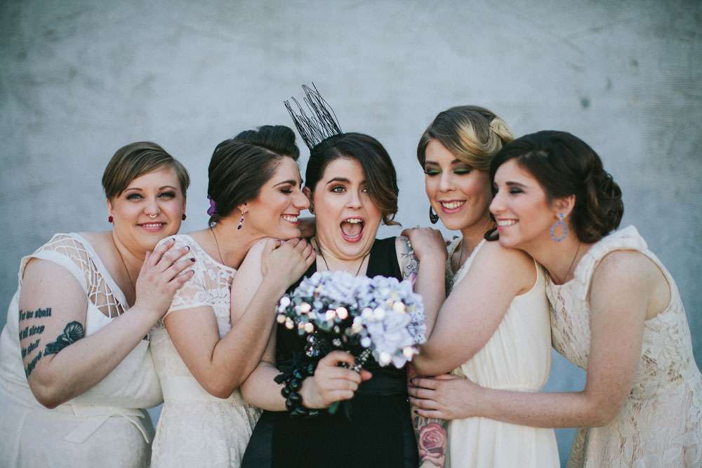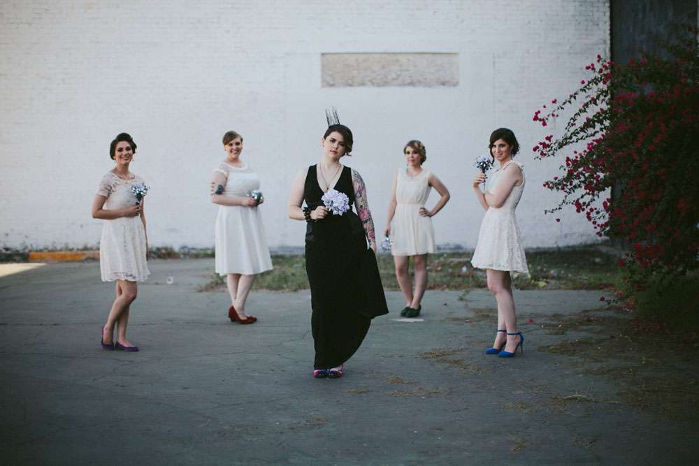 Amy wore a stunning black wedding dress which she had custom made by someone on Etsy (the seller sadly no longer exists) which she wore with amazing galaxy print shoes from Modcloth. Her bridesmaids were the ones wearing white! They all picked their own dresses. “The thing most people have pointed out was the black wedding dress”, she said. “I chose black for my wedding dress because I wanted something I was comfortable in, and I like the way I look in black.”