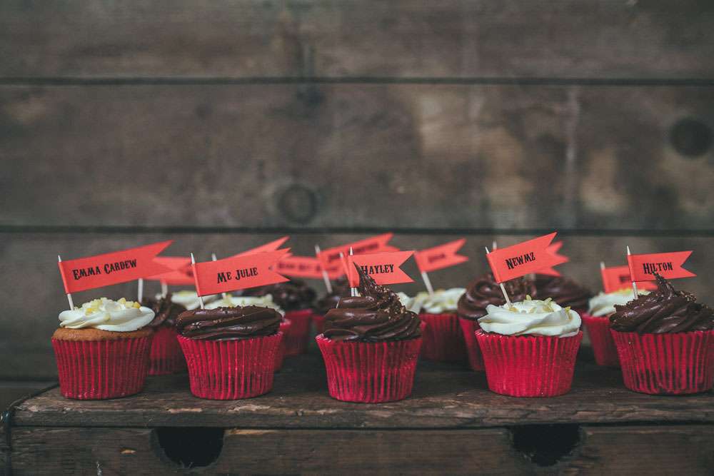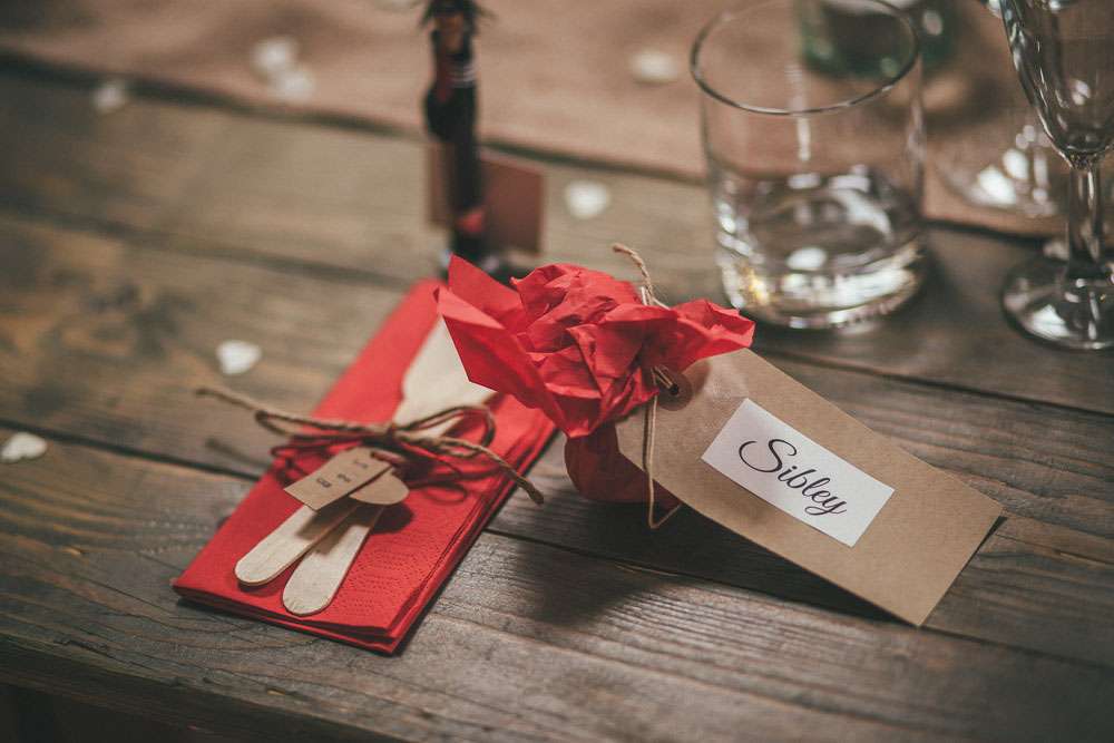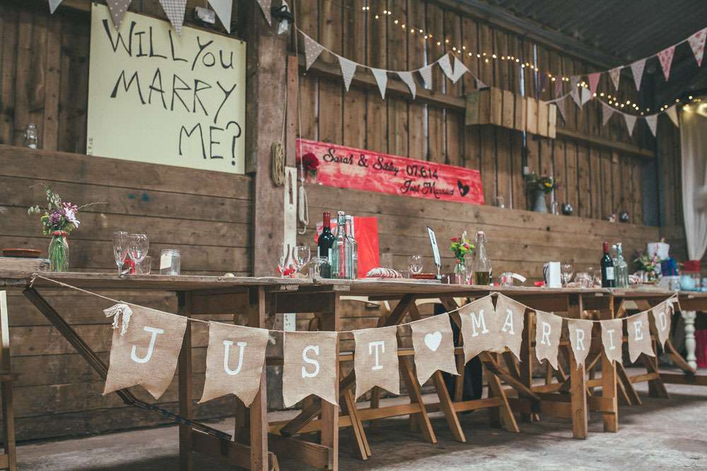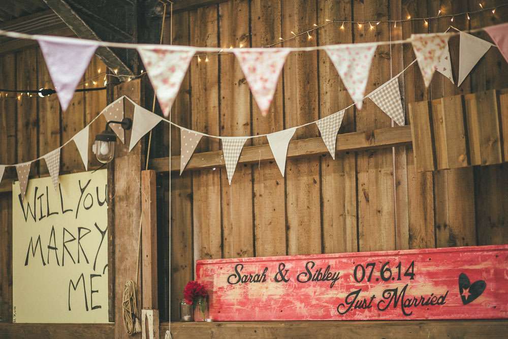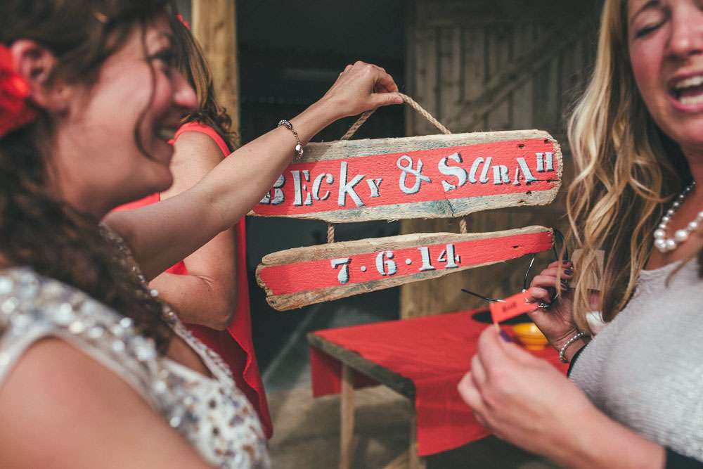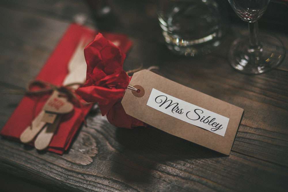 “All our invites, the table plans, table decorations, our order of the day, all our signs we made by us. We made stencils and spray painted them onto old scaffolding boards. We also used old floorboards and treated, sanded and painted them in red and grey to use used them for our breadboards. Both the signs and boards came out really well and have since been used to decorate our garden!”
