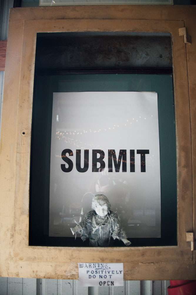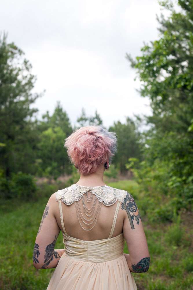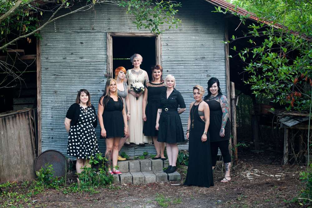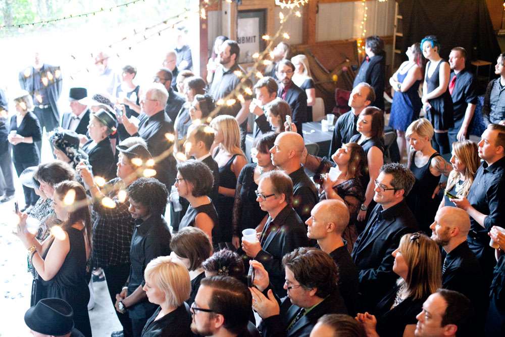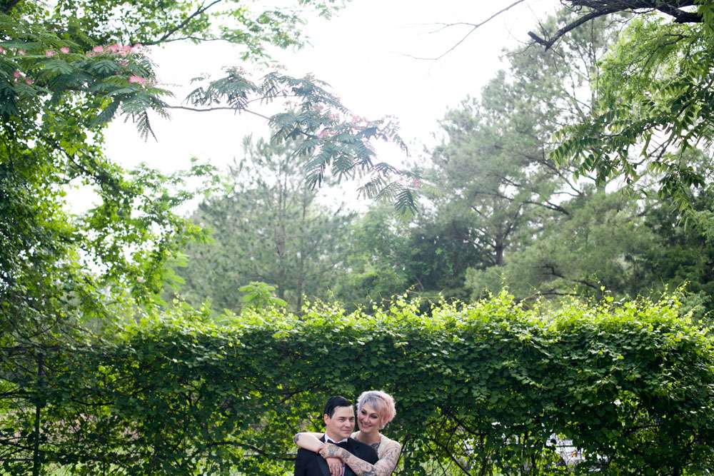 “Literally everything but the food and a few decorations we did on our own. Originally we were going to get married outside, but the weather called for rain. So we had to quickly organize and decorate a corner of the building we were having the reception in so it would be photo ready. We nailed rope to wooden posts in the corner like a clothesline, draped black sheets and thrifted white lace table cloths over the rope for a backdrop, and scattered the floor with black silk rose petals and it worked perfectly.”