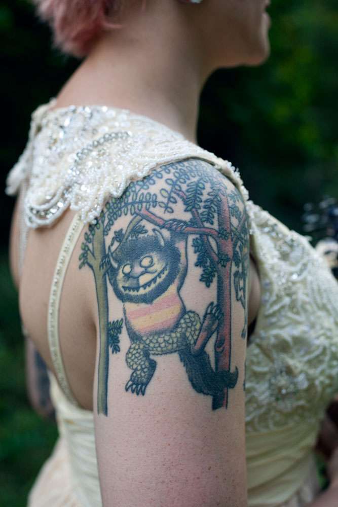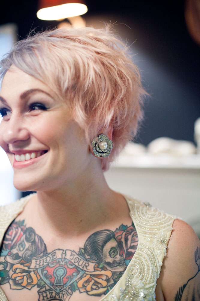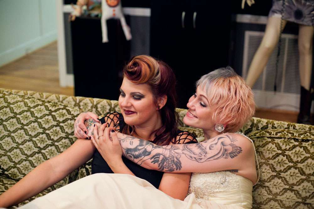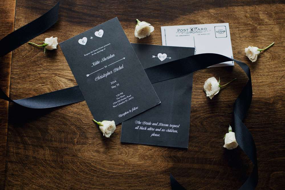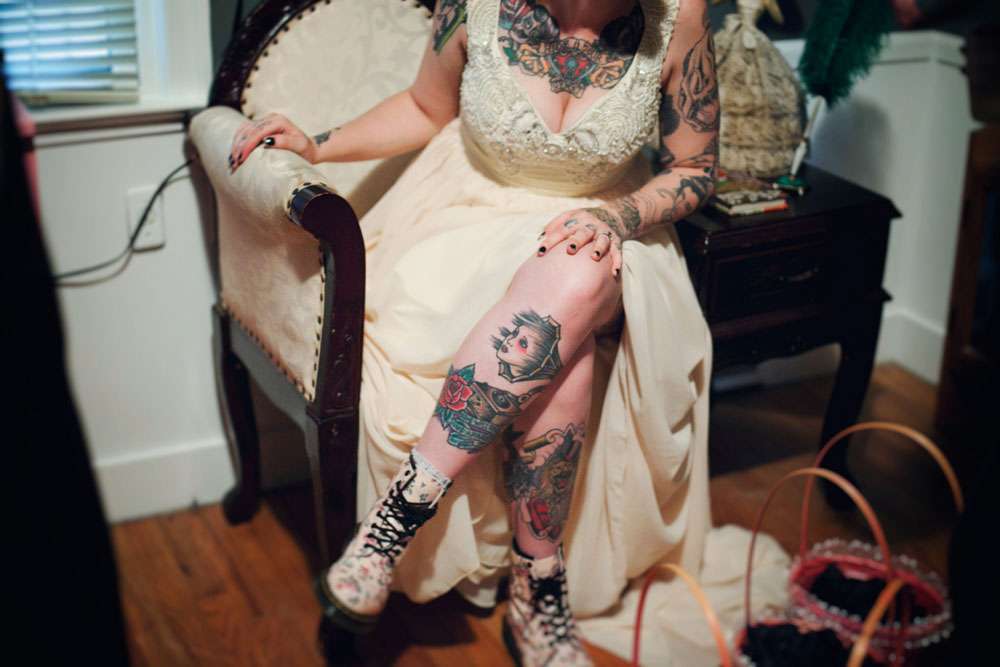 Katie and Christopher dropped just $1000 on their amazing wedding. They hosted it in their own home, the bride bought her dress online and the reception décor was put together by the couple themselves. They had a bubble machine on the ceiling, costume accessories, creepy mannequins, sparklers and black silk petals. Their seating was all thrifted to save cash.