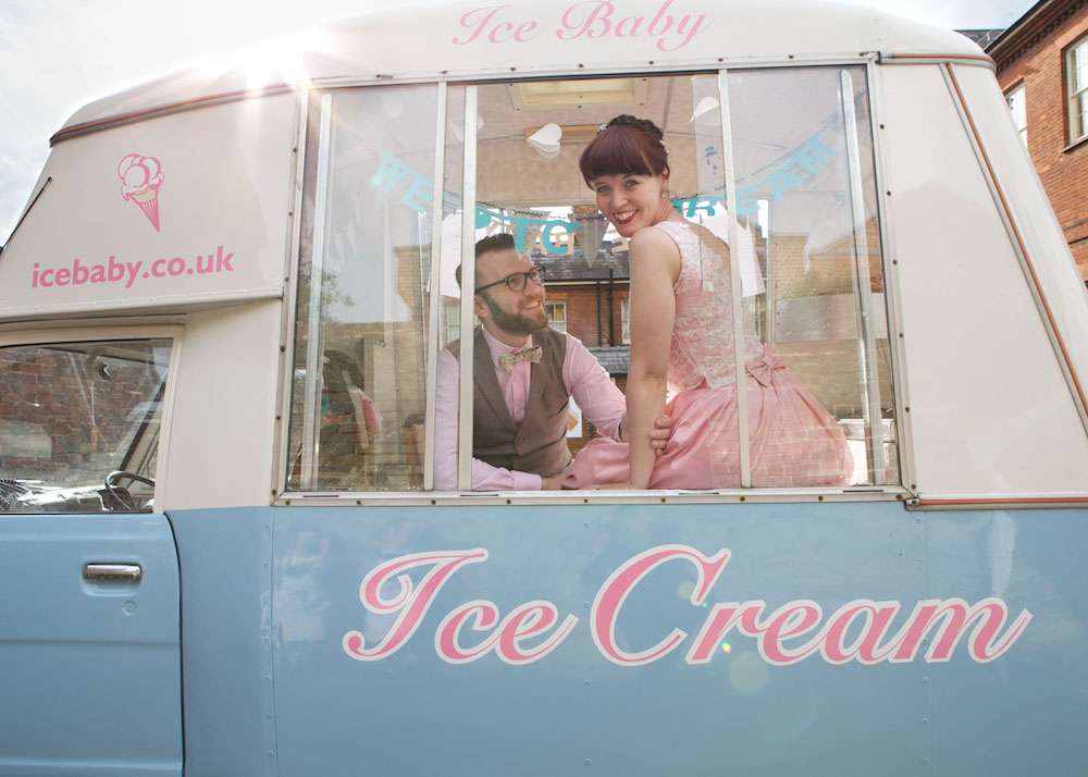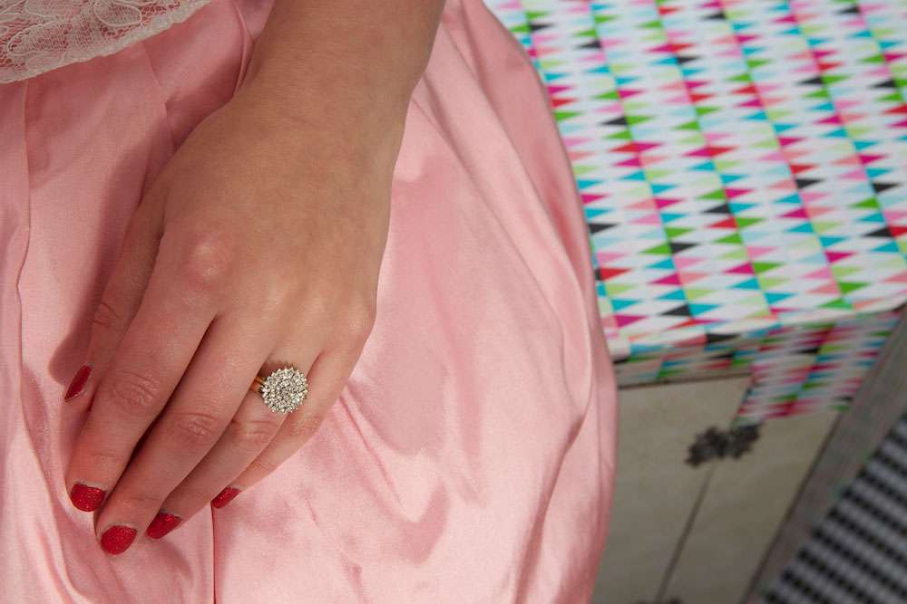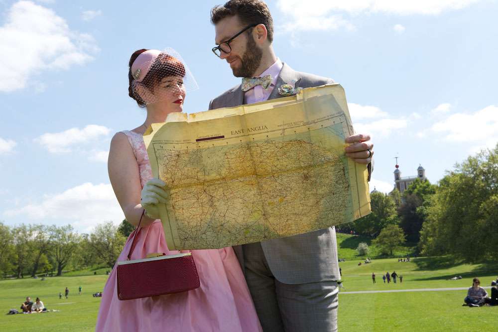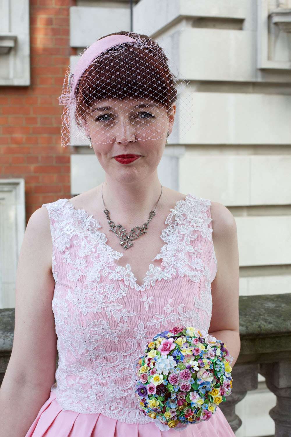 Emily and Adam were married in May in Hitchin. Their wedding had a vintage travel theme and was full of DIY details. The bride made her own dress from Nottingham lace and Indian silk which she wore with a DIY birdcage veil. Her bouquet was also made from around 50 antique fine bone china flower brooches, collected from various charity shops and car boot sales throughout the engagement.