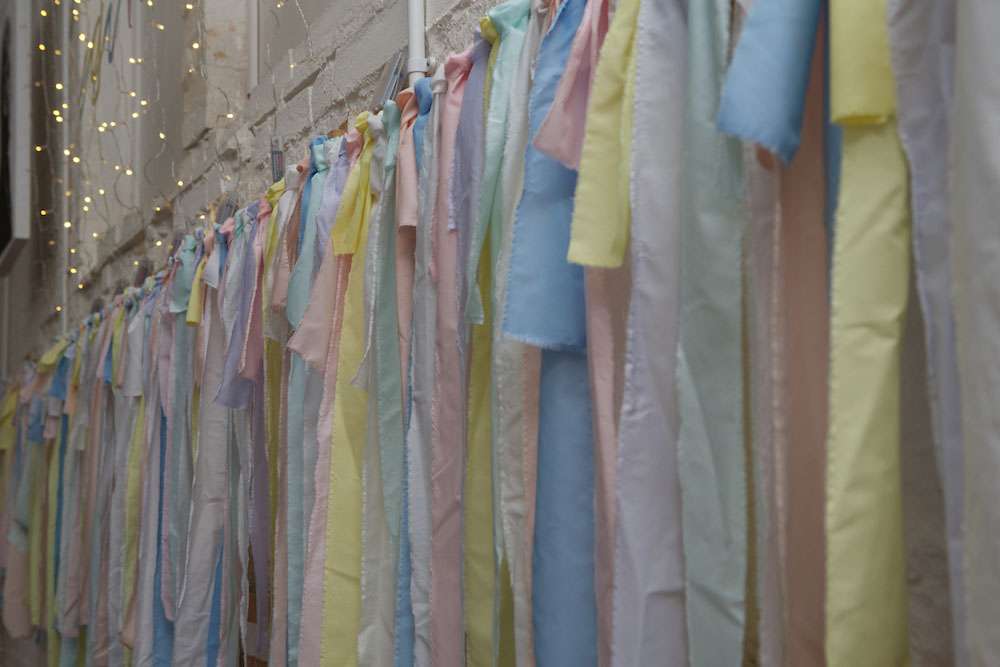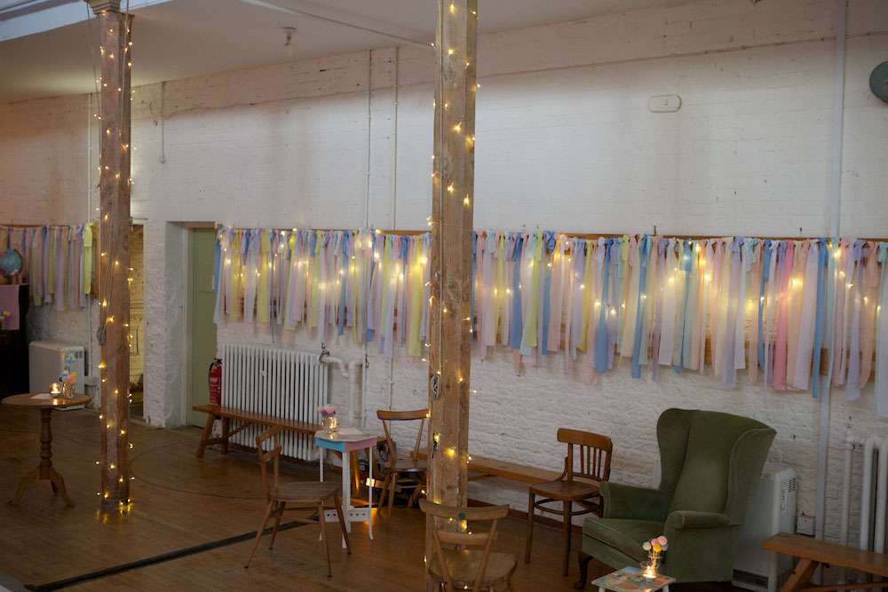 “We did a lot of DIY obviously”, she explained. “We’re pretty crafty anyway, and we had a big job to transform the venue. We couldn’t have afforded to have hired in enough décor and the bonus of making things ourselves meant that it could be a bit different and exactly what we wanted. The ribbon banner was pretty time consuming and we both got rather bored of tearing up the fabric to make all the strips to tie onto the string. The effect was worth it though, especially for how little we spent on it compared to if we’d bought something.”