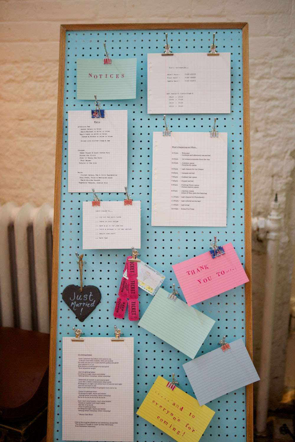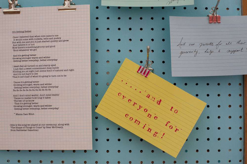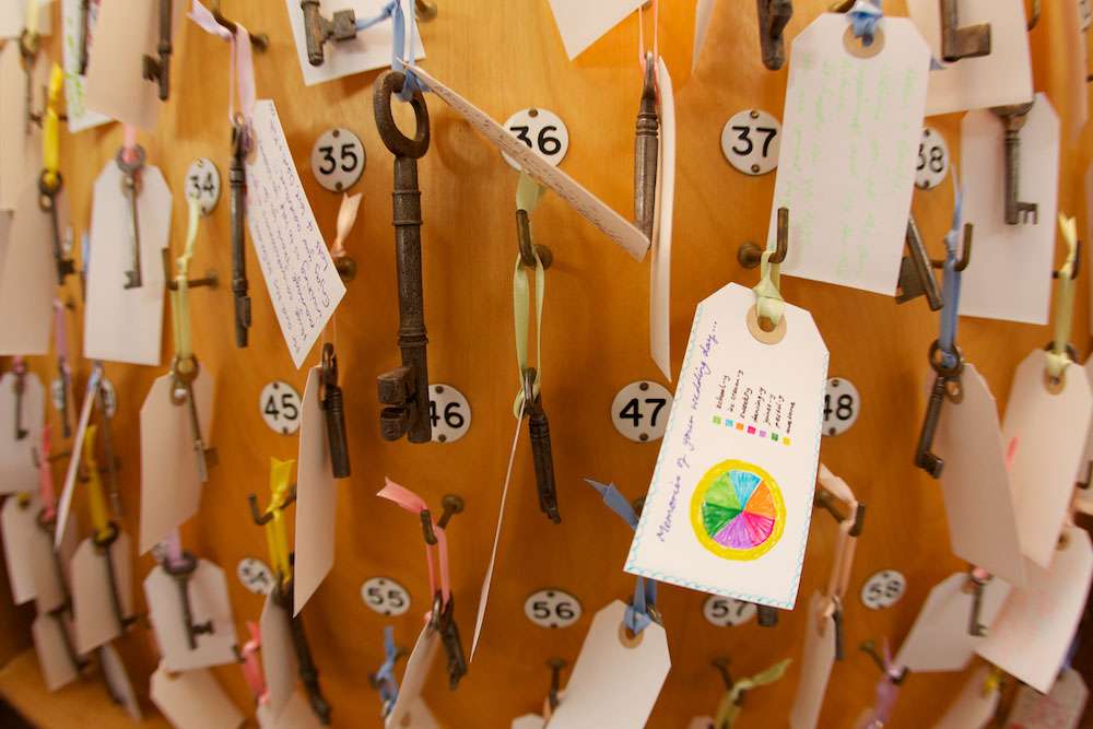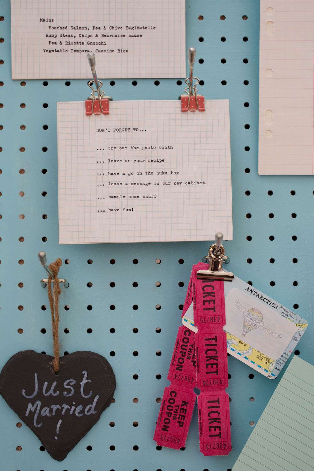 “We keep a guest book at home so wanted to do something a little different for people to leave messages. We looked at some great ideas on Pinterest but when we saw an old hotel key cabinet on the market one day Adam had the amazing idea to use it as a sort of guest book. We collected old keys and painstakingly cleaned them before attaching them to luggage tags with ribbon in our colours. Guests then got to write a message on them and we’ll be able to hang it on our wall as a lovely reminder of the day and all our wonderful friends who were there.”