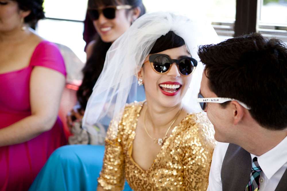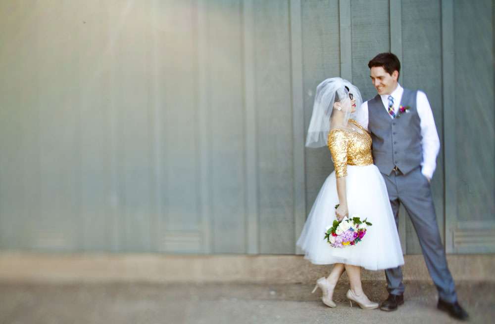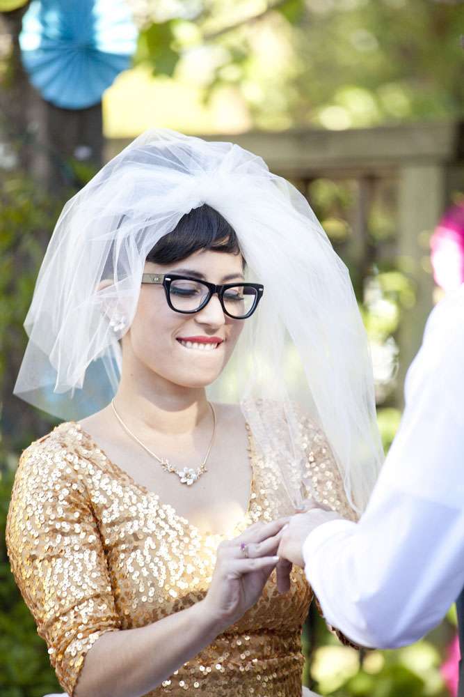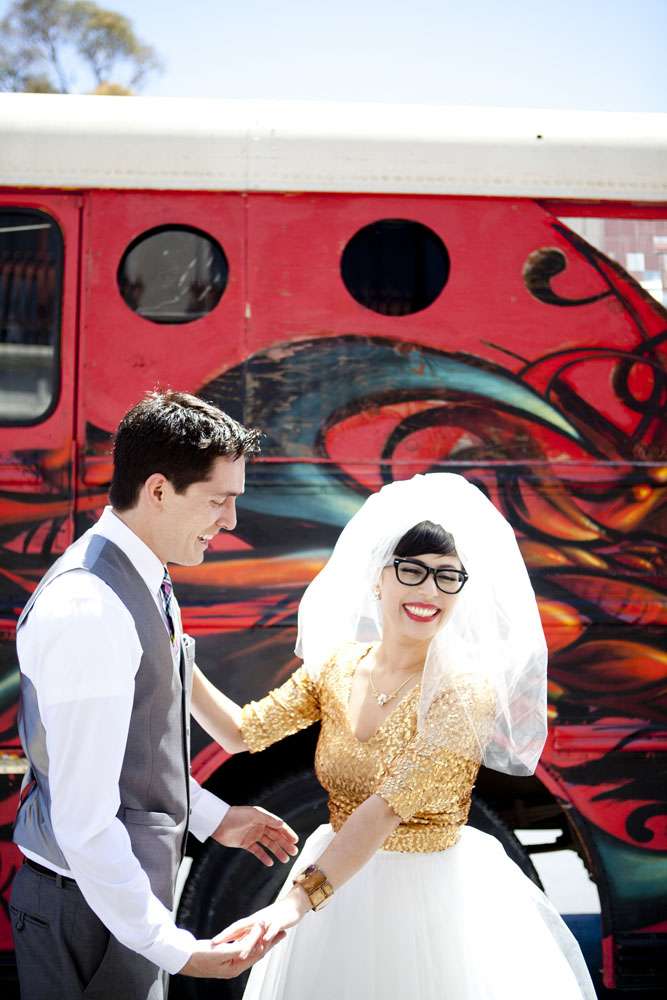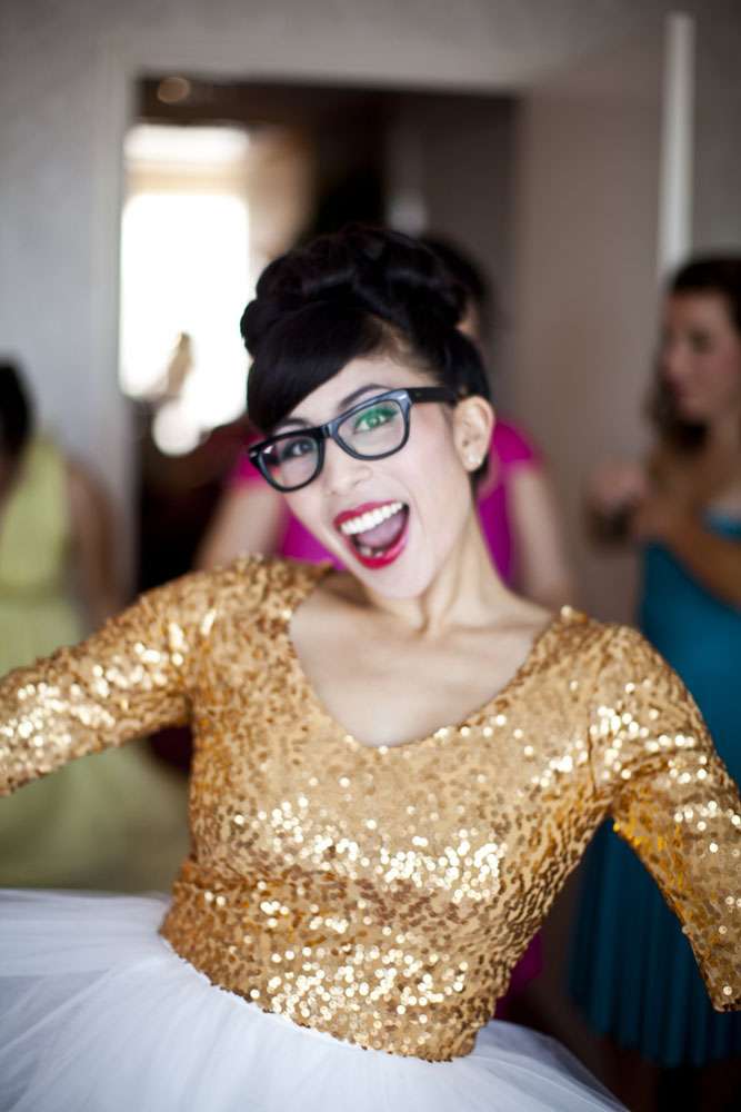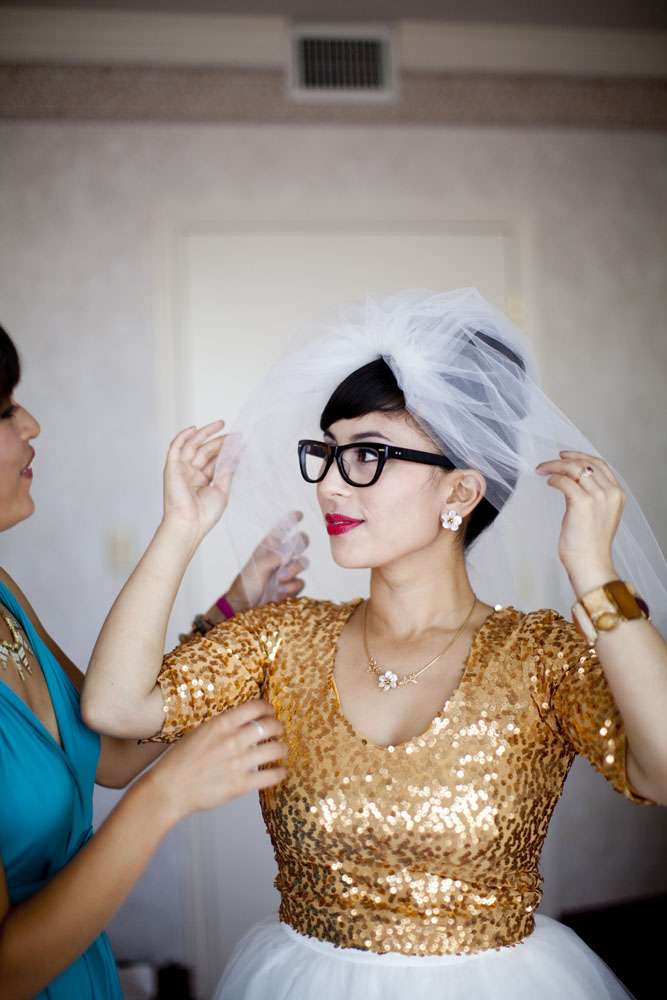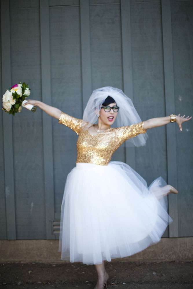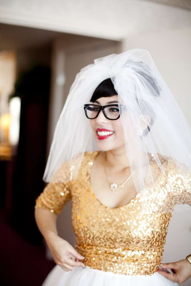 Stand by for probably the cutest bride I’ve seen in a long time. Rocking a gold sequinned bodice, a ballerina style skirt, retro fabulous glasses and the most adorable poofy veil, this is one babe who’s got her bridal style darn right perfect.