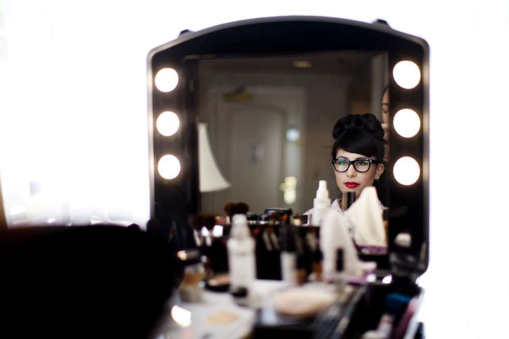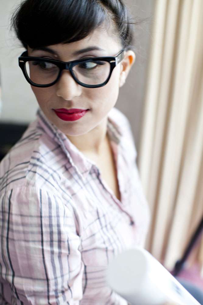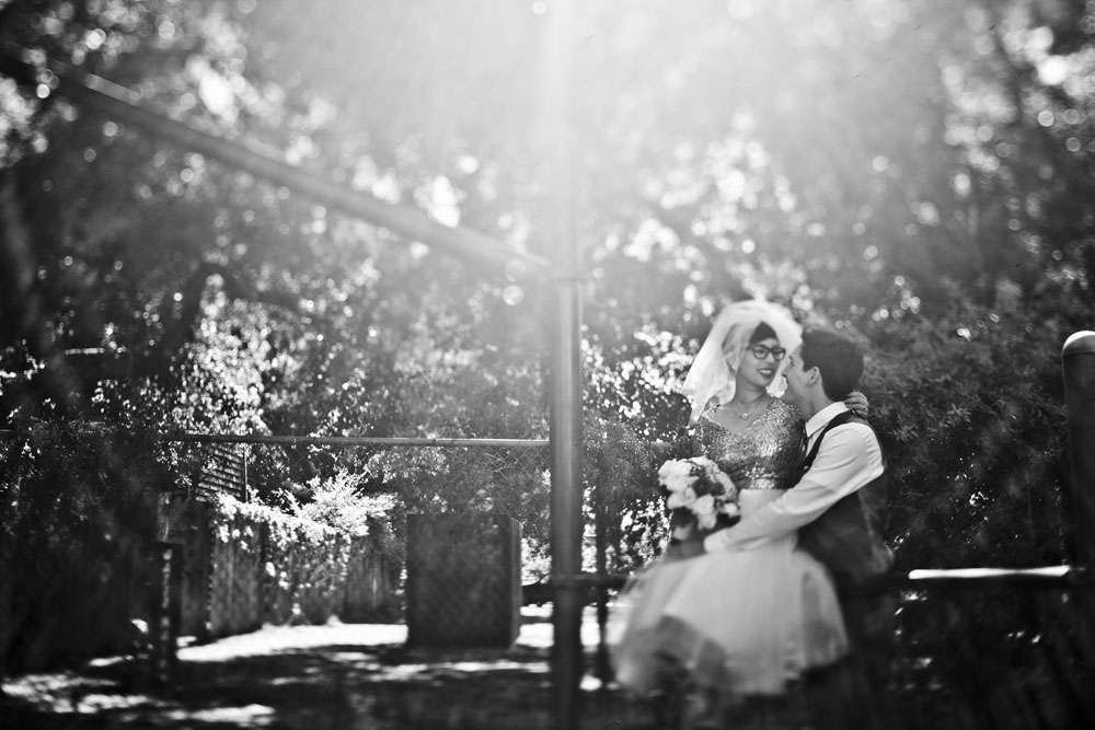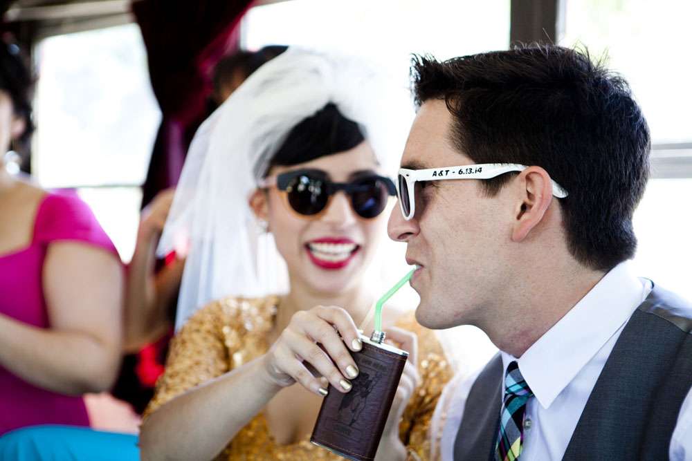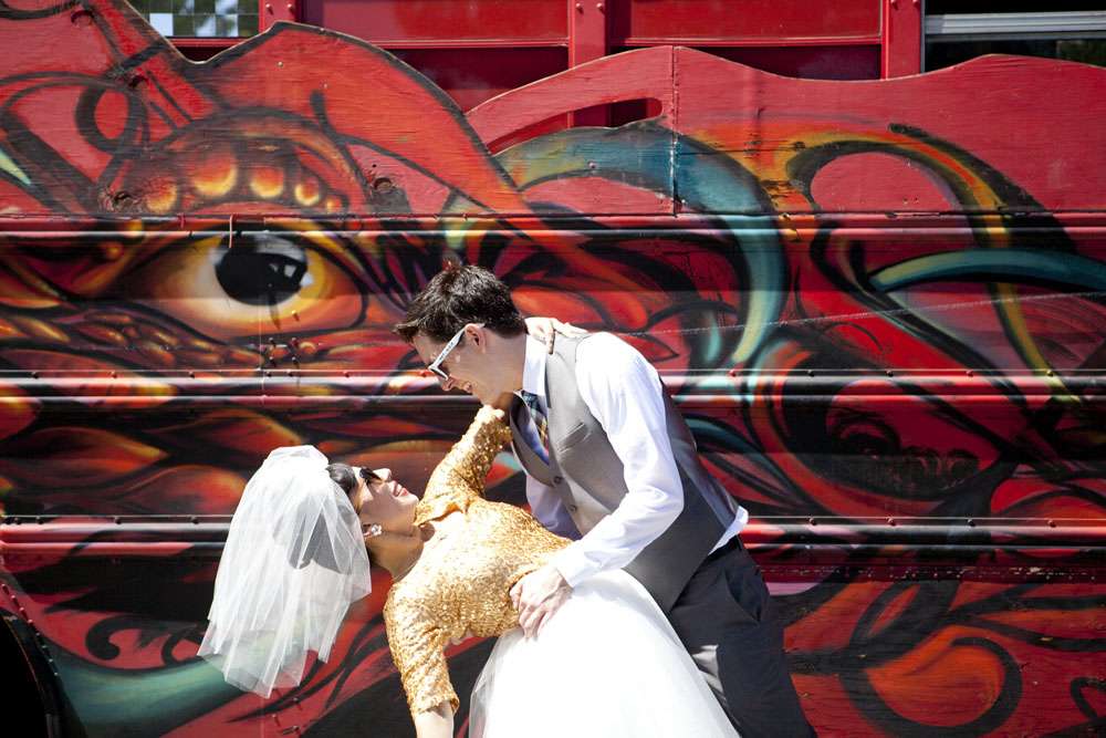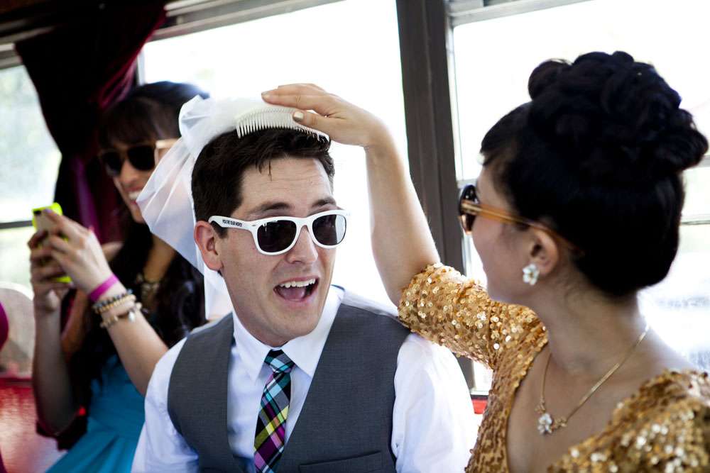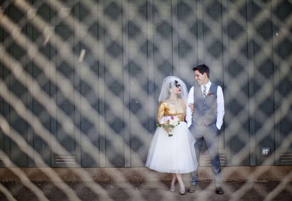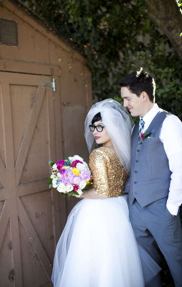 Stand by for probably the cutest bride I’ve seen in a long time. Rocking a gold sequinned bodice, a ballerina style skirt, retro fabulous glasses and the most adorable poofy veil, this is one babe who’s got her bridal style darn right perfect.