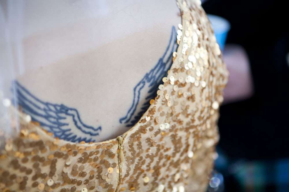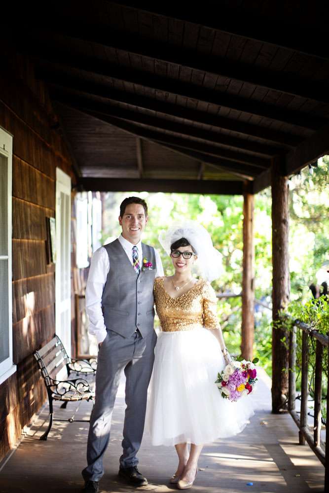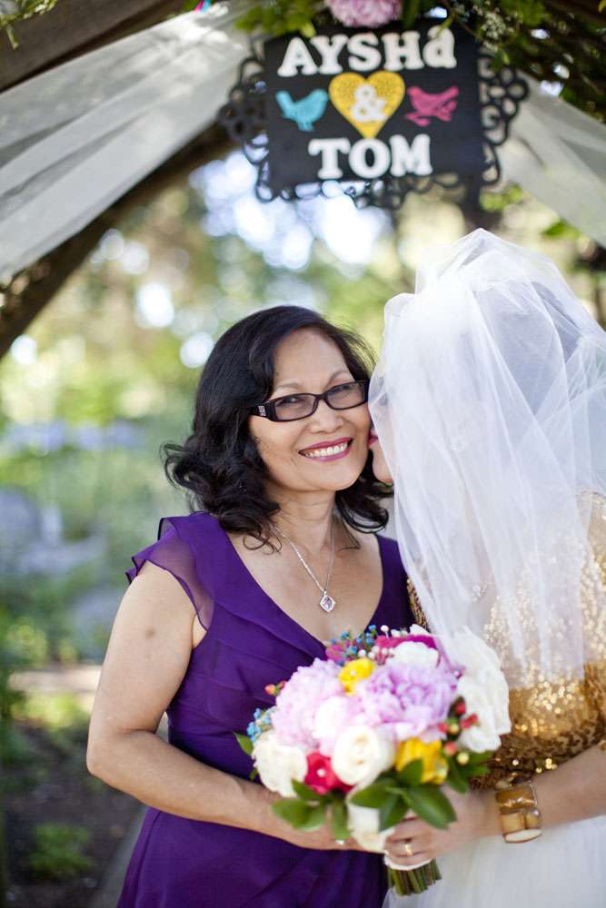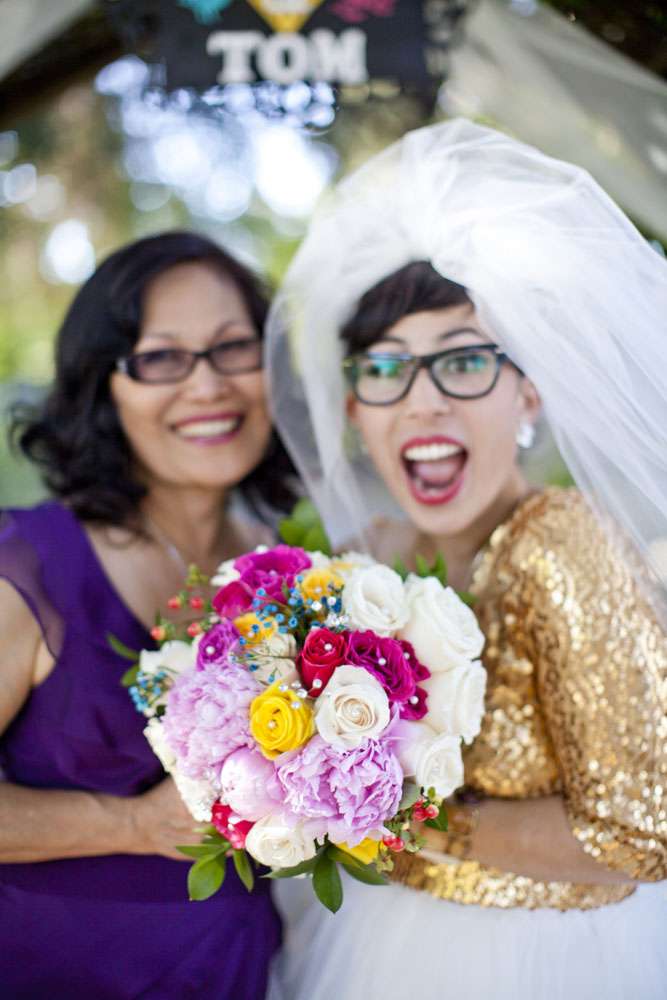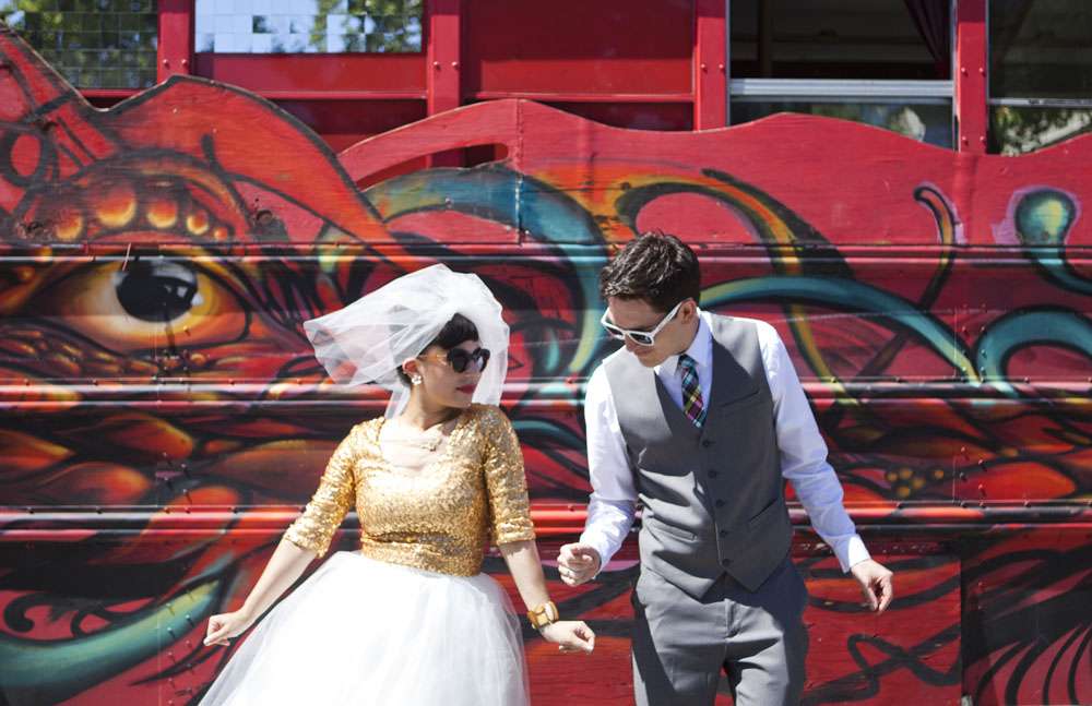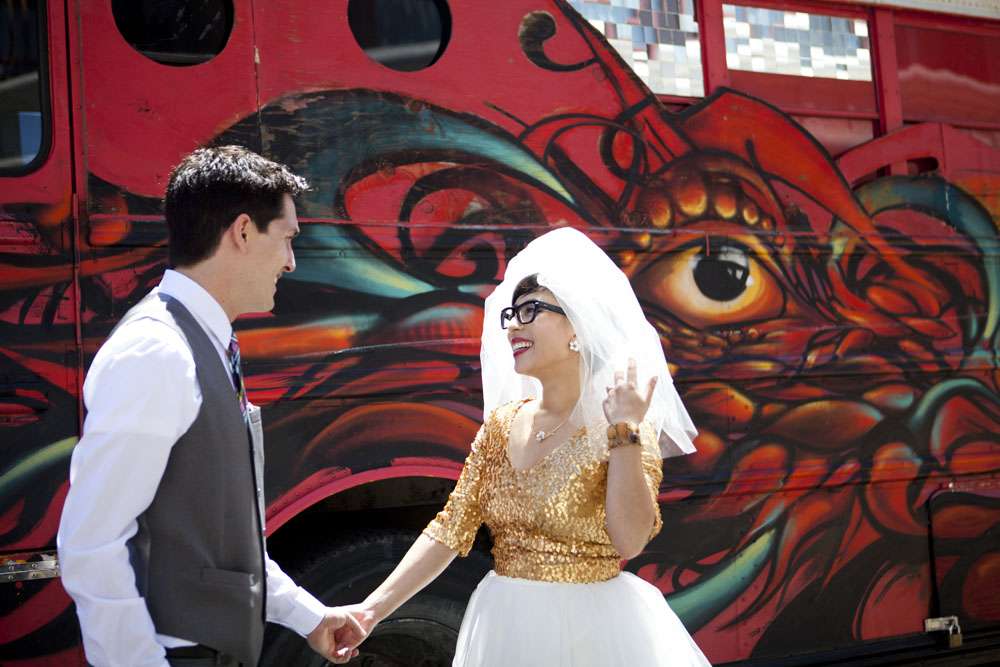 You’re not going to believe this, but Aysha’s envy-inducing wedding dress was actually DIY and she only decided on it the morning of the wedding! OK now I officially love this brideg even more! “I didn’t have a wedding dress until the last possible second and it wasn’t for lack of trying!” she explained. “I had checked out tons of online shops and went to stores but couldn’t find anything I liked. I had something very specific in mind: retro A-line shape, gold sequins, sleeves, shorter length, piles of ballerina tulle. So for me, it was disheartening seeing dresses that were all some variation of all-white, strapless, floor-length, or mermaid silhouette. A couple of weeks before the wedding, I settled on a dress that I felt tepid about. Finally, on the morning of the wedding, I tried a Frankenstein experiment by chopping a gold booty dress in half and sticking it on top of a white tulle skirt. Suddenly BOOM — the wedding dress I had envisioned, three hours before the ceremony!”