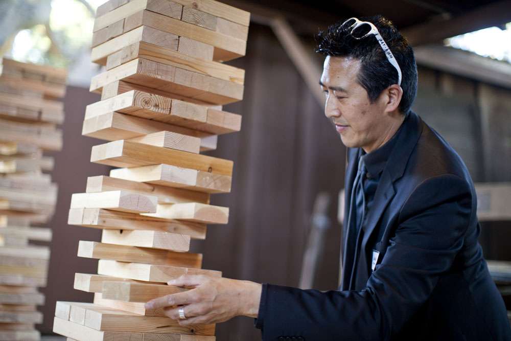 “There was plenty of other DIY in the wedding too”, said Tom. “Lots of people came together to help. My younger brother works for Habitat for Humanity and built a lot of amazing things for us, including two sets of giant Jenga and a photobooth in our wedding colors. Thanks to one of our groomsmen, we had our own slideshow software that populated a database with all the photobooth pictures, plus the photos posted online with our hashtag. The software organized these photos into a looped slideshow, which we projected onto a wall by the dance floor. So many other people helped with bringing these kinds of projects together, like folding a million pinwheels or going on a last-minute prop run.”