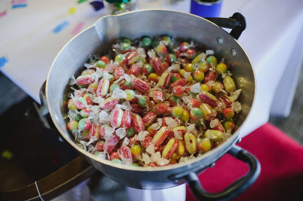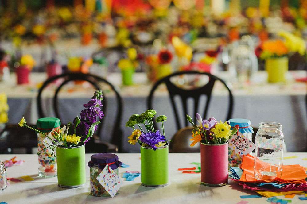 “The wedding was one big DIY project from the beginning. We made the wedding invites, the giant streamer installation, wedding favours and lots more bits and pieces. We even grew our own flowers! Our friends and family were a great help setting all our decorations up and clearing up after too. We did a supermarket shop for snacks, desserts and soft drinks to save going through the caterer. We had no DJ we made our own playlist and just hired in sound and light equipment which worked really well. And BYO booze!”