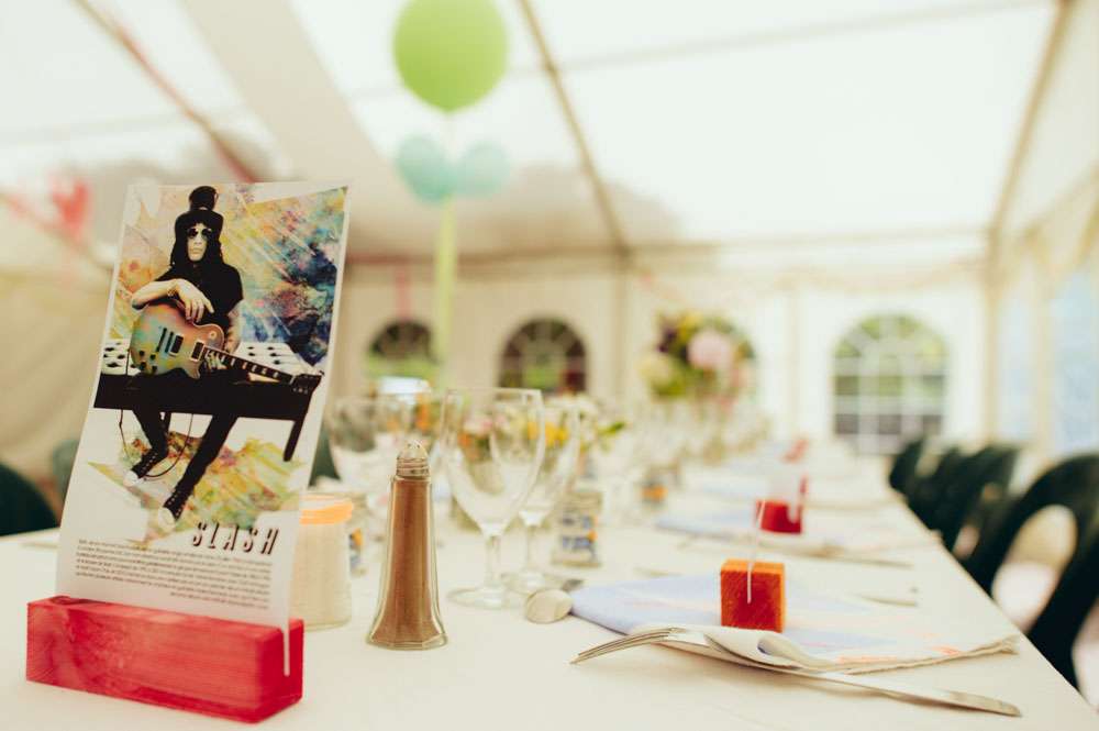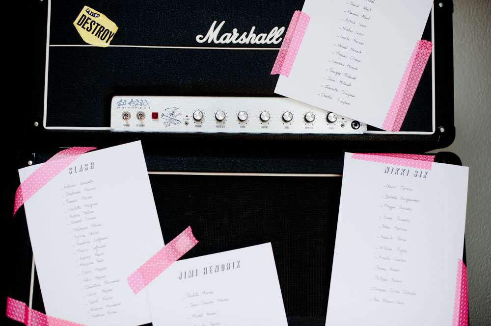 “The décor reflected us completely, which is what made our wedding unique”, he continued. “There was my full guitar amp at the entrance of the venue to display the guest list, and each table had the name of a rock star. Part of the roof was covered with balloons and we had two massive custom coloured curtains set up in one end of the main room. The 200 napkins were screen painted by ourselves too.”