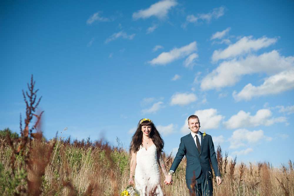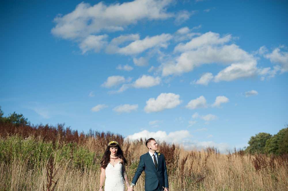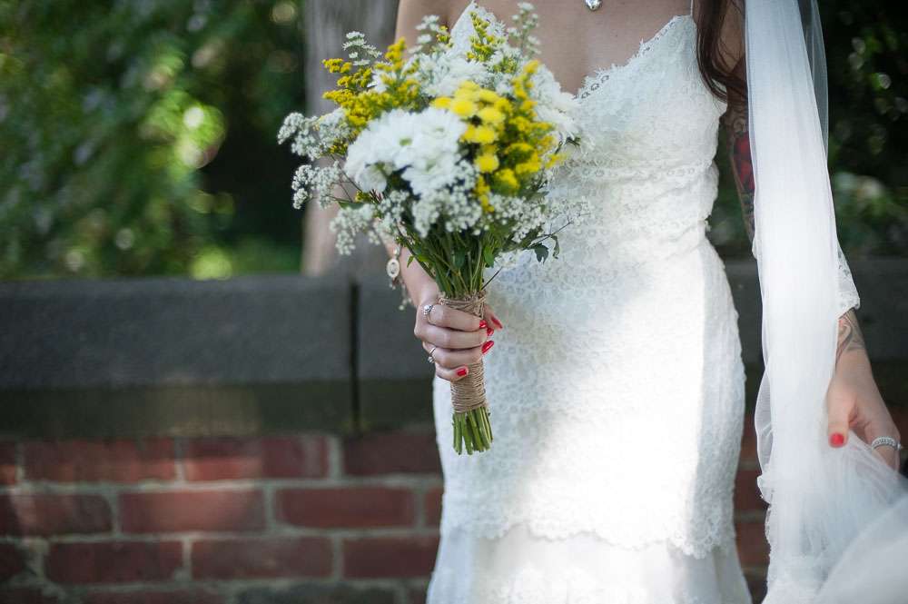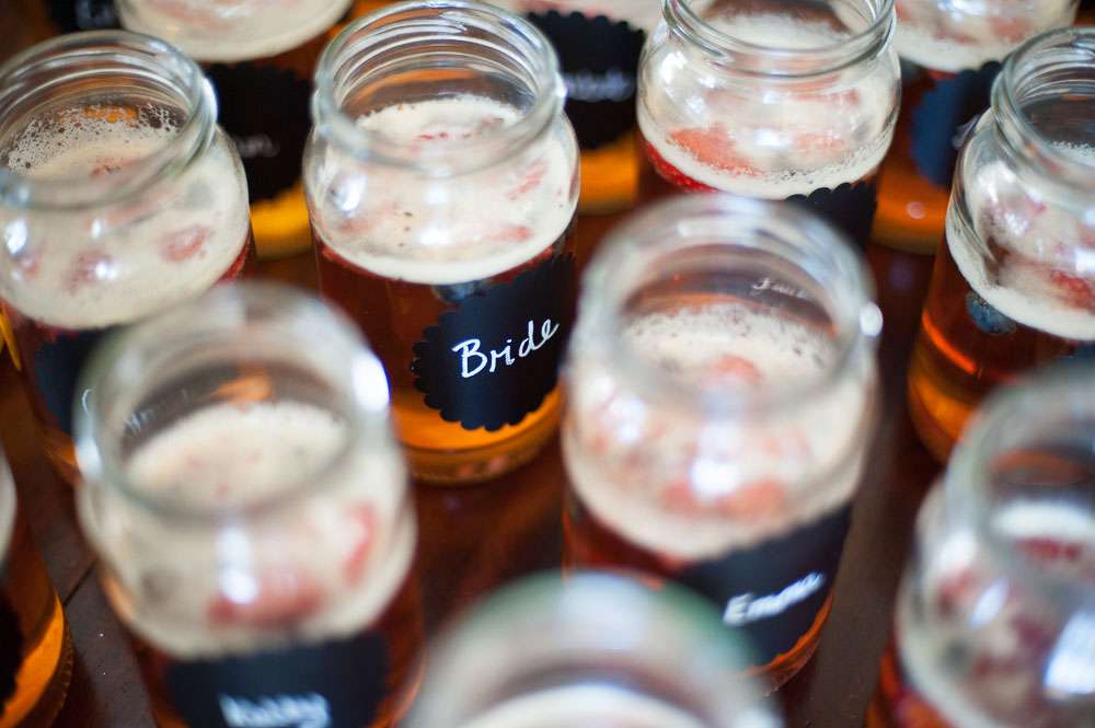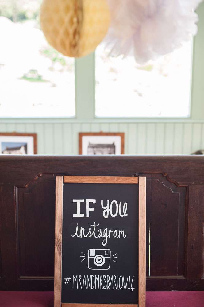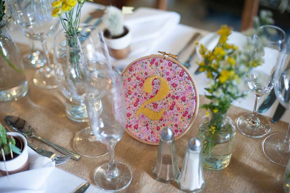 “We didn’t plan to have a theme as such, only that we wanted almost everything to be handcrafted by ourselves”, she continued. “It’s funny because looking back at the photos we ended up having a theme in the end. Our wedding ended up being rustic and a little vintage inspired as we collected a lot of old bottles and trinkets for our flowers on the tables. We had hessian table runners, family photographs, mismatched bunting that we made from scrapbook papers, an old typewriter as our guest book and table numbers that were hand embroidered by one of the lovely bridesmaids Laura, to name a few of the details.”