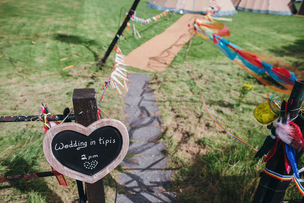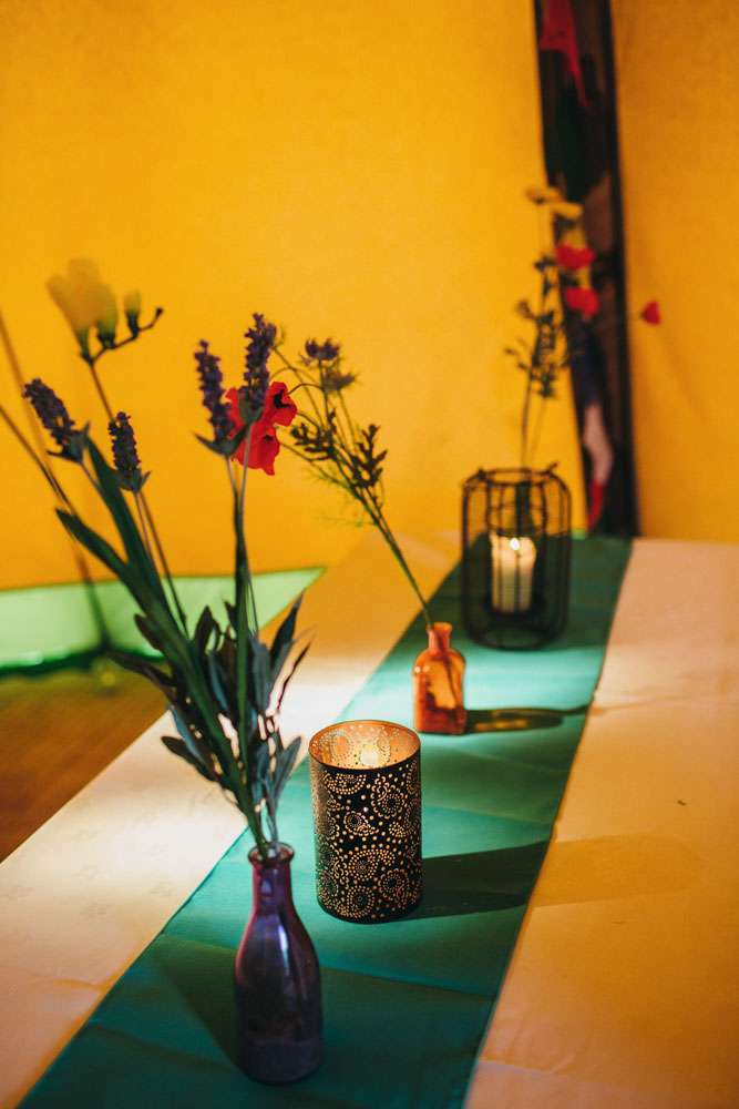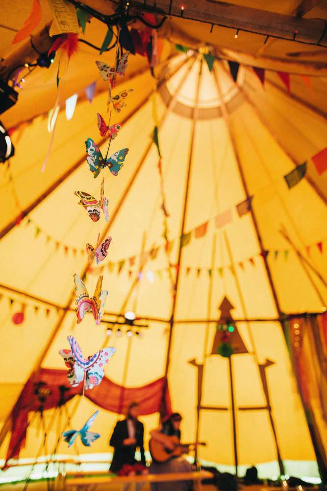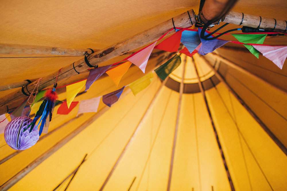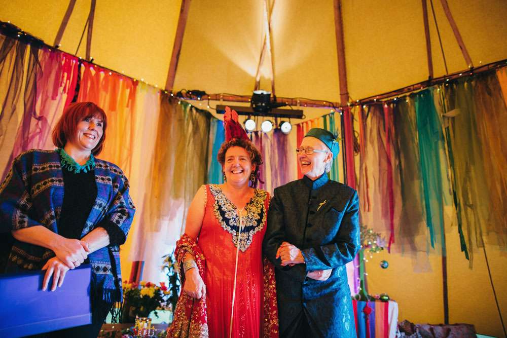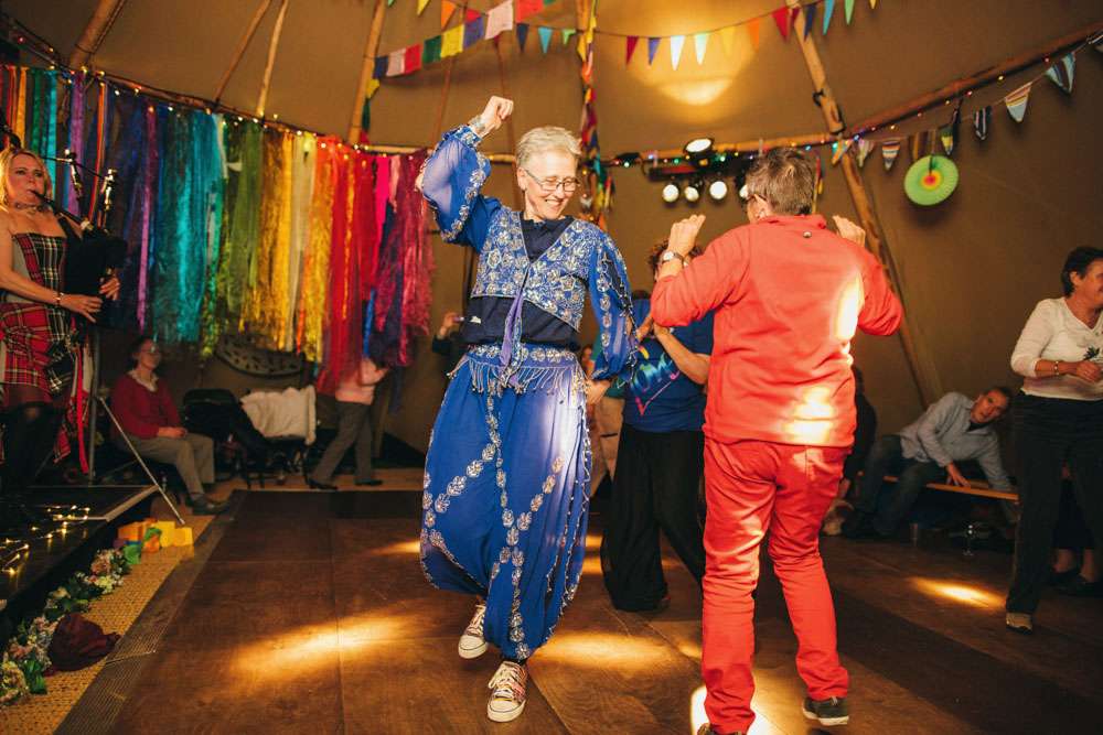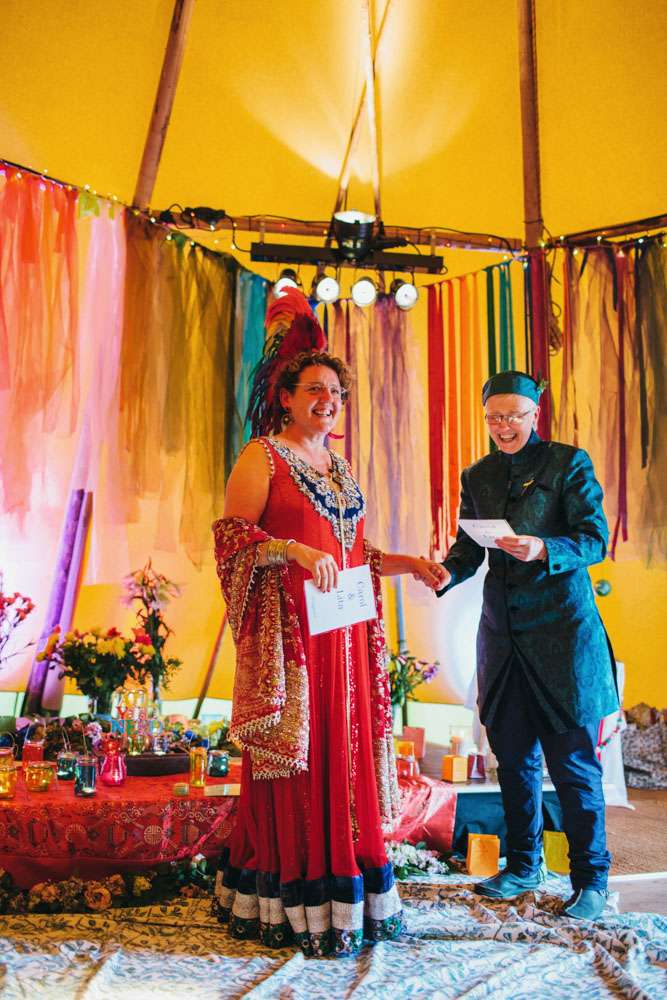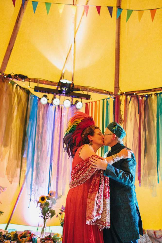 “In terms of décor, we had hand painted lots of jars and bottles and put these around with candles and flowers in”, they continued. “We had lots of rustic candle holders dotted around, as well as second-hand saris weaving around the tipi walls. We wanted to recreate an authentic ‘love is happening’ feel to both tipis. We are both nearly 60 years old and so we wanted to share the ‘all you need is love’ experience of the 60s and 70s with our guests, some of whom, were too young to have been there first time around!”