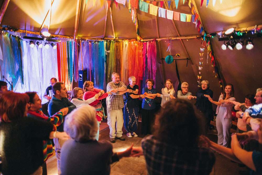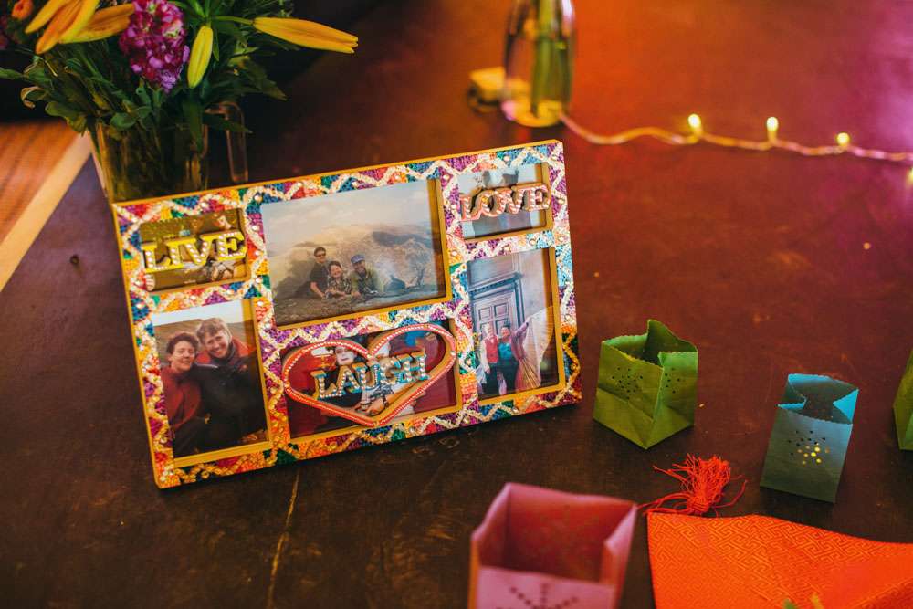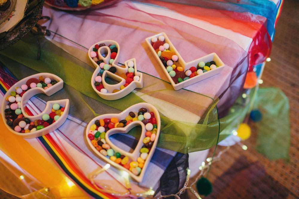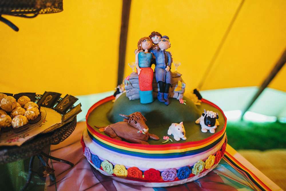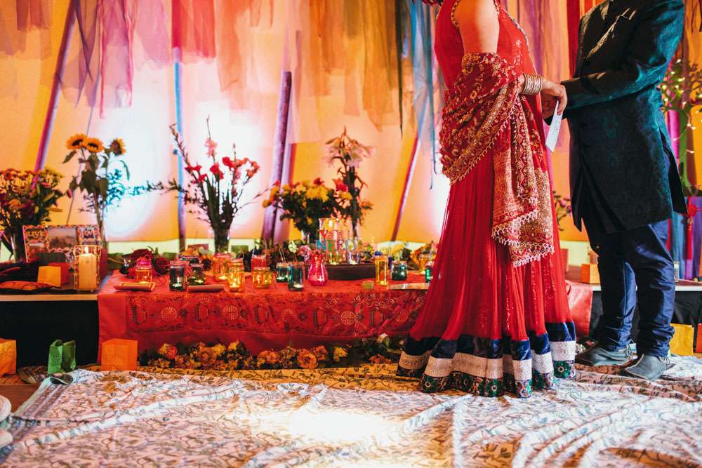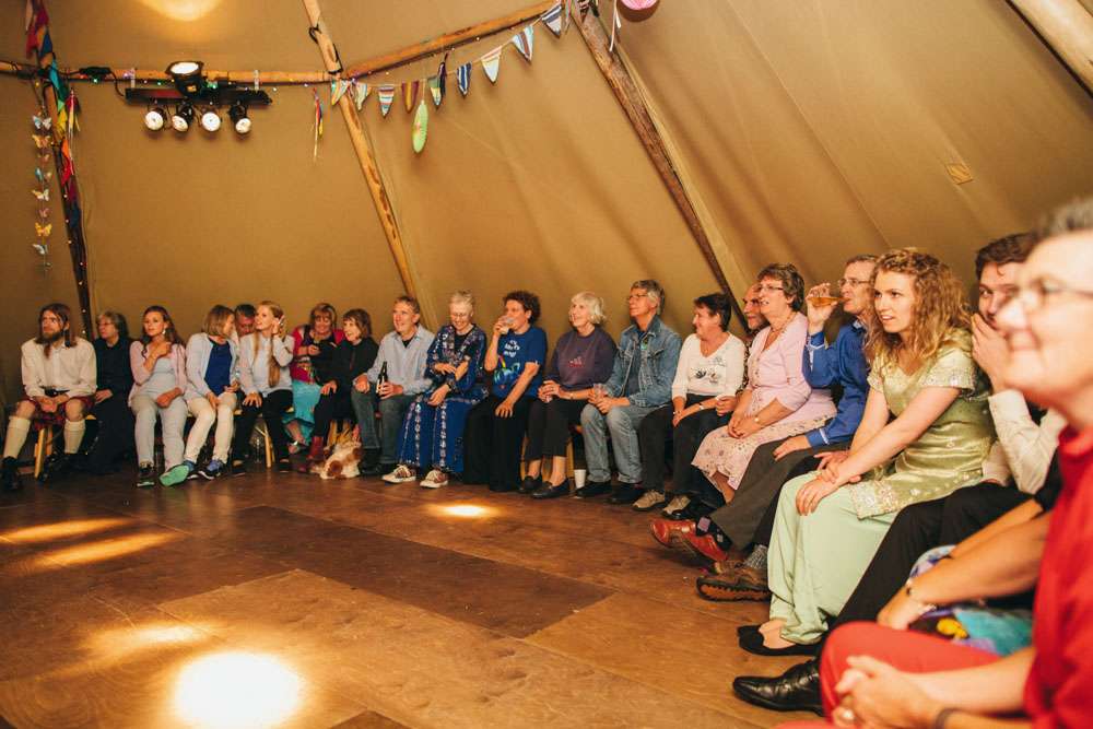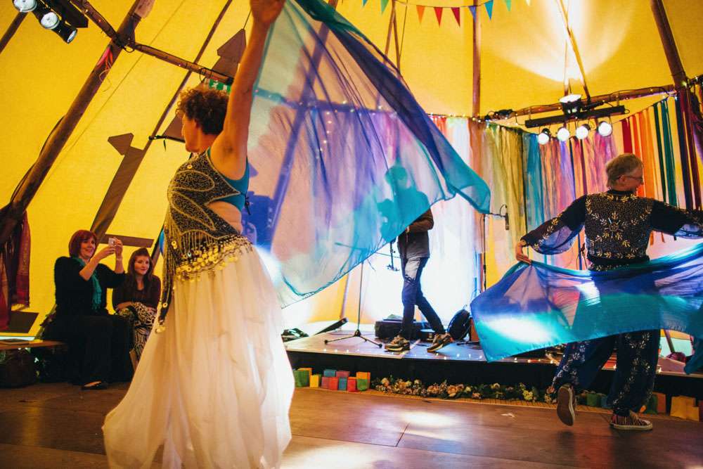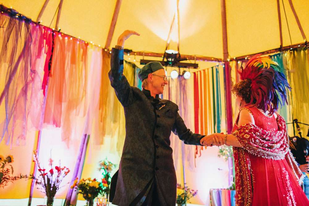 “In terms of décor, we had hand painted lots of jars and bottles and put these around with candles and flowers in”, they continued. “We had lots of rustic candle holders dotted around, as well as second-hand saris weaving around the tipi walls. We wanted to recreate an authentic ‘love is happening’ feel to both tipis. We are both nearly 60 years old and so we wanted to share the ‘all you need is love’ experience of the 60s and 70s with our guests, some of whom, were too young to have been there first time around!”