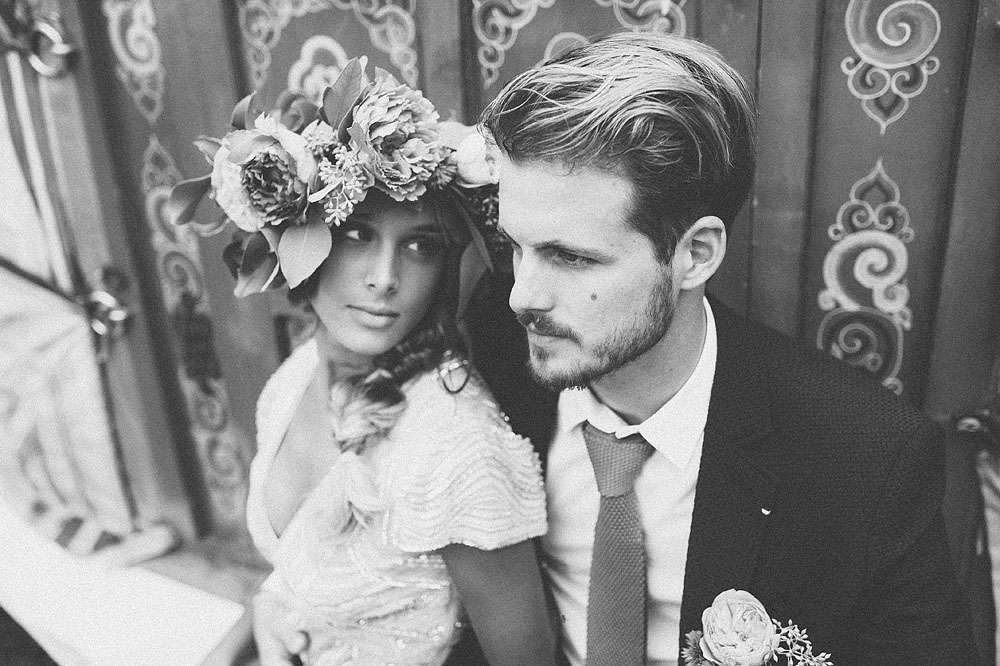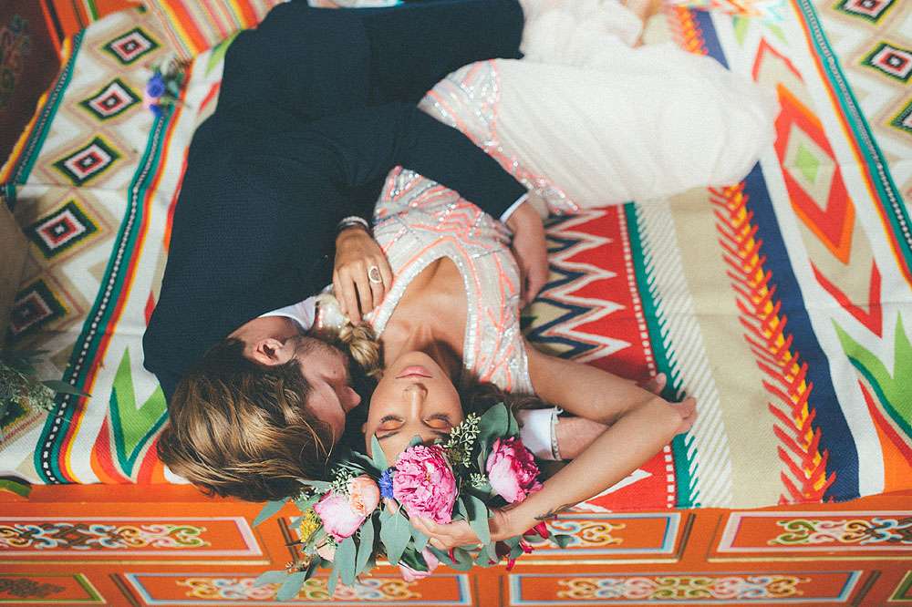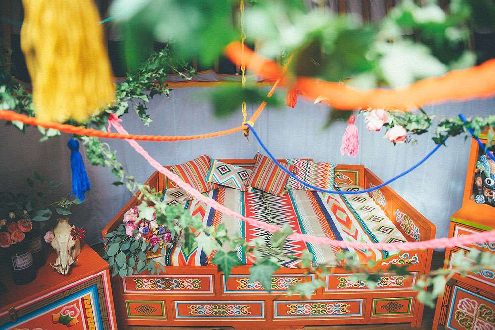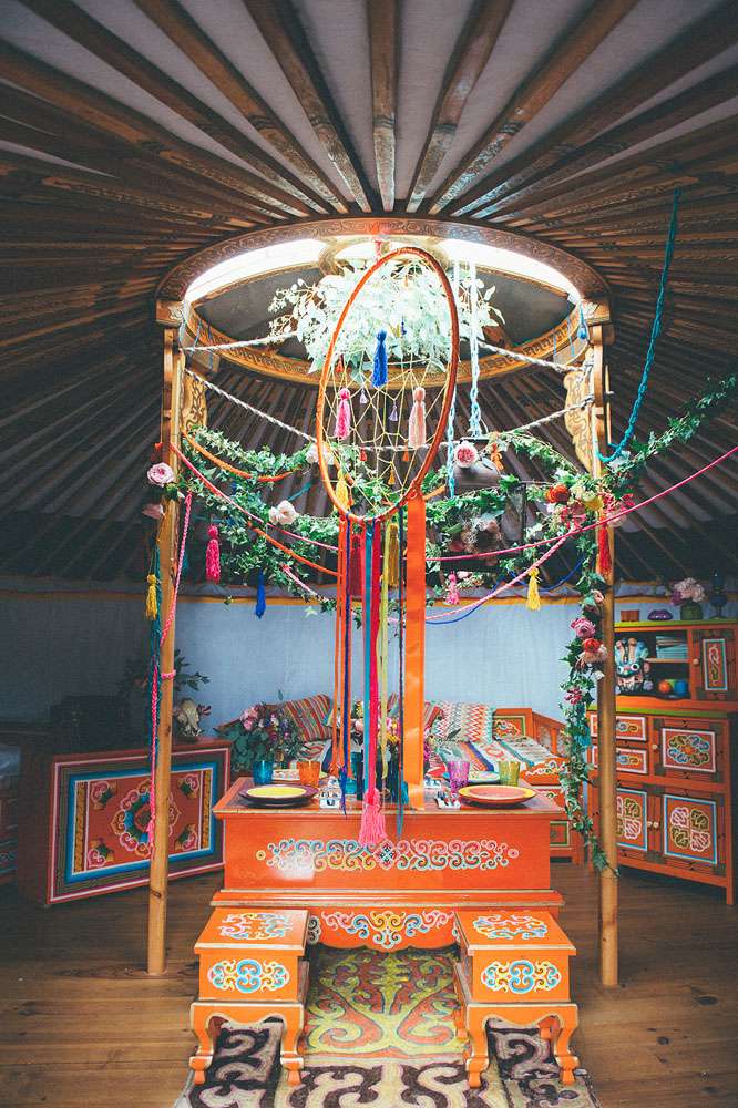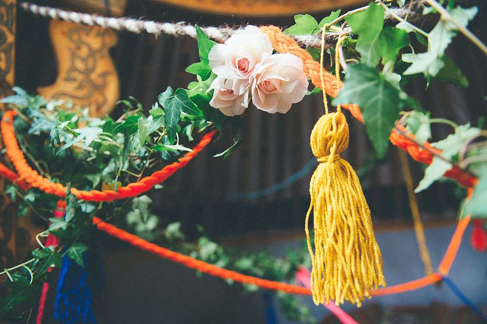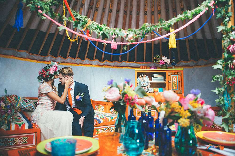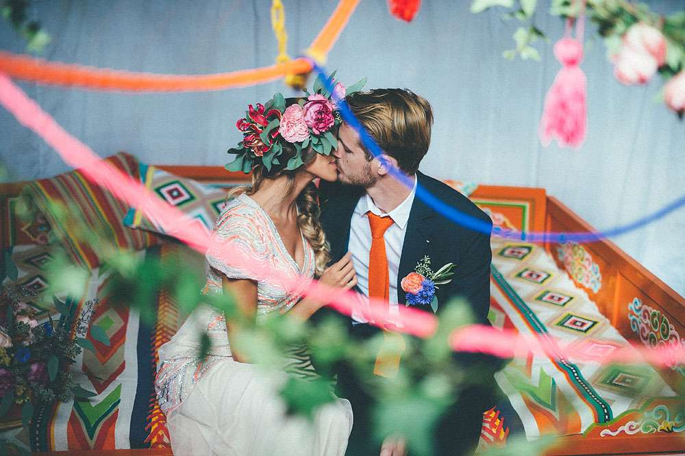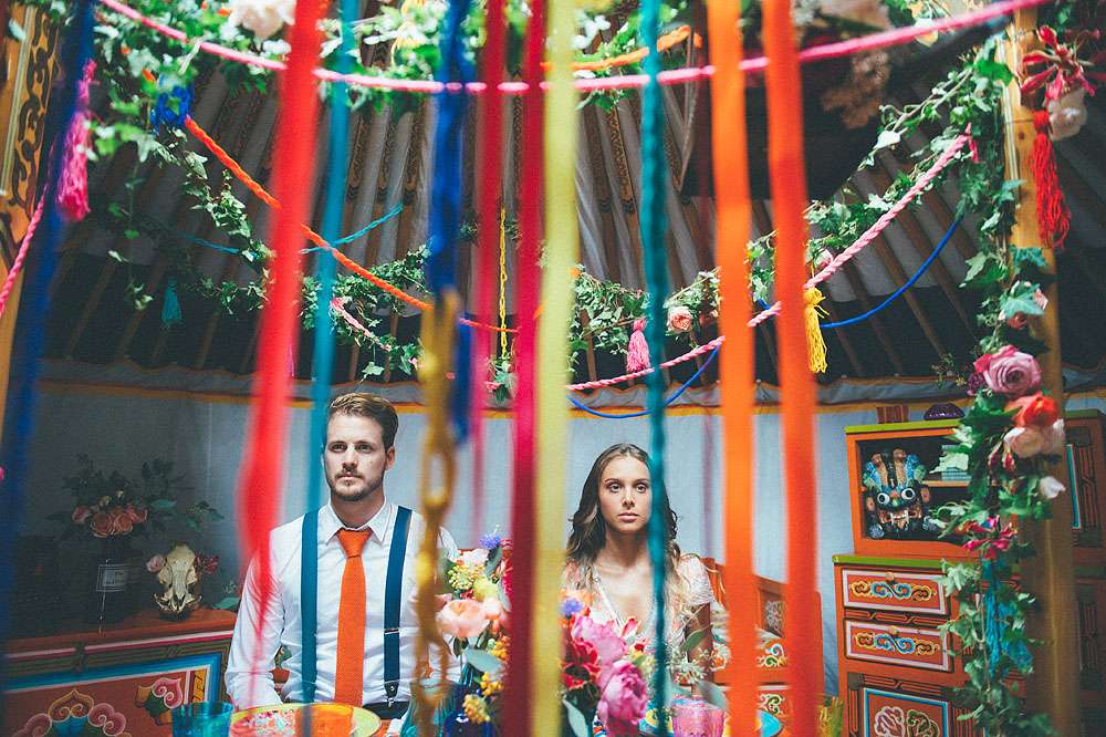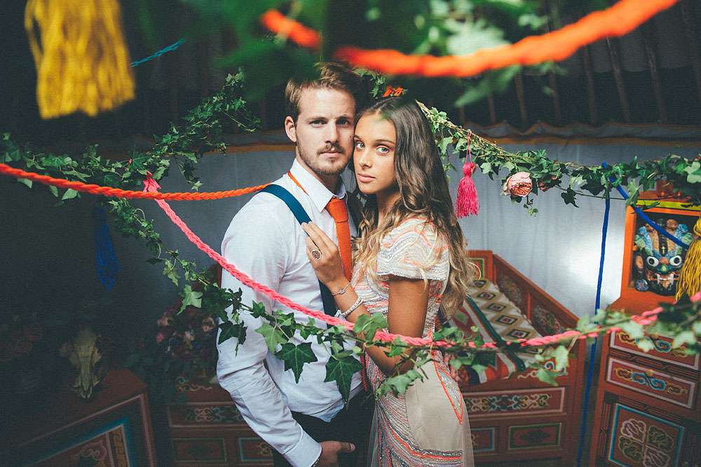 “The idea for this shoot was to create with a mix and match of all the things I love”, photographer Beatrice told me. “I wanted a colour explosion, an original venue, geometric patterns, a big flower crown, vintage items… But I still wanted this shoot to be modern. We were inspired by Hungarian Kalocsa style and Mexican folk to choose our patterns, flowers and colours. The shoot took place in Paluel, Normandy, France. This is the last place I would have thought for finding yurts! A place called Rando Yourte, near the beach.”