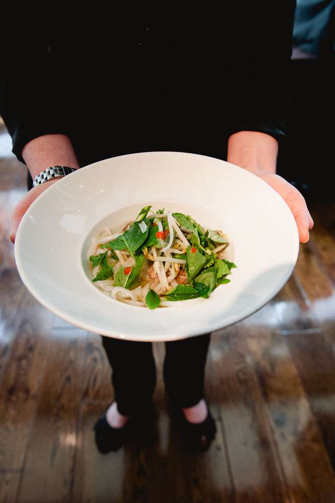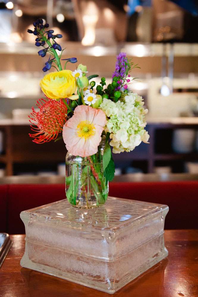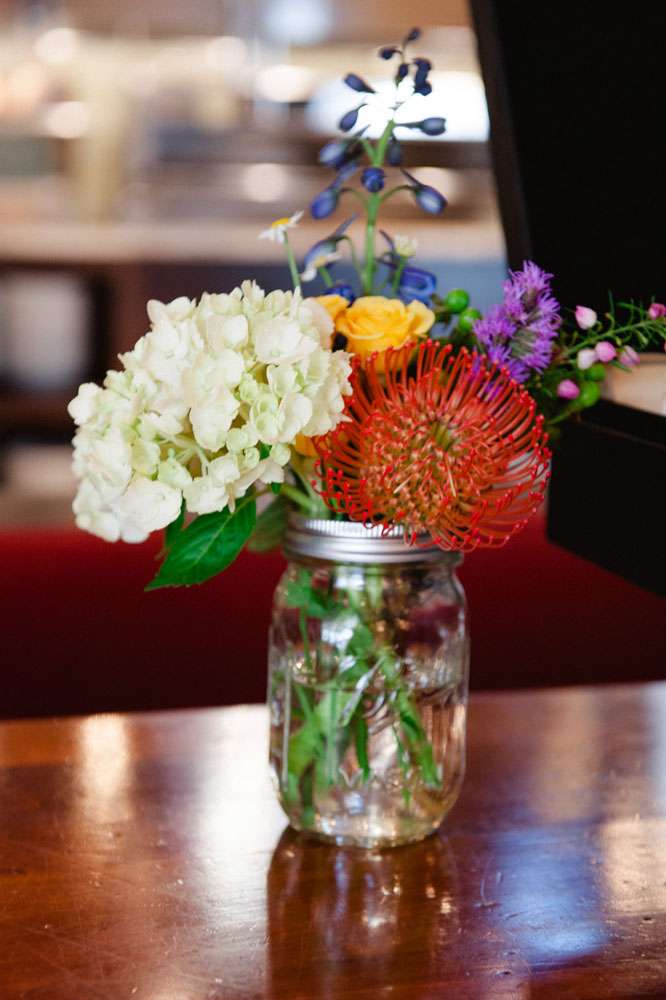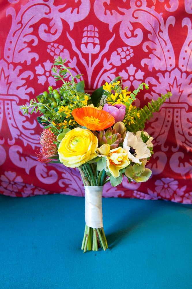 “We wanted the wedding to be bright and vibrant, aka as colorful as possible,” said the bride. “So our color scheme was so pinks, teals, blues, greens, purples, you name it! Good food and drinks was also a biggie for us. The food was inspired by all of our favorite dishes from our travels, while the craft beers (Dirty Bastard, Zombie Dust, Edmund Fitzgerald and Sofie) had a local Midwestern theme.”